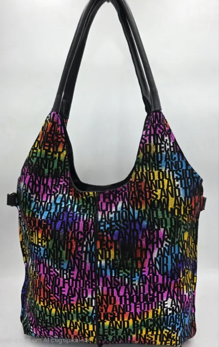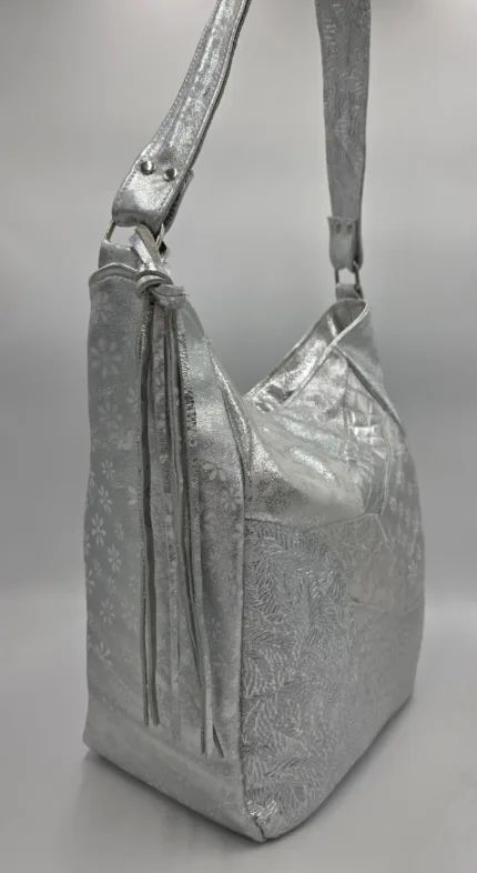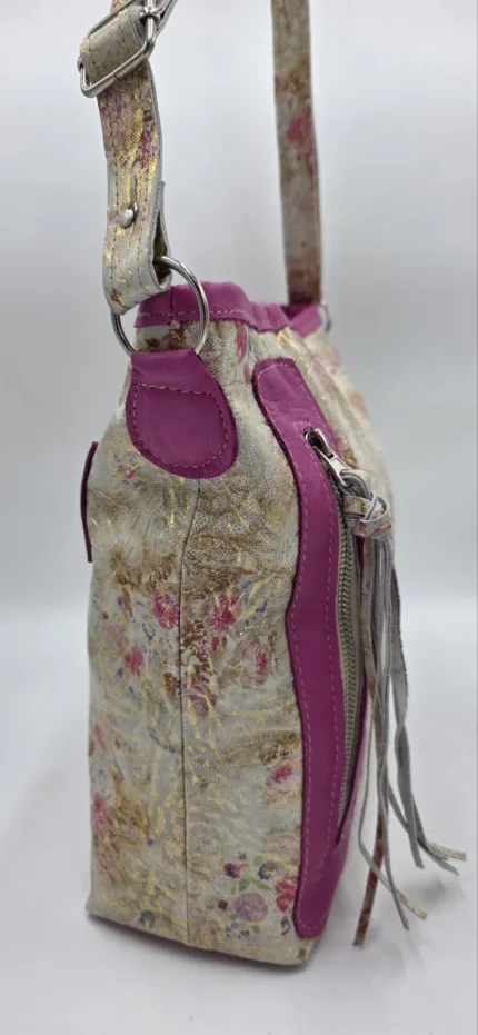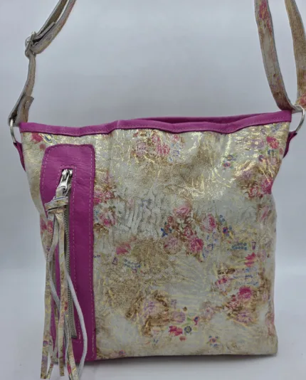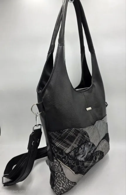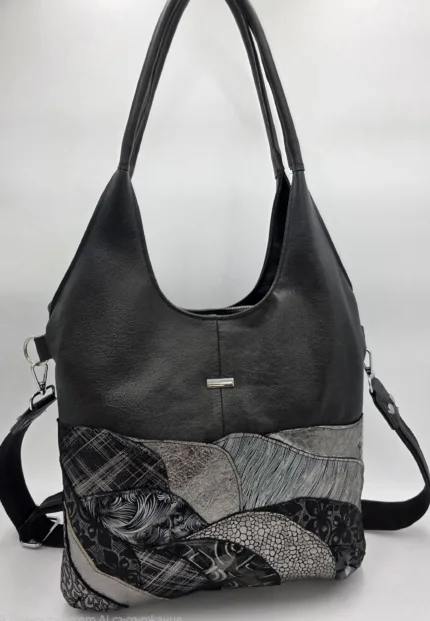 Чанта от естествена кожа в графит и черно с флорални мотиви