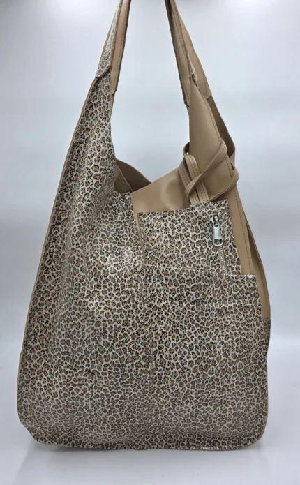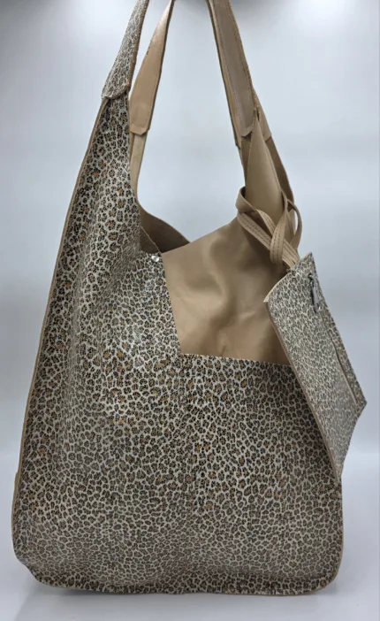 Чанта от естествена кожа в бежово с леопардов принт