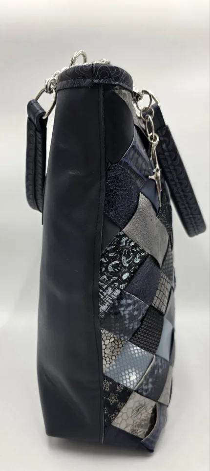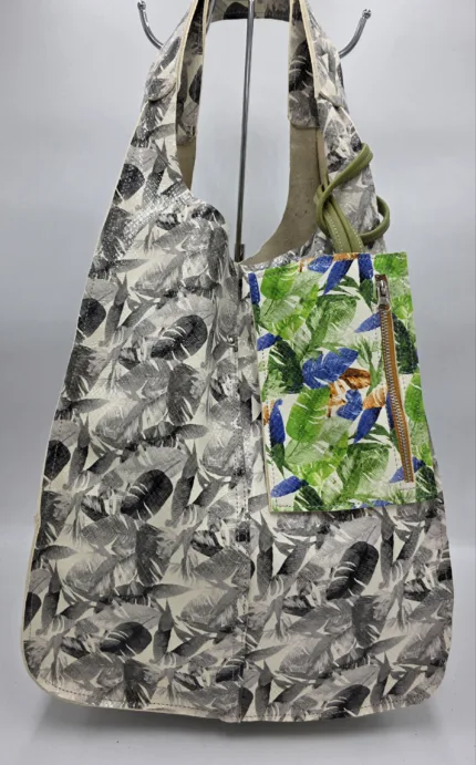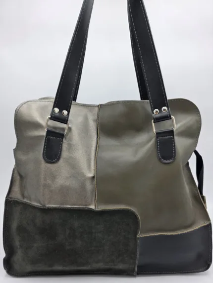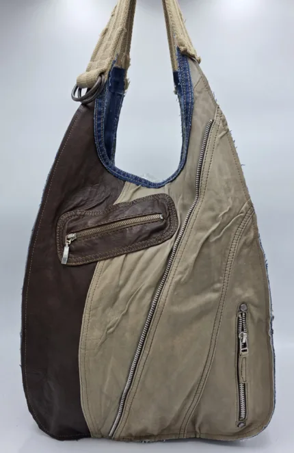 Уникална голяма чанта от естествена кожа ръчна изработка, тип торба от рециклирани материали естествена кожа и деним,без закопчаване, множество удобни