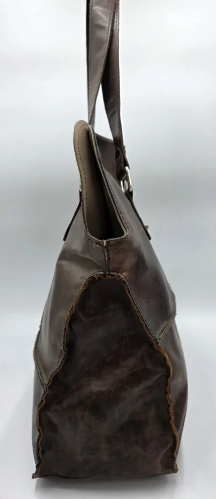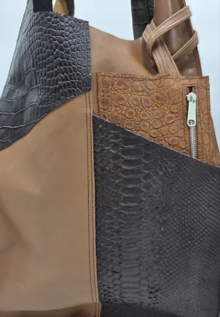 Уникална чанта от естествена кожа,тип торба. Ръчна изработка, без хастар, две дръжки 55см,външен джоб, допълнително портмоне с цип,вътрешен джоб с