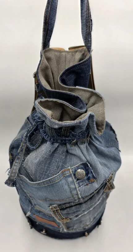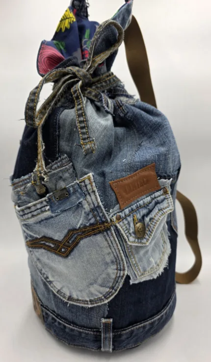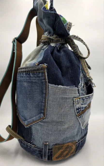Дизайнерска раница/тип мешка/изработена от естествени материали. Обло дъно 24см,височина 45см,стабилни презрамки от текстил, множество външни и вътрешни джобове,затваряне с връзка.