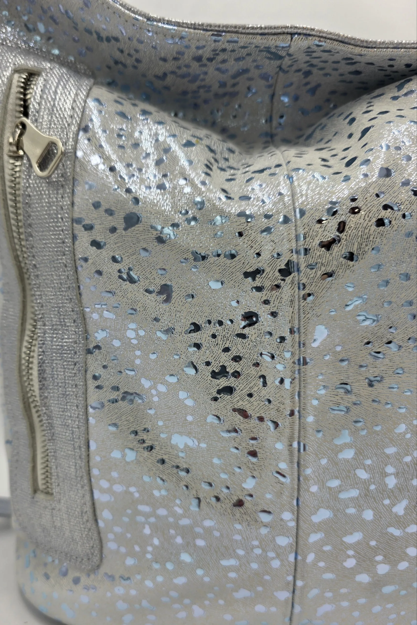 Чанта раница от естествена кожа в сребисто +св. синьо