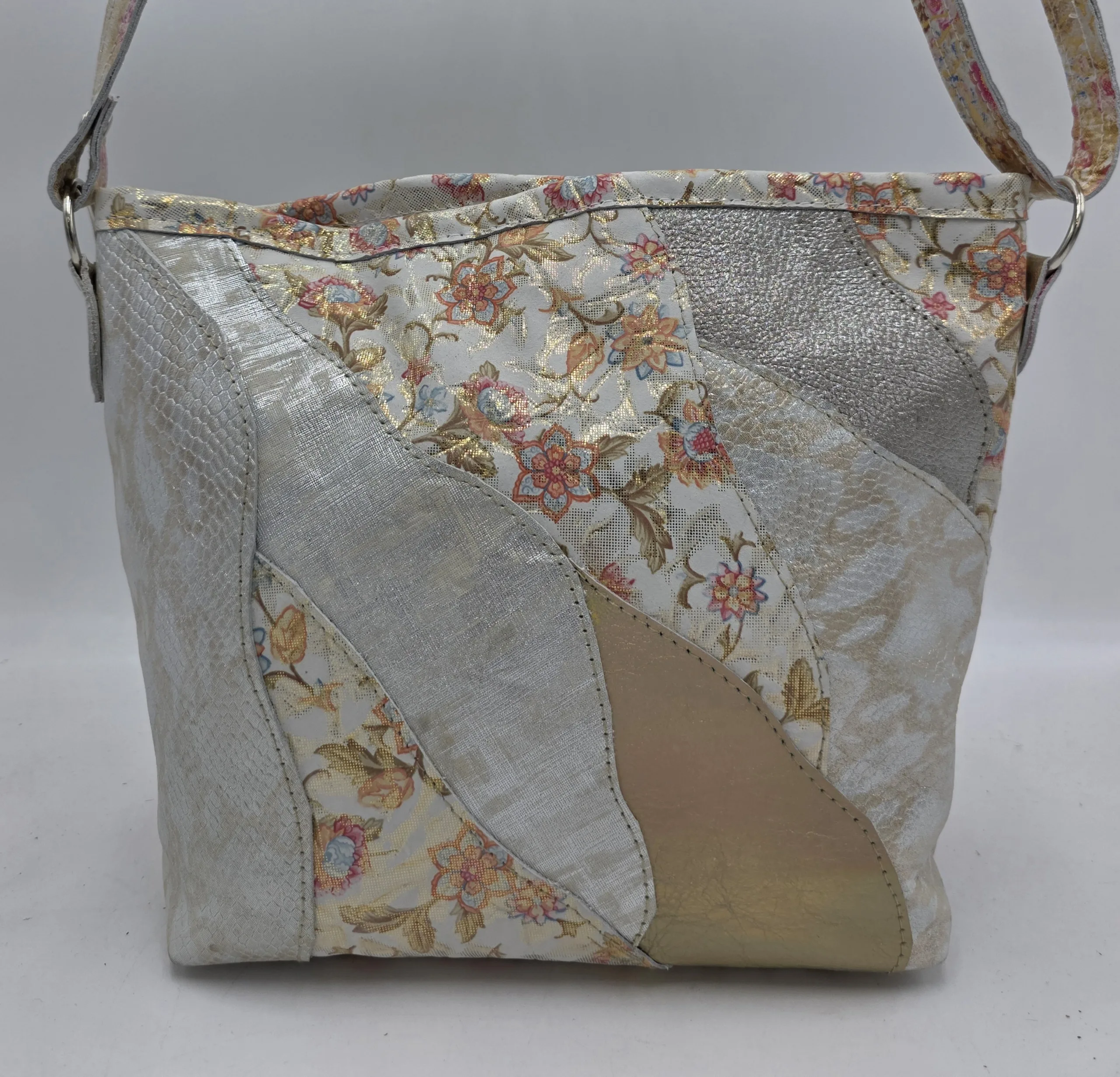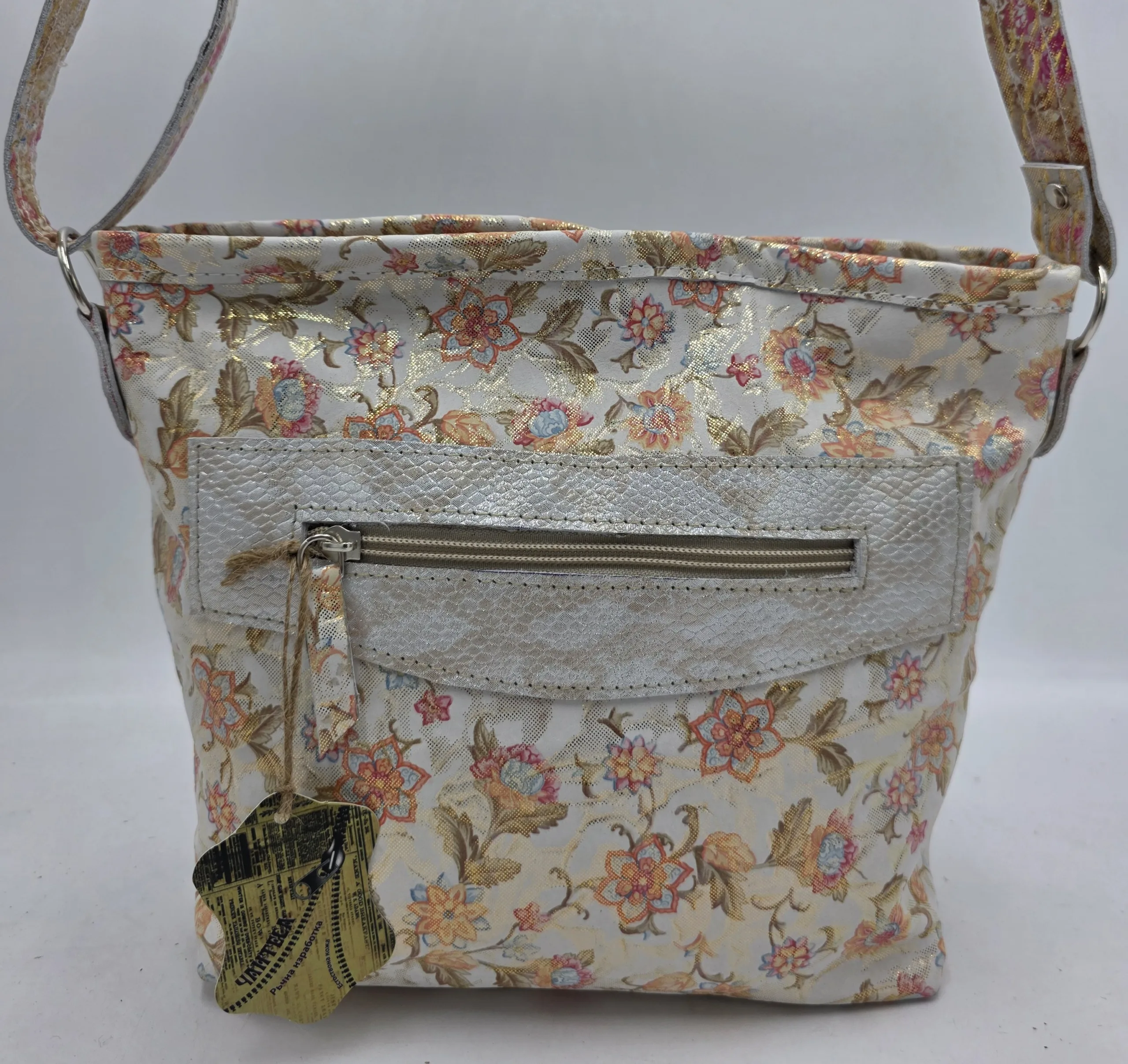 Чанта от естествена кожа за през рамо с дълга регулираща се дръжка 150см, закопчаване с цип, средна преграда с цип, вътрешен джоб с цип и допълнителни джоб за телефон, външен заден джоб с цип. Ширина 28см,височина 22см,дъно 24см/10см
