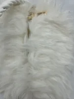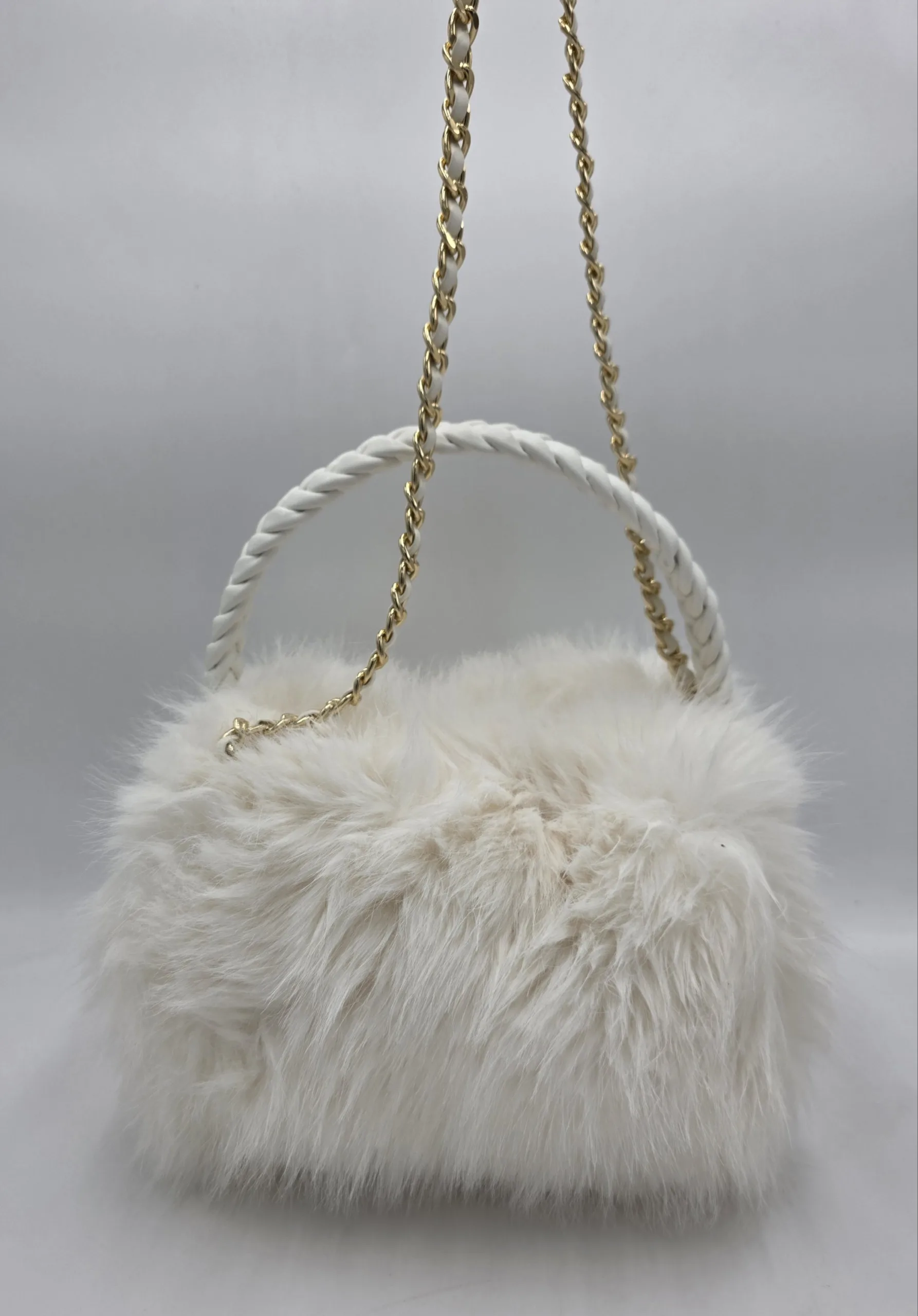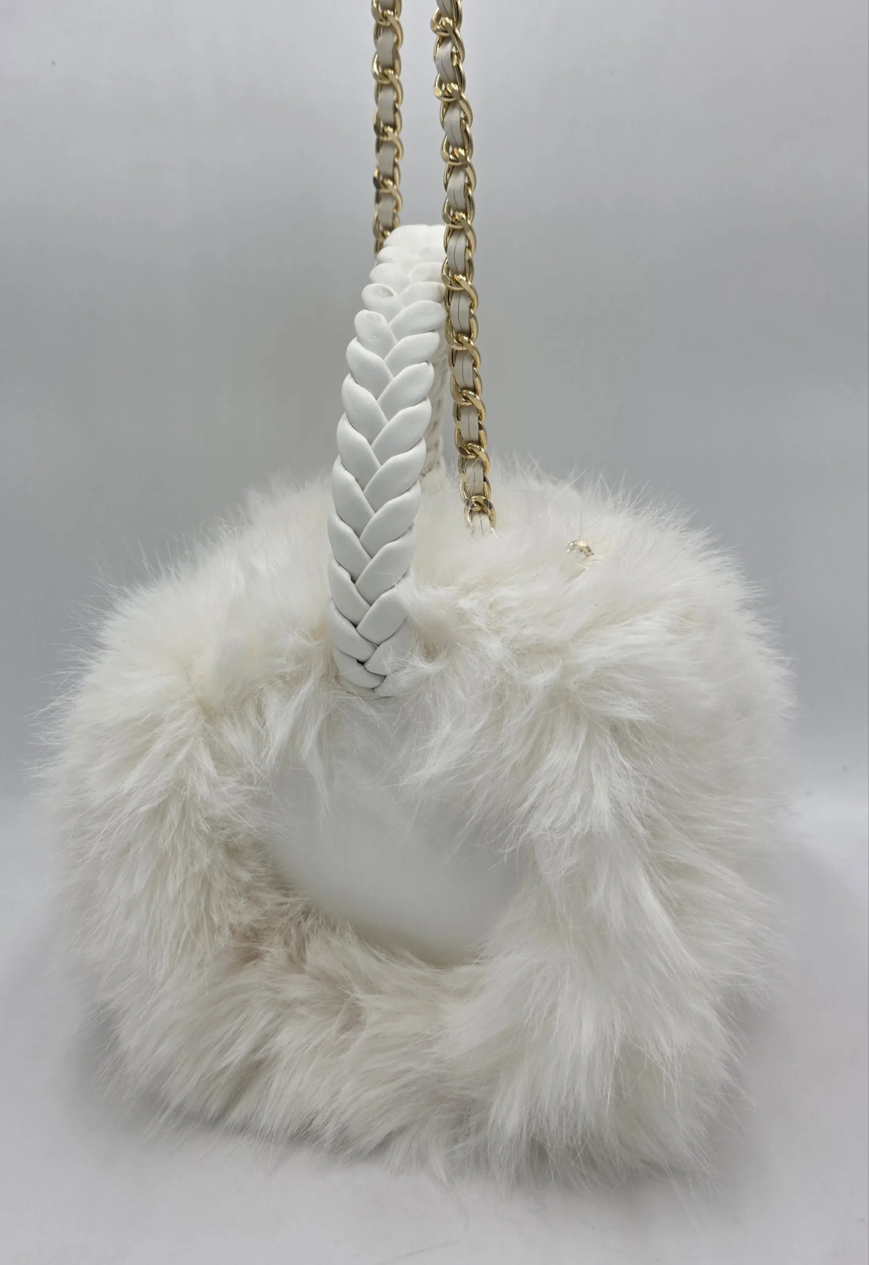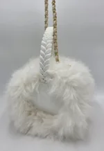 Пухена чанта от еко косъм с една дръжка 48см, дълга дръжка синджир,закопчаване с цип, вътрешен джоб с цип и допълнителен джоб за телефон, цилиндрична форма с овални страници, ширина 25см, височина 14см.