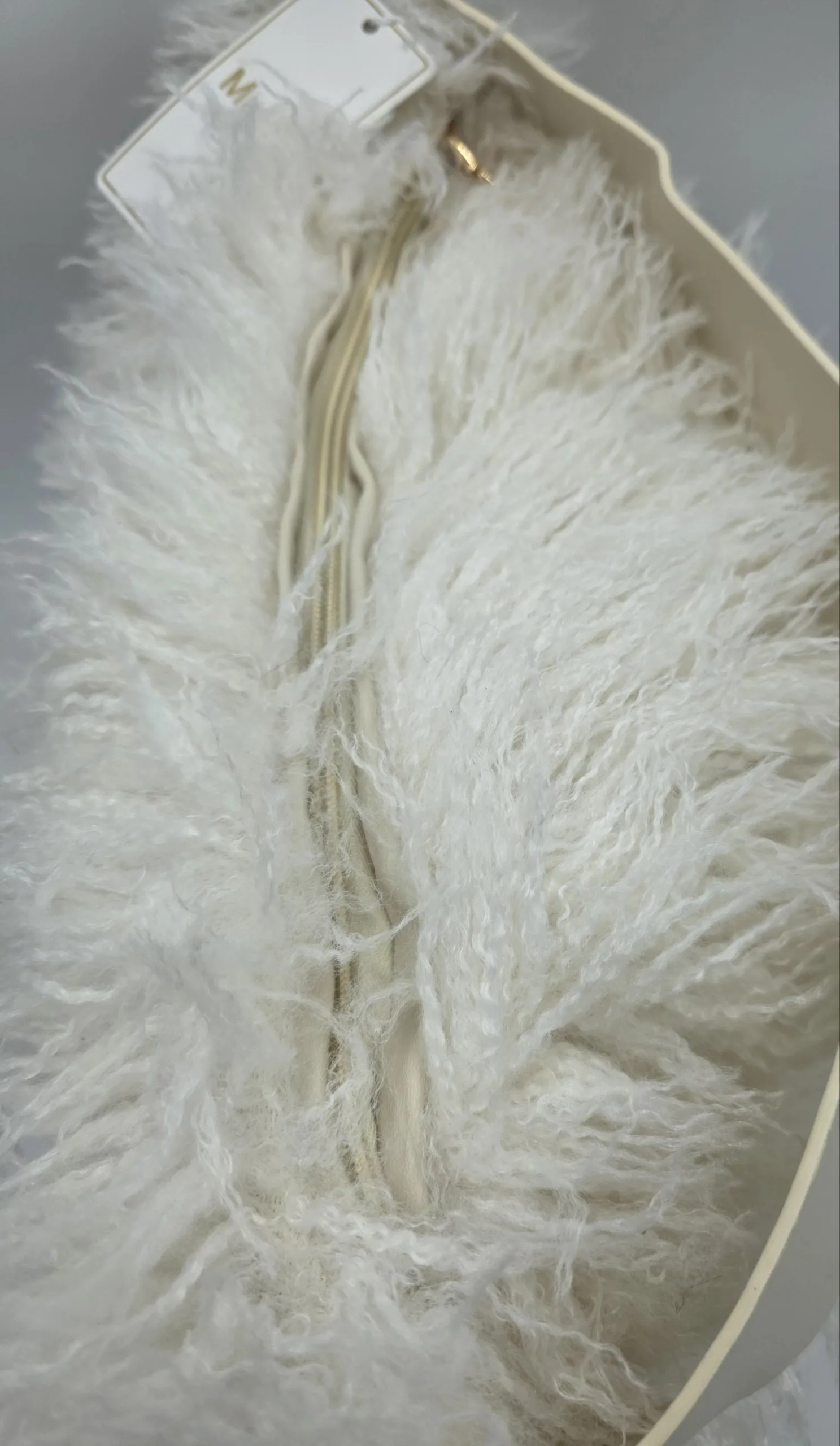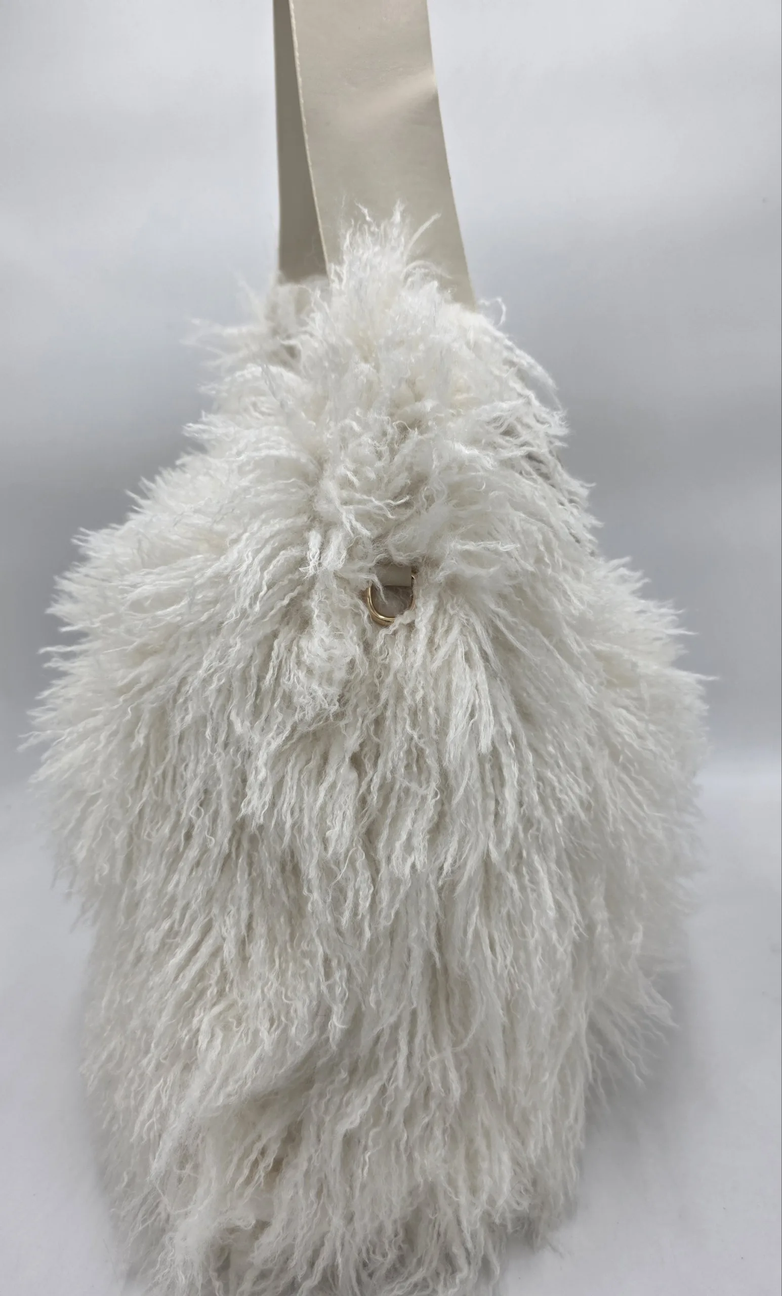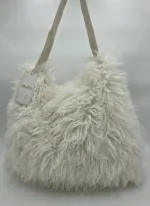 Пухена чанта от еко косъм, тип торба, закопчаване с цип, с една дръжка 46см, допълнителна дълга регулираща се дръжка 150см, вътрешен джоб с цип и допълнителен джоб за телефон, ширина 43см, височина 36см,дъно 42см/10см.