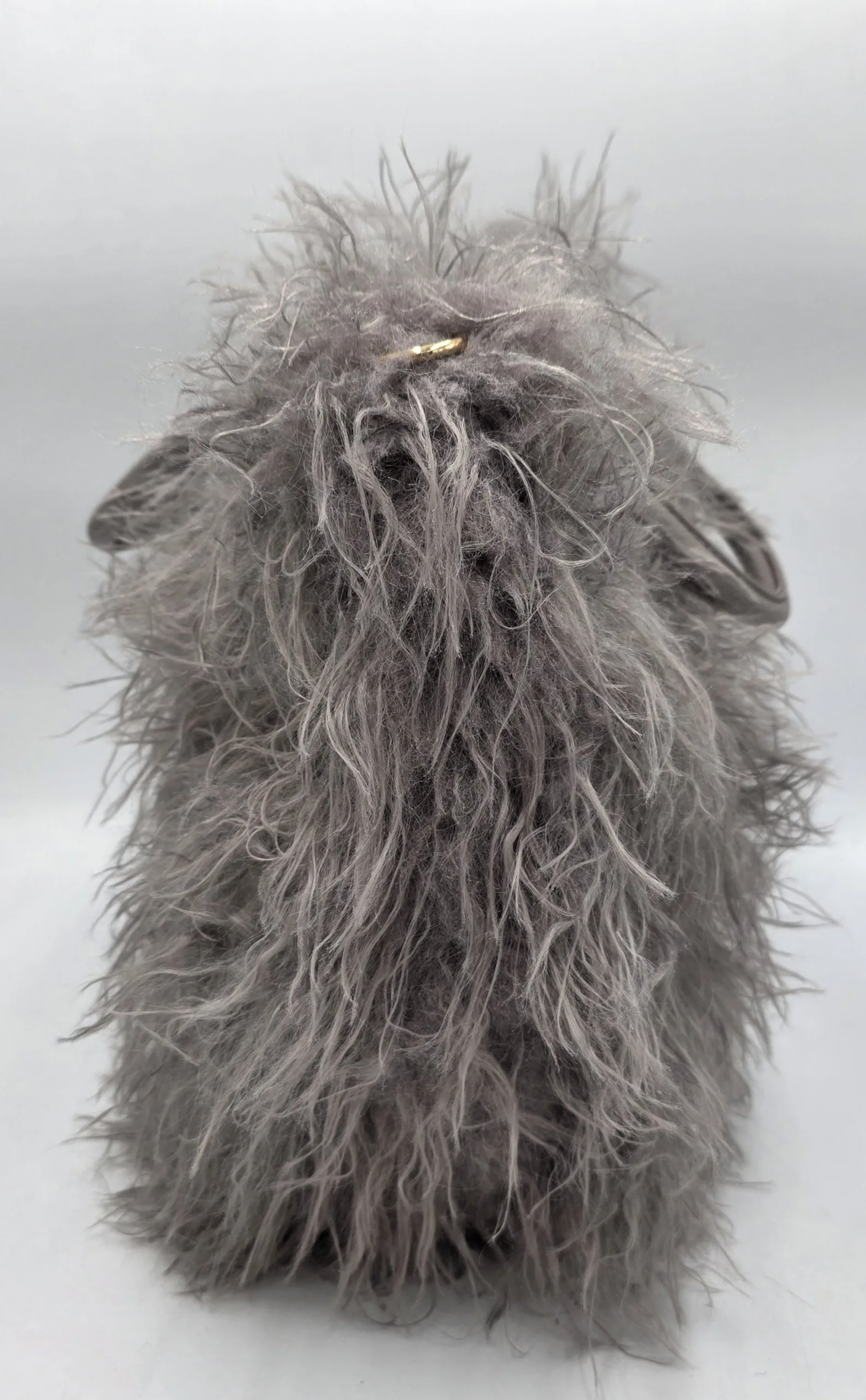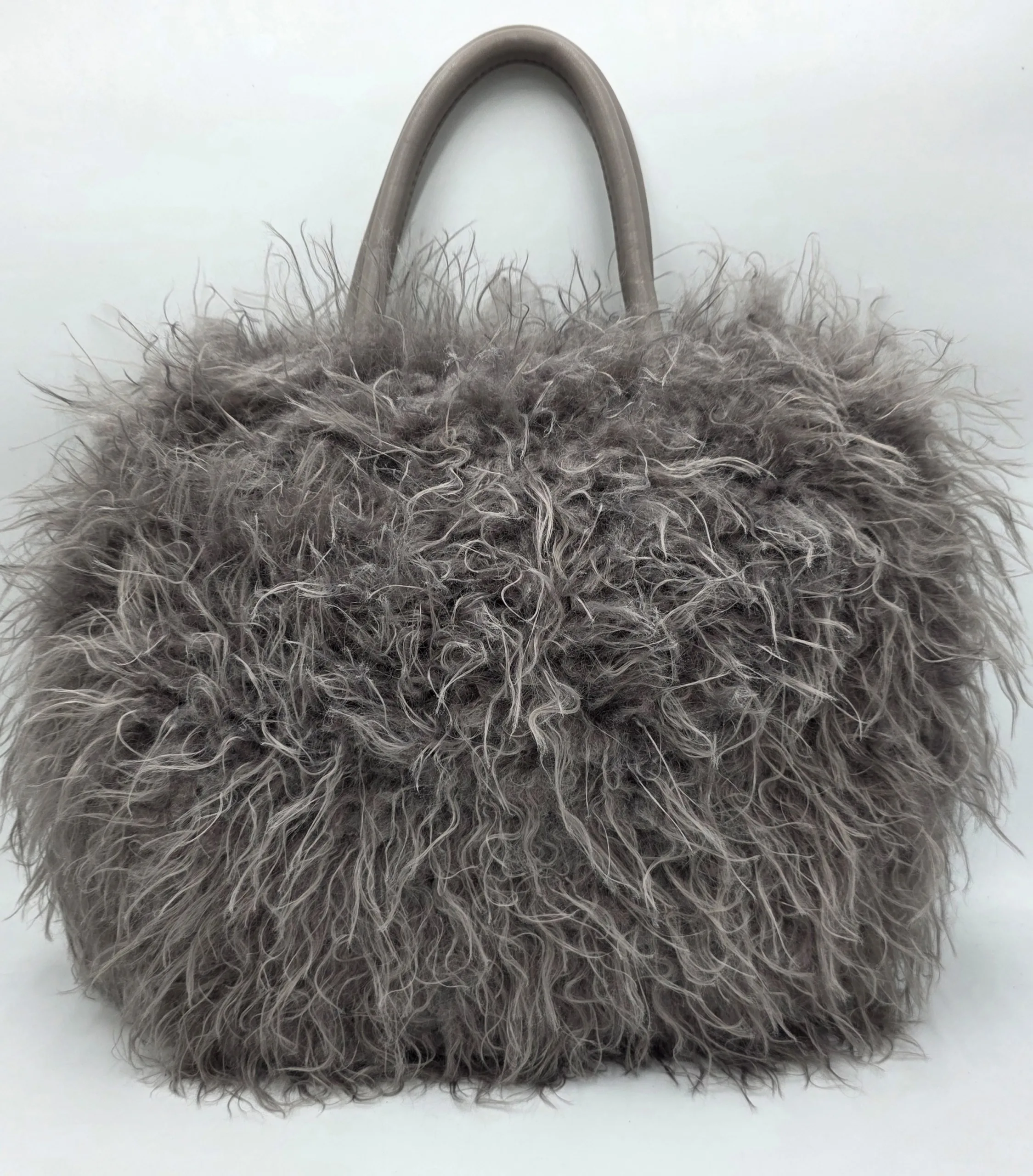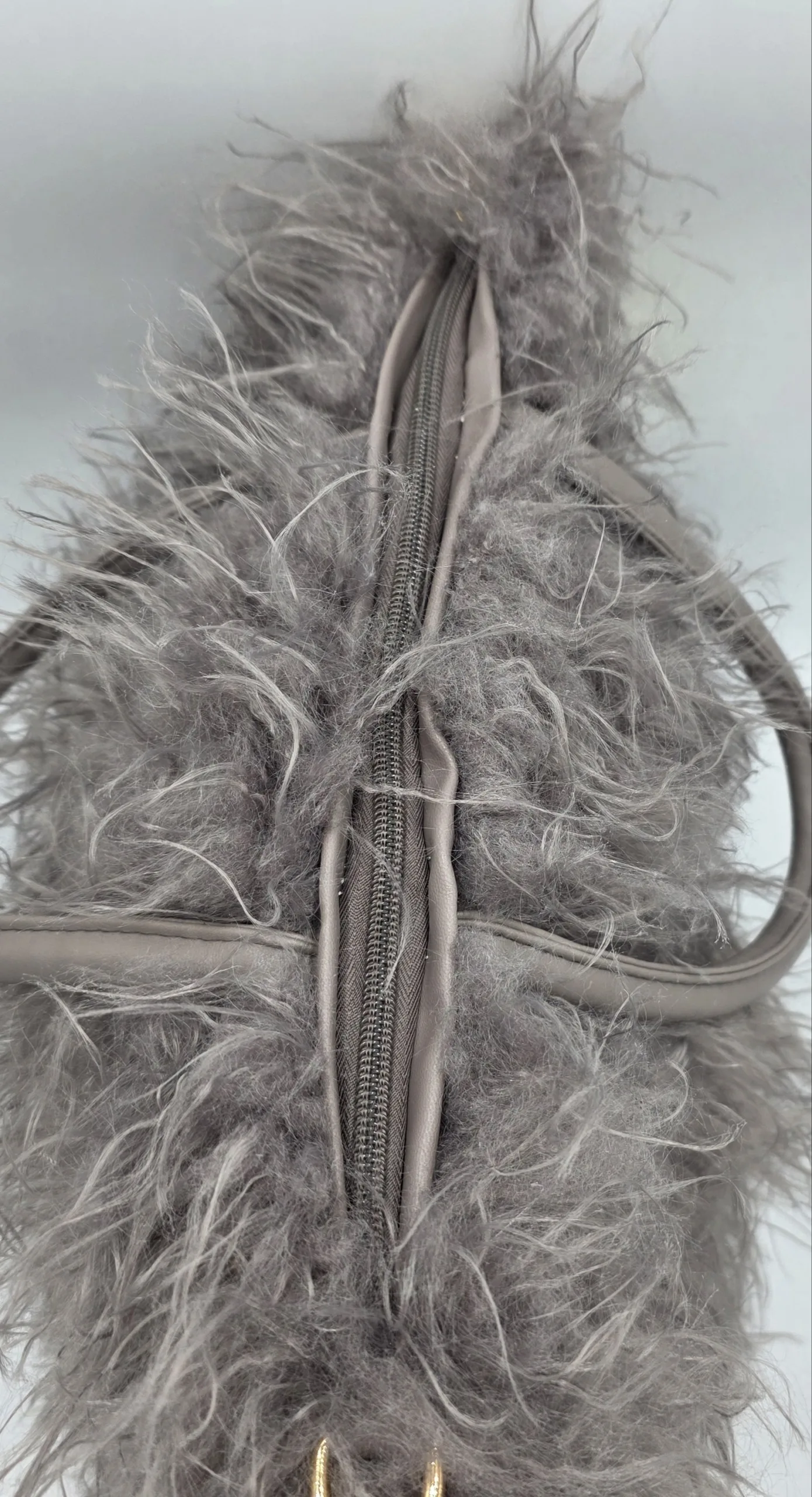 Пухена чанта от еко косъм с две къси дръжки 38см, дълга регулираща се дръжка 150см, закопчаване с цип, вътрешен джоб с цип и допълнителен джоб за телефон, ширина 44см, височина 30см, дъно 32см/11см.