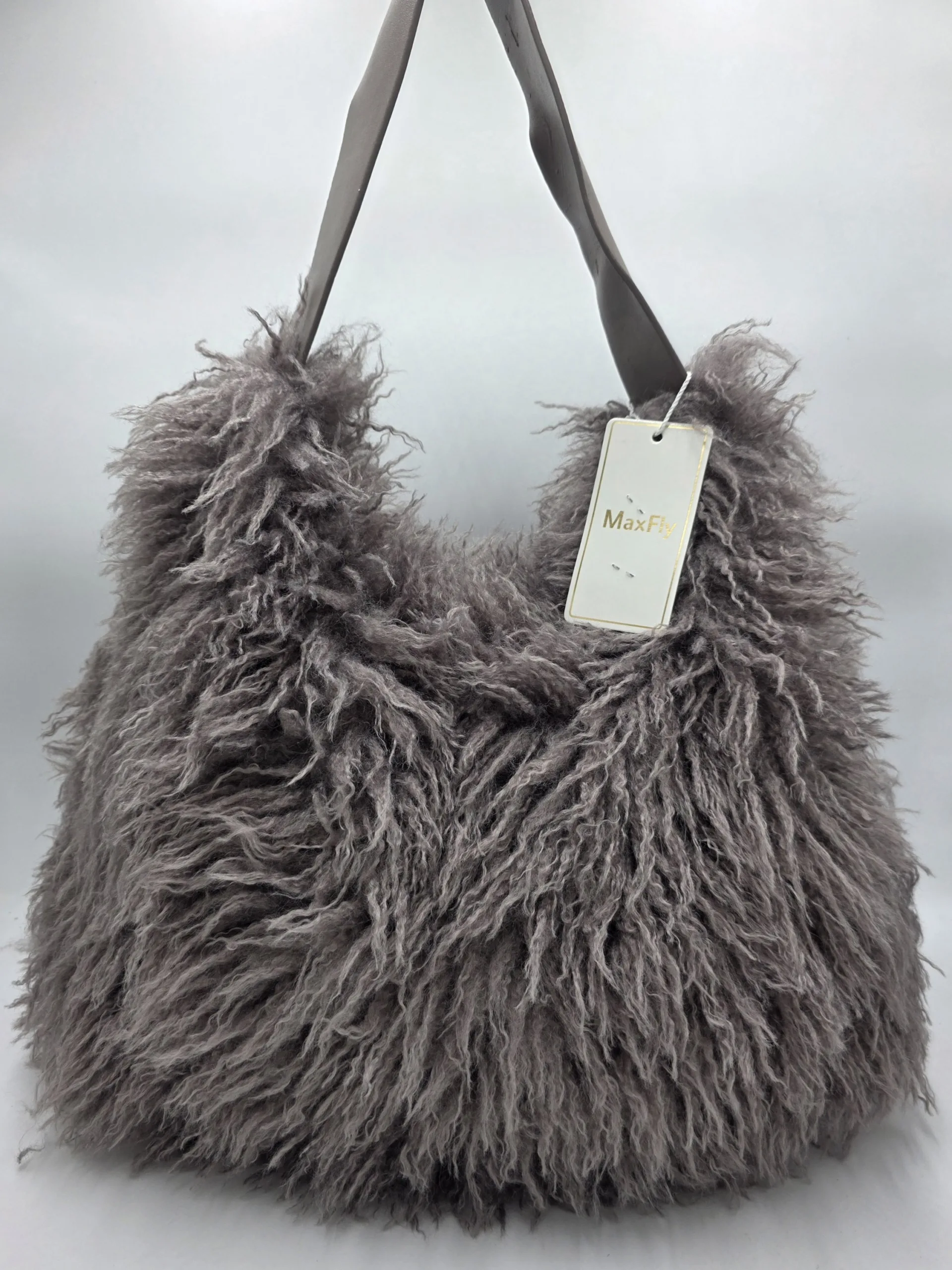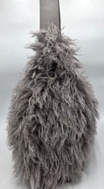 Пухена чанта от еко косъм, тип торба, закопчаване с цип, с една дръжка 46см, допълнителна дълга регулираща се дръжка 150см, вътрешен джоб с цип и допълнителен джоб за телефон, ширина 43см, височина 36см,дъно 42см/10см.
