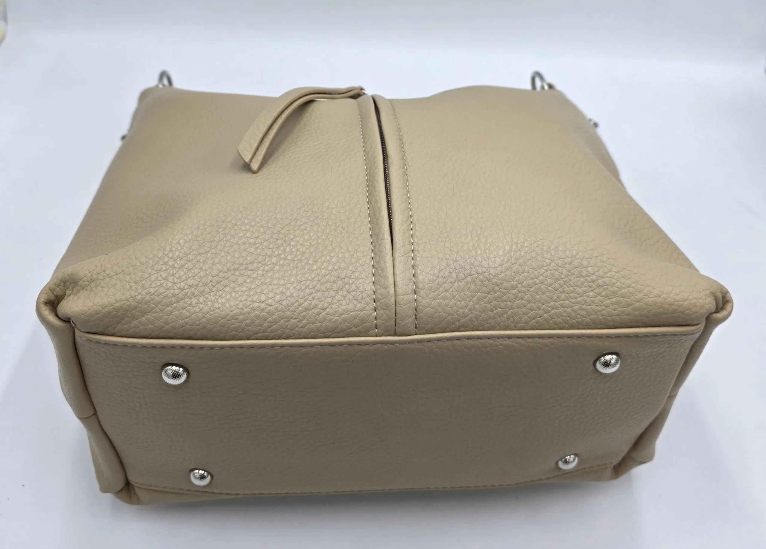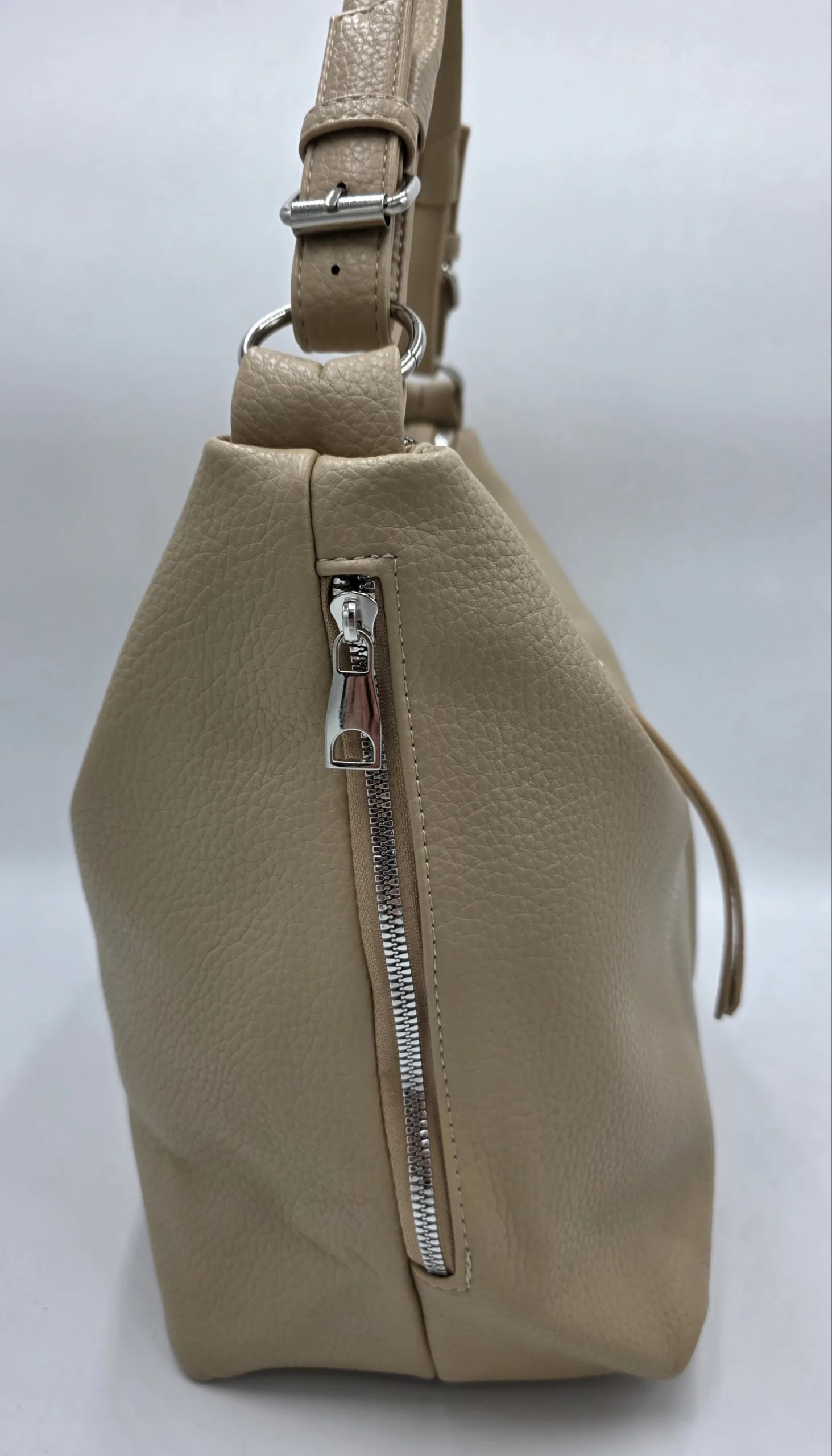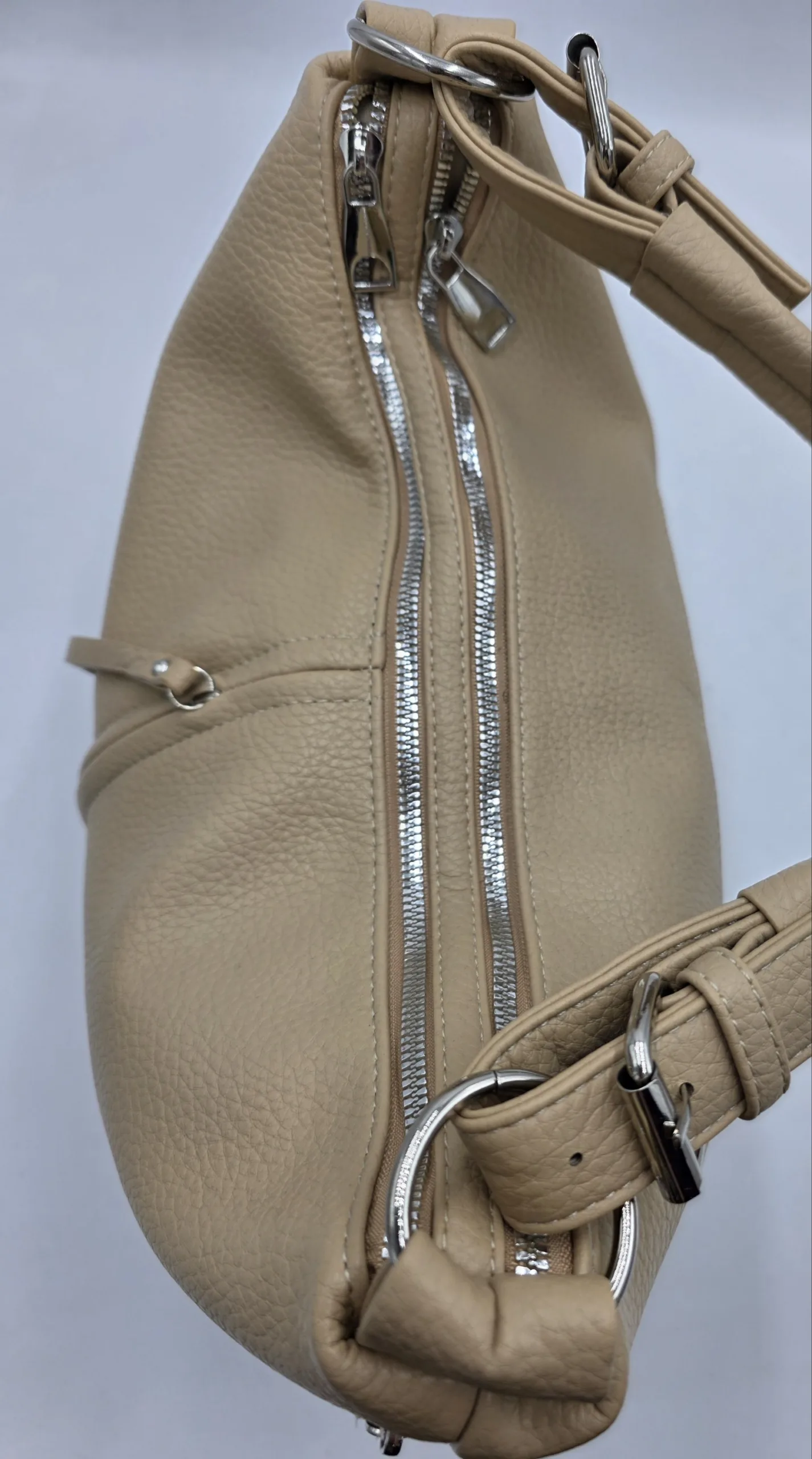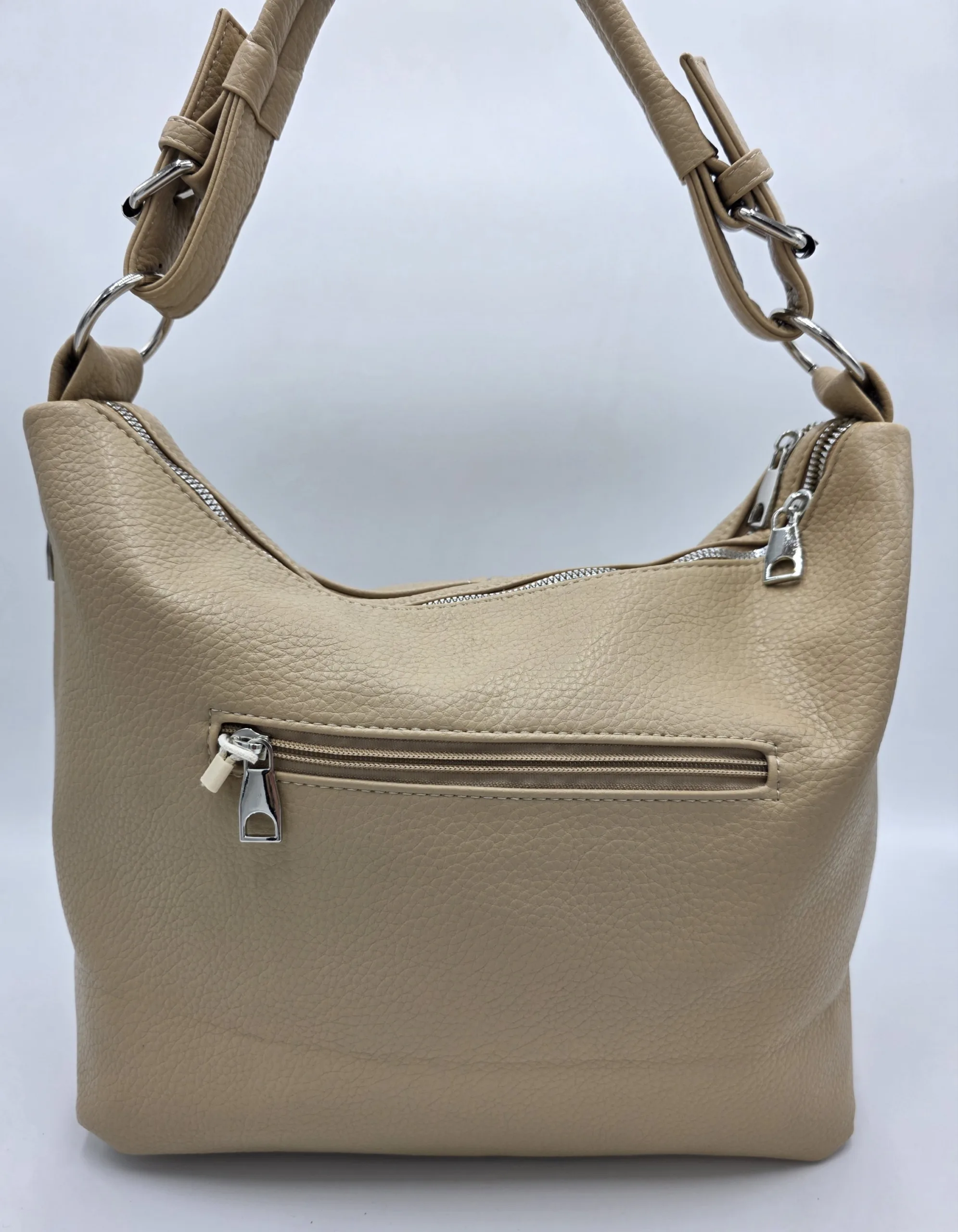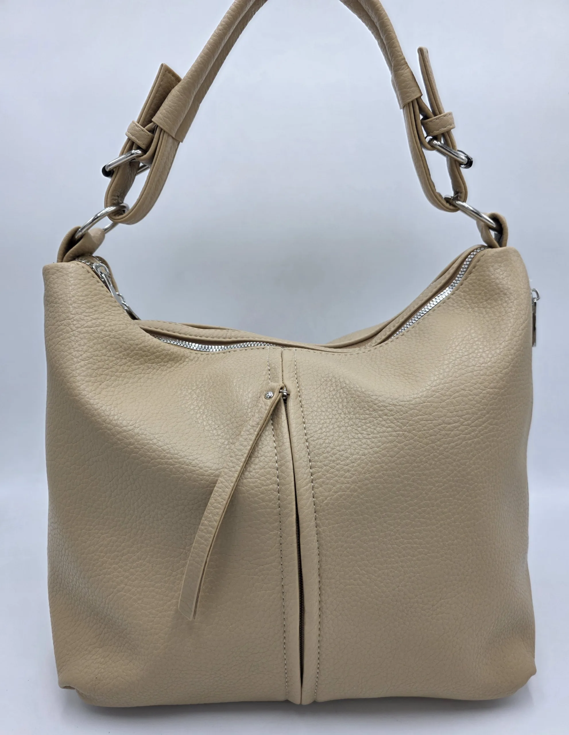 Ежедневна чанта от мека еко кожа с две отделни прегради затварящи се с цип, четири външни джоба с цип, вътрешен джоб с цип и допълнителни джобове за телефон, една дръжка 52см и допълнителна дълга регулираща се дръжка 150см. Ширина 43см, височина 28см,дъно 29см/15см