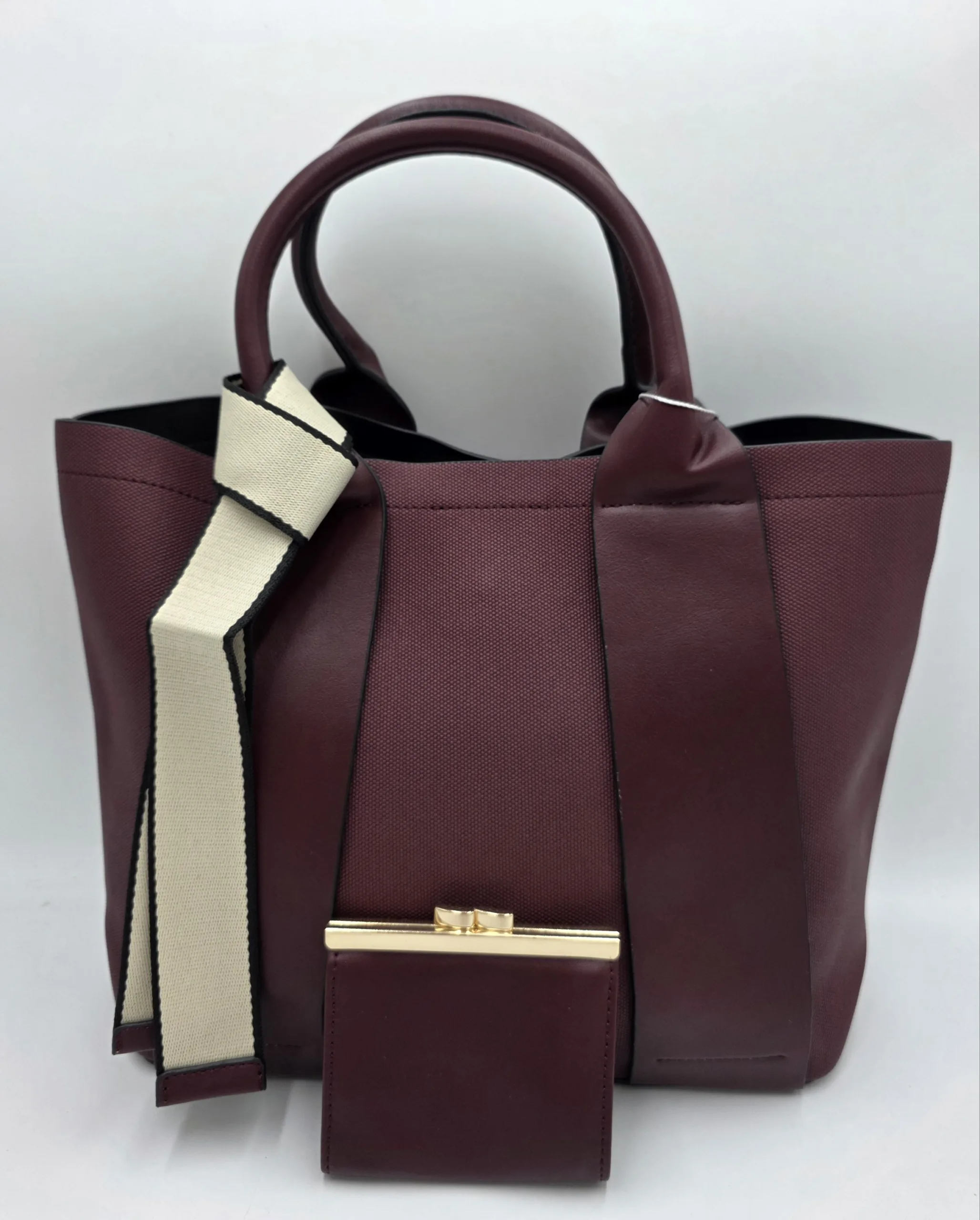 Елегантна чанта от еко кожа в комплект с портмоне с две къси дръжки 40см, три отделни прегради, едната с цип, две с магнит, дълга регулираща се дръжка 150см см,в преградата с цип има джоб с цип и допълнителни джобове за телефон. Ширина 42см,височина 27см, дъно 30см/14см.