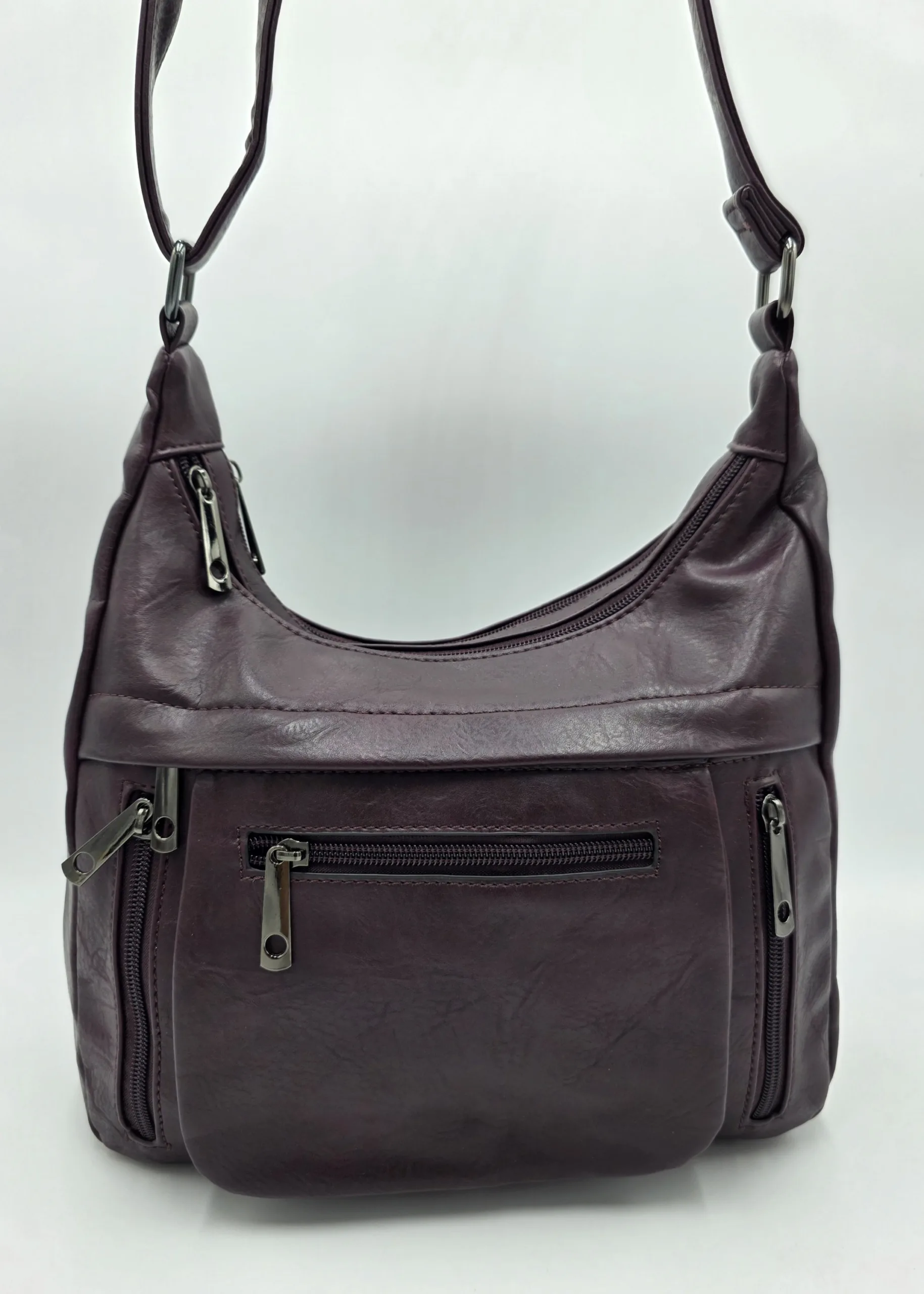 Чанта от еко кожа с две отделни прегради затварящи се с цип, 4 предни джоба с цип, заден външен джоб с цип, вътрешен джоб с и допълнителни джобове за телефон, дълга регулираща се дръжка 150см. Ширина 33см,височина 23см,дъно 28см/10см.