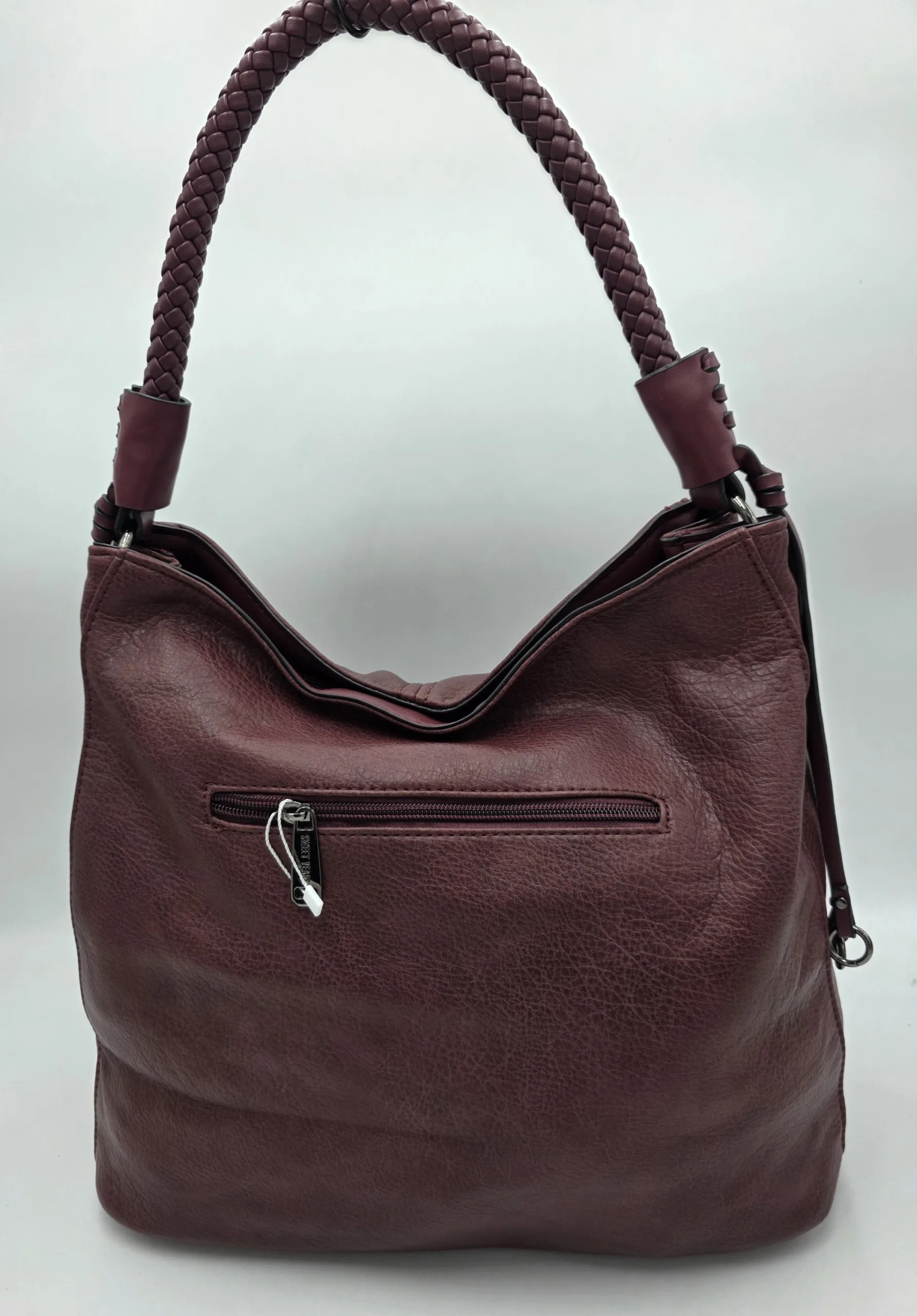Чанта от еко кожа с една дръжка 50см, допълнителна дълга регулираща се дръжка 150см, заден външен джоб с цип, закопчаване с цип, вътре със средна преграда с цип, вътрешен джоб с цип и допълнителни джобове за телефон. Ширина 43см, височина 32см,овално дъно 35см/16см.