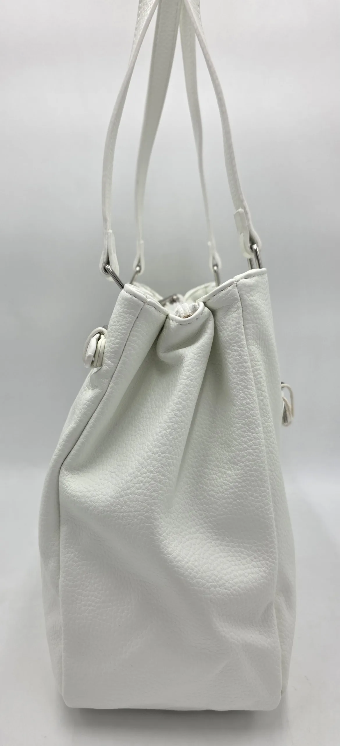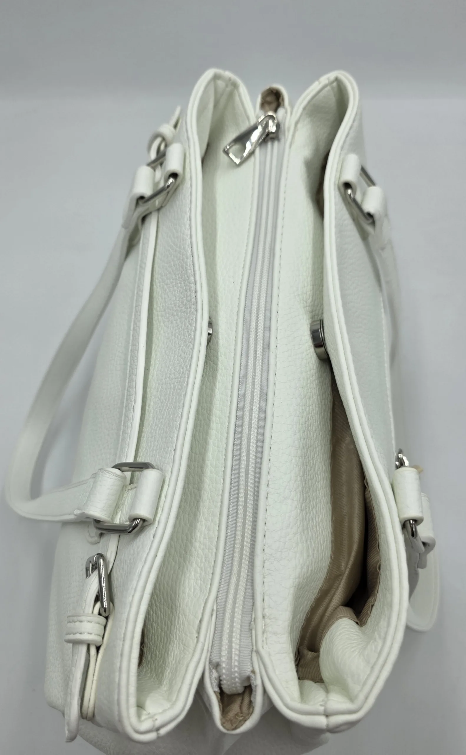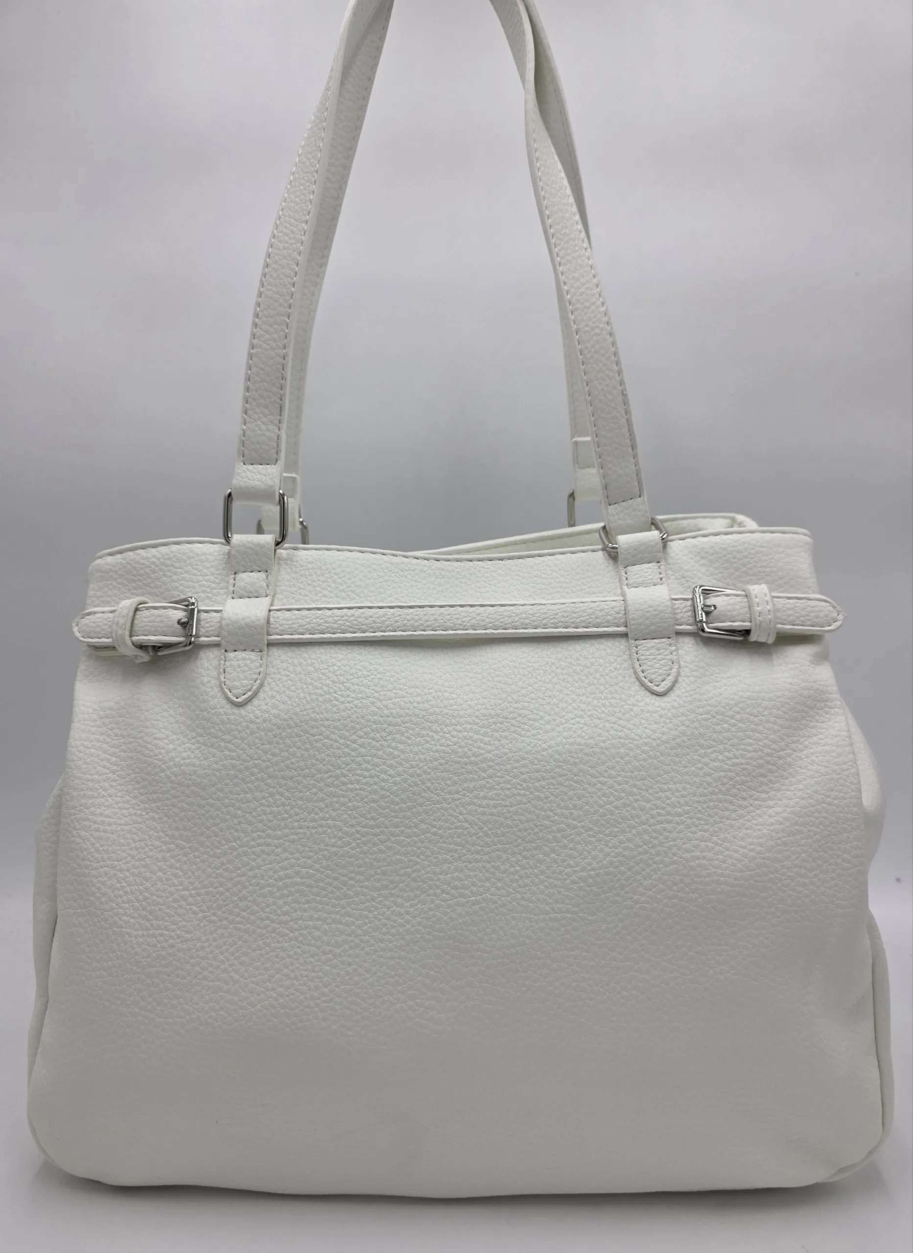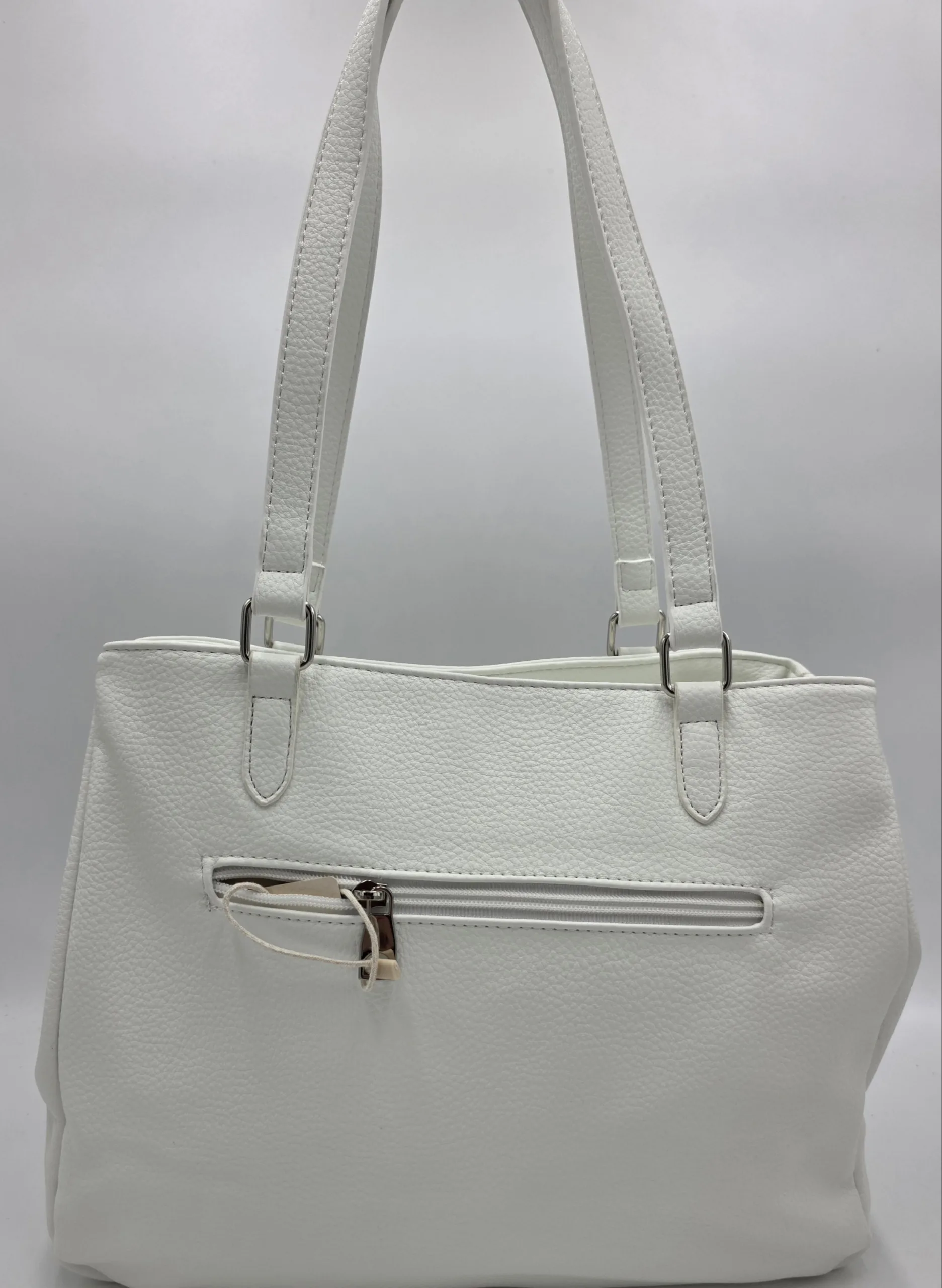 Чанта от еко кожа с две дръжки 60см,външен джоб с цип, три отделни прегради, едната с цип, две с магнит,вътрешен джоб с цип .Ширина 34см,височина 28см, дъно 32см/13см.