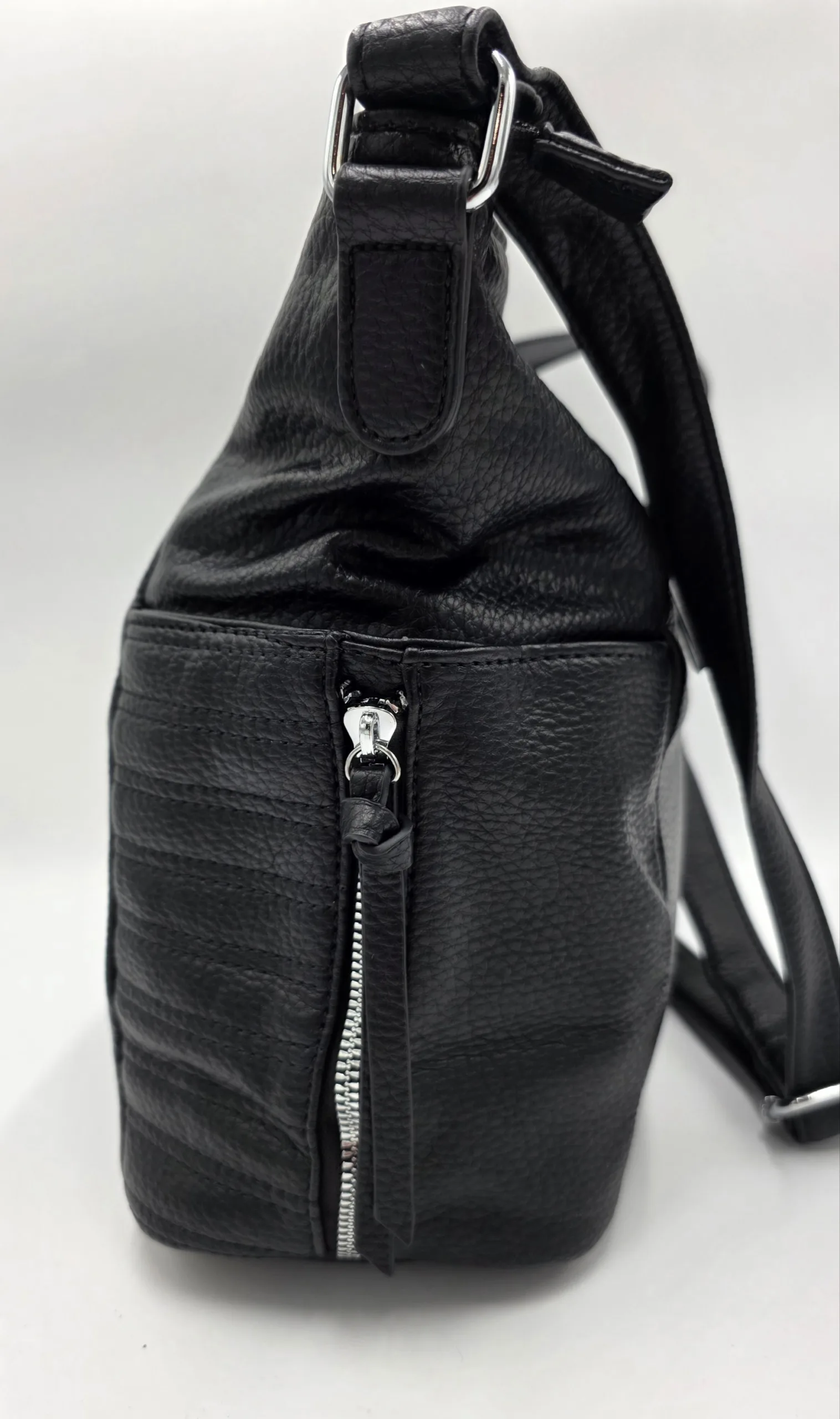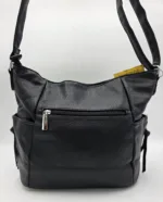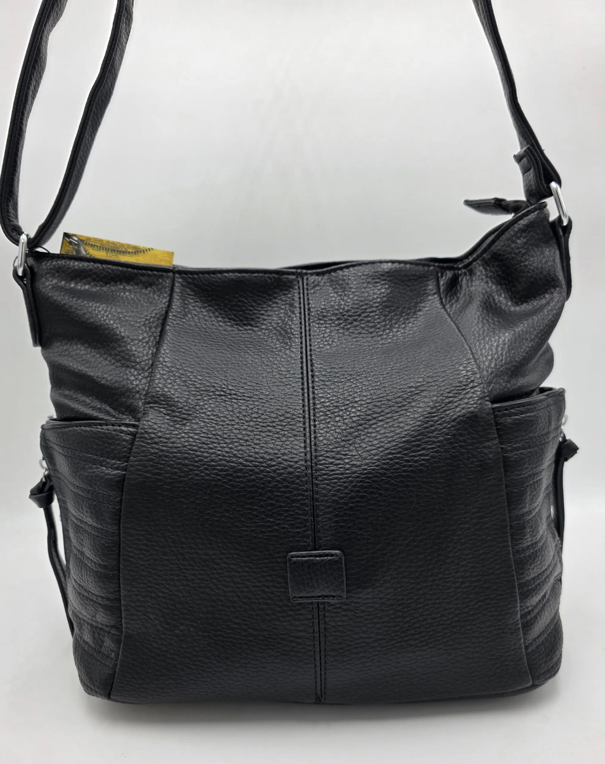 Чанта от еко кожа с външен заден джоб с цип, два странични джоба с магнит, закопчаване с цип, вътре със средна преграда с цип, джоб с цип и допълнителни джобове за телефон. Ширина 38см, височина 27см, дъно 30см/14см. Дълга регулираща се дръжка 150см.