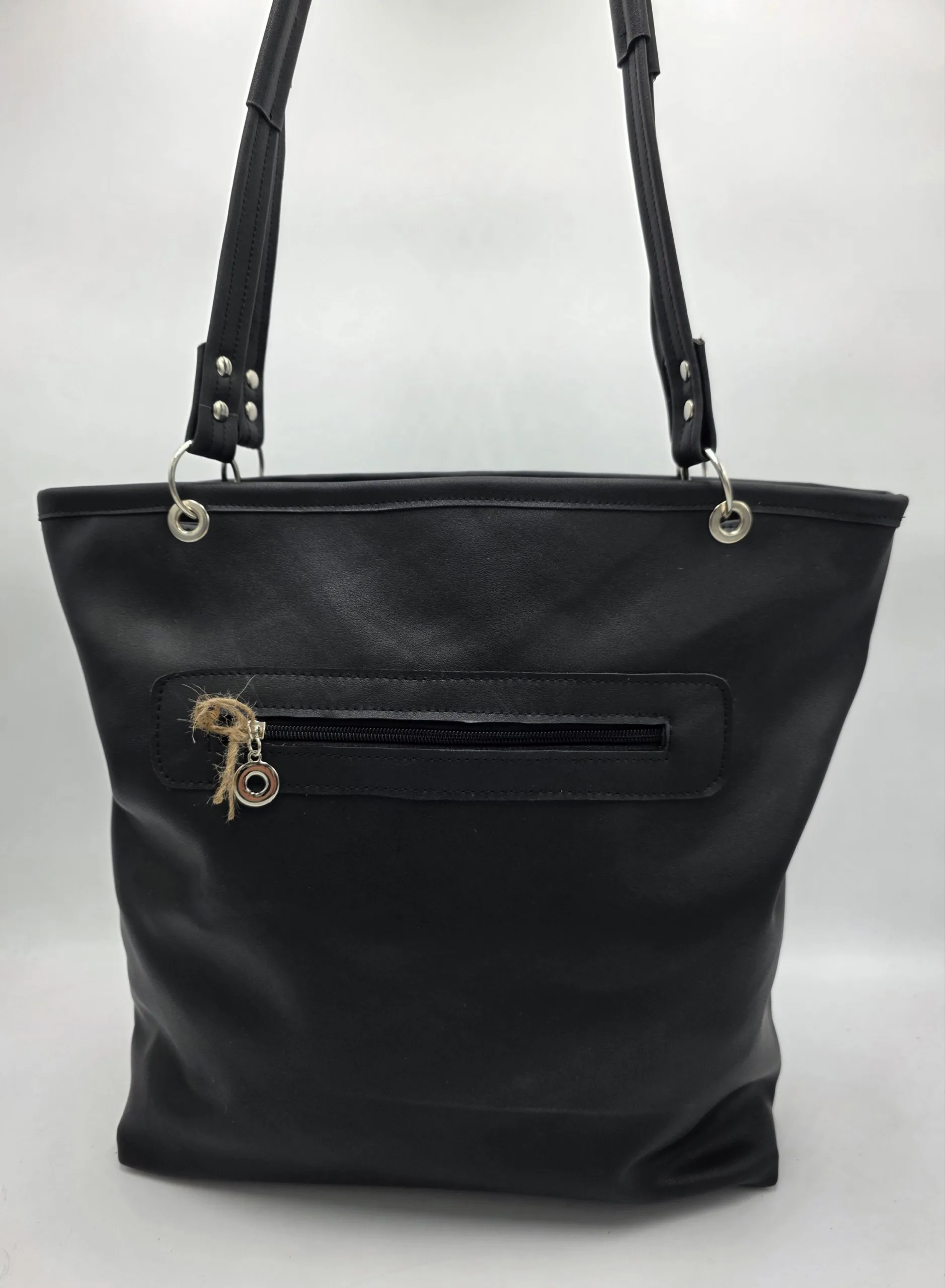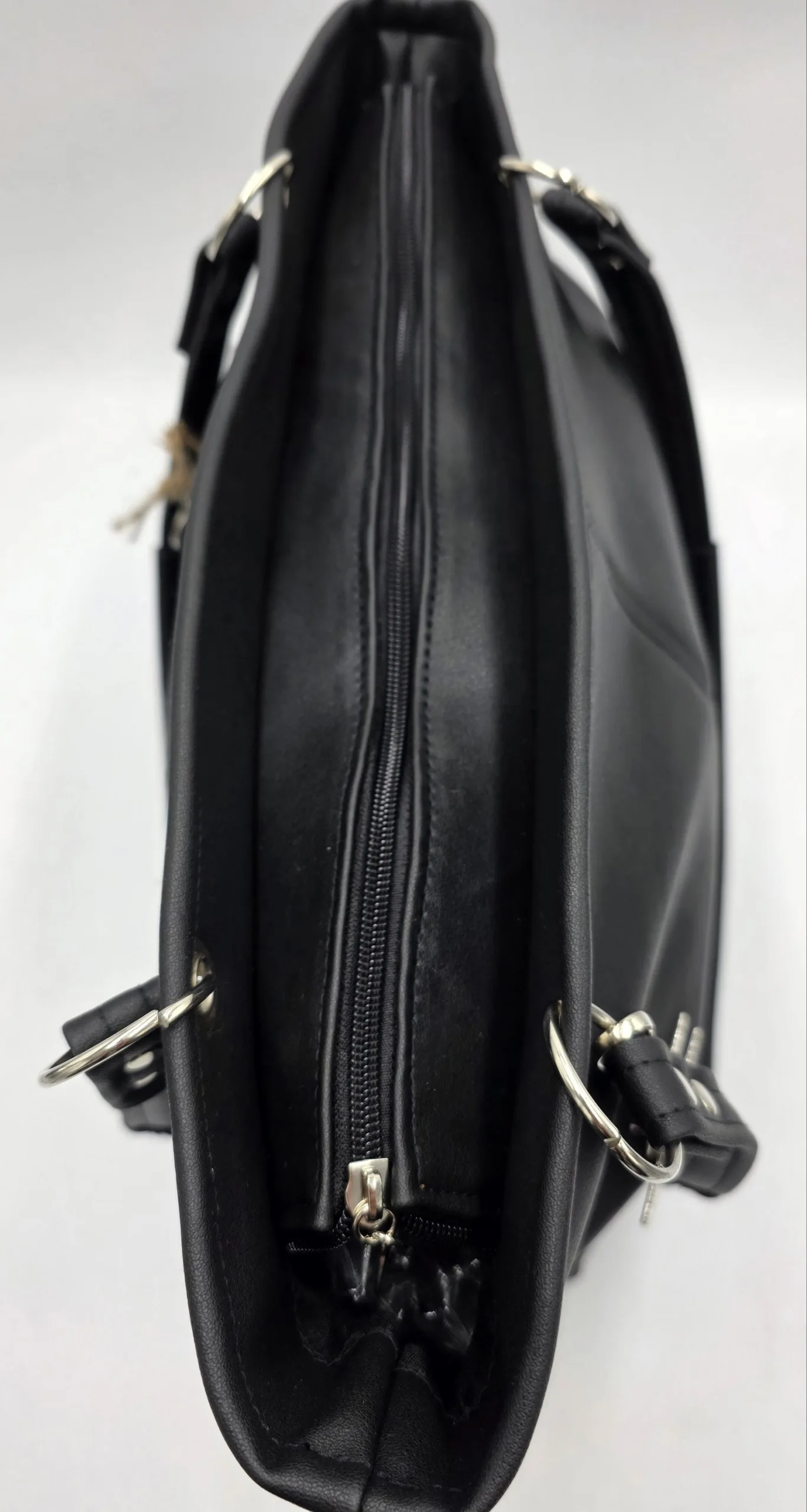 Голяма чанта от еко кожа с две дръжки 74см,вътрешен заден джоб с цип, закопчаване с цип, вътре със средна преграда с цип, вътрешен джоб с цип и допълнителен джоб за телефон, ширина 42см, височина 36см, дъно 33см/12см.