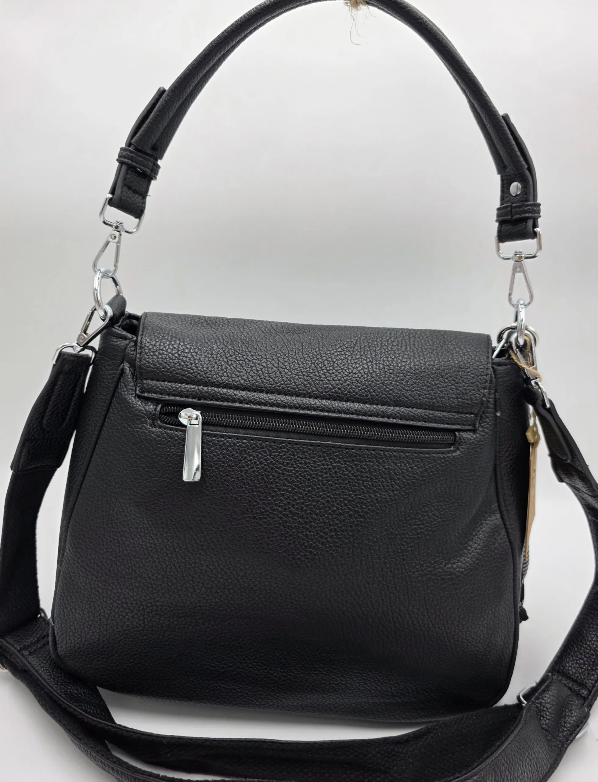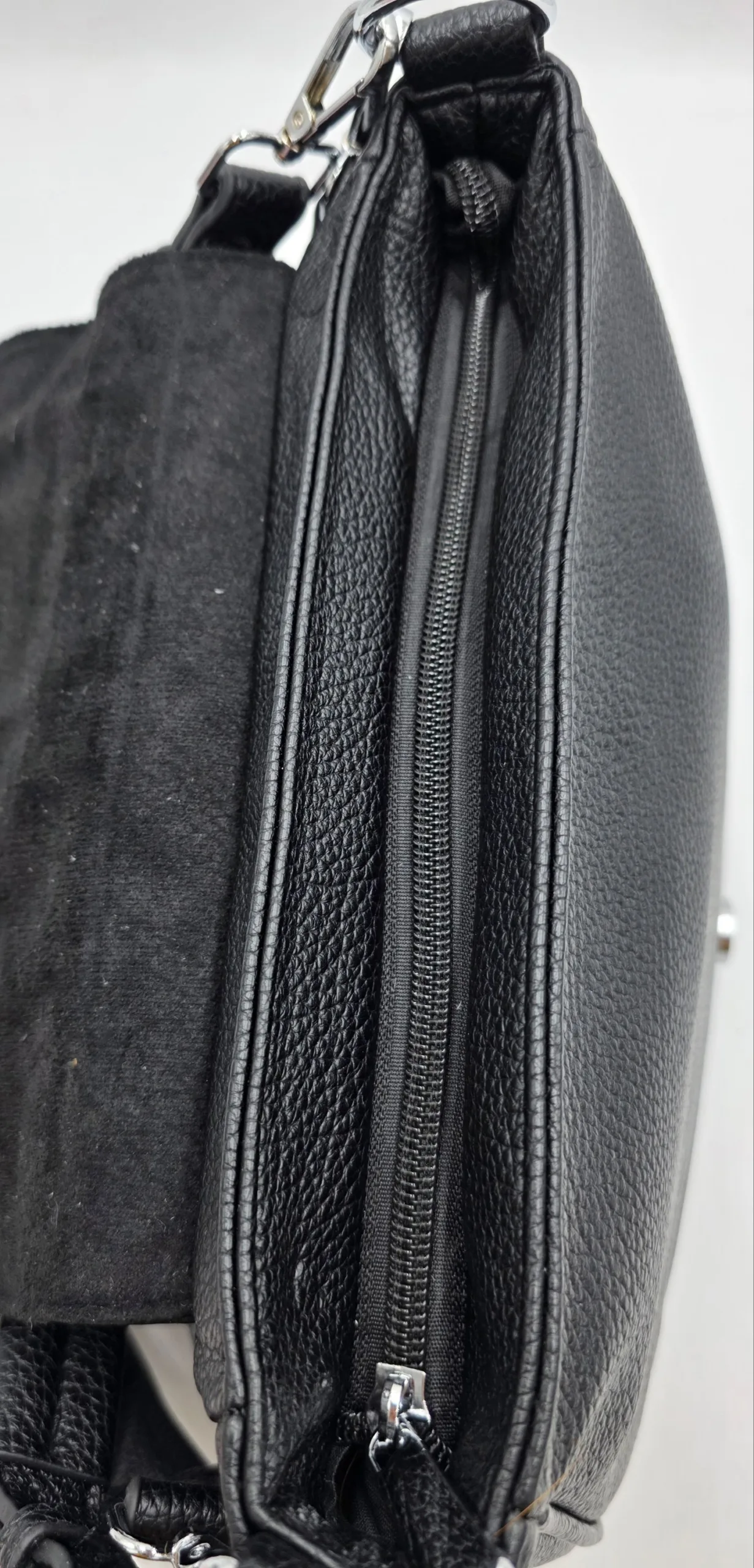 Чанта от еко кожа с капак и цип под капака, външен заден джоб с цип, вътрешен джоб с цип и допълнителни джобове за телефон, две заменями дръжки, късата 46см, дългата регулираща 150см .Ширина 30дм,височина 25см,дъно 27см/11см.
