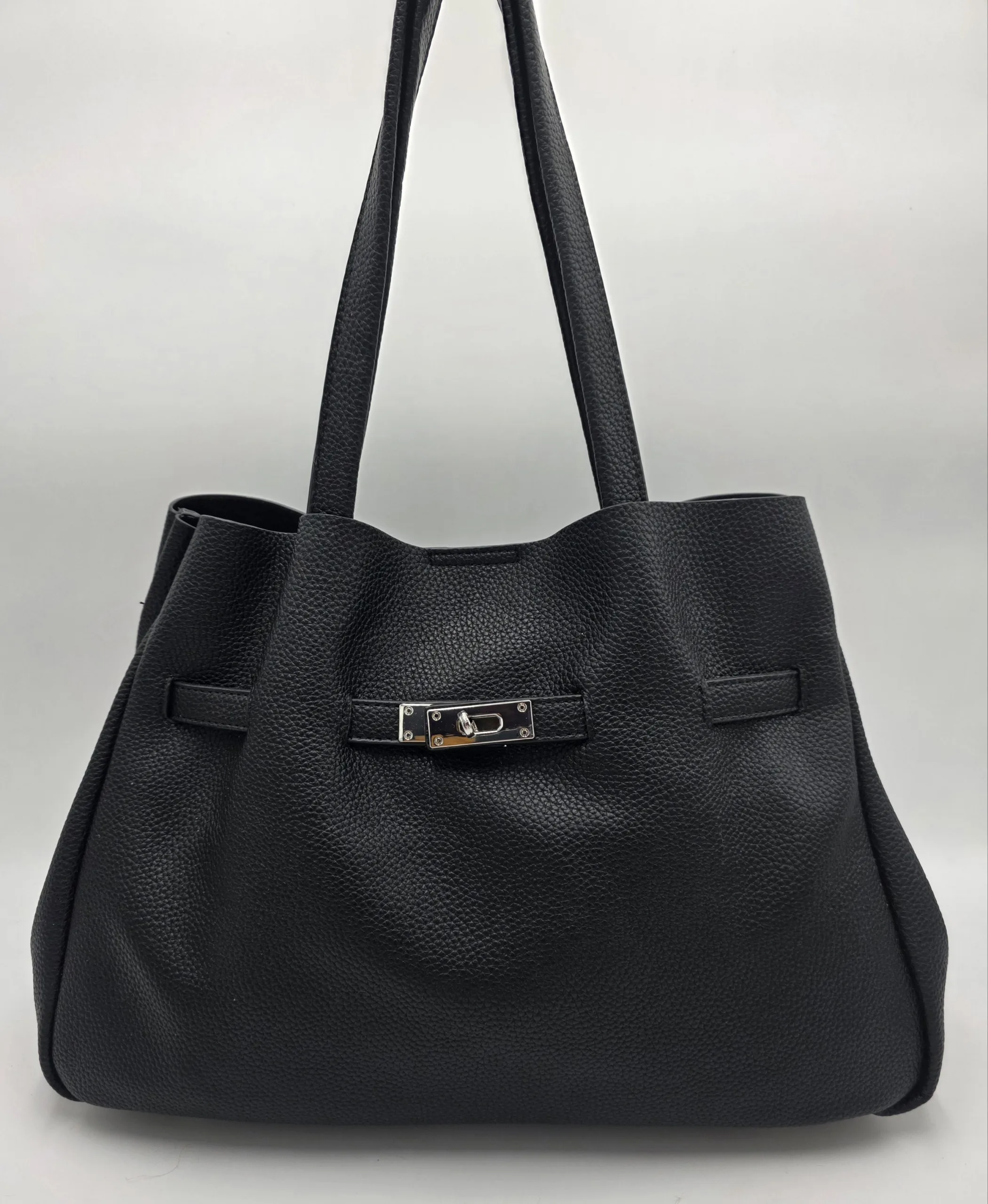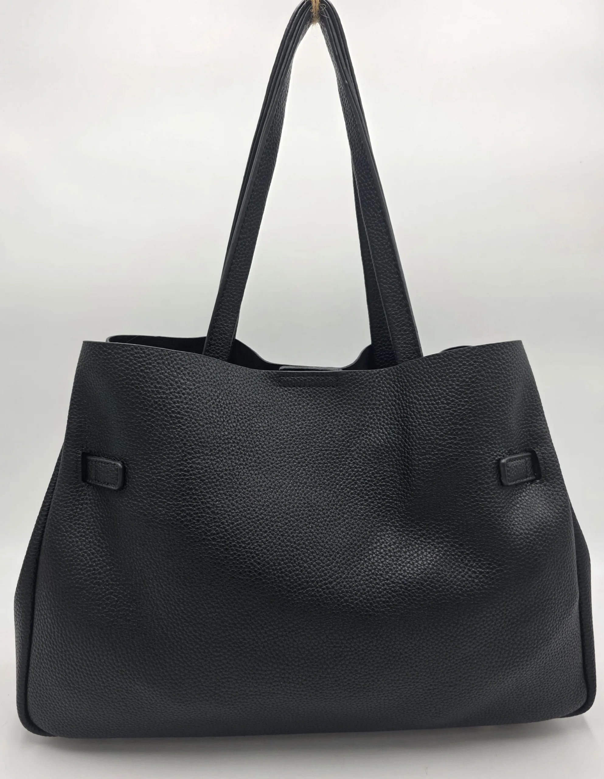 Чанта от мека еко кожа без хастар с две къси дръжки 50см и допълнителна регулираща се дълга дръжка 150см, три отделни прегради затварящи се общо с магнит,един вътрешен джоб с цип. Ширина 40см, височина 27см, дъно 38см/12см.