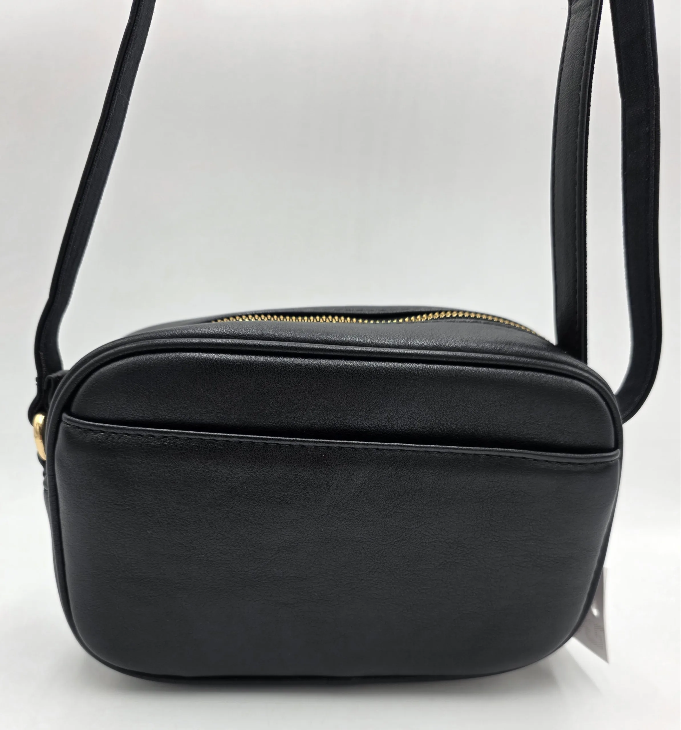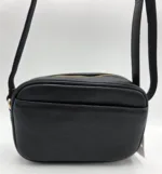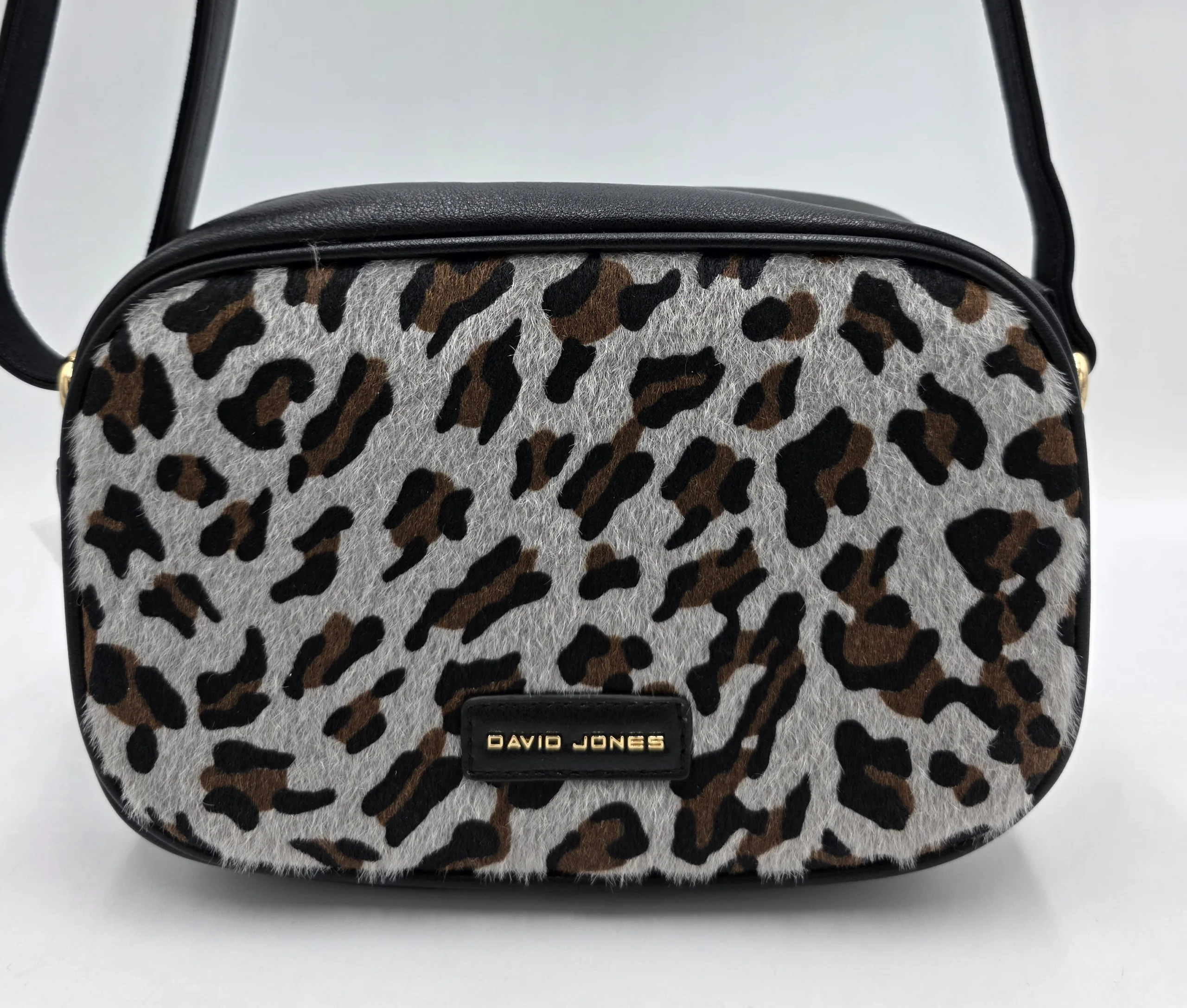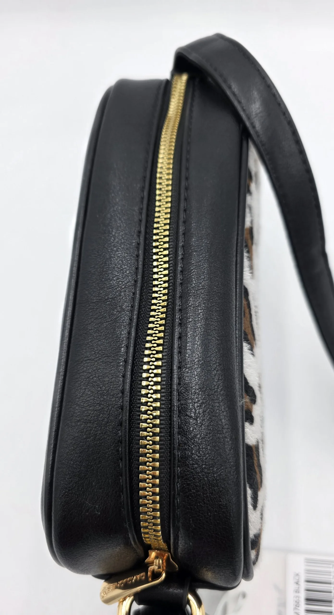 Малка чанта от еко кожа в черно с лице в леопардов принт къс еко косъм, заден външен джоб с магнит, закопчаване с цип, вътрешен джоб с цип и допълнителен джоб за телефон, дълга регулираща се дръжка 150см, ширина 21см, височина 14см, дъно 20см/7см