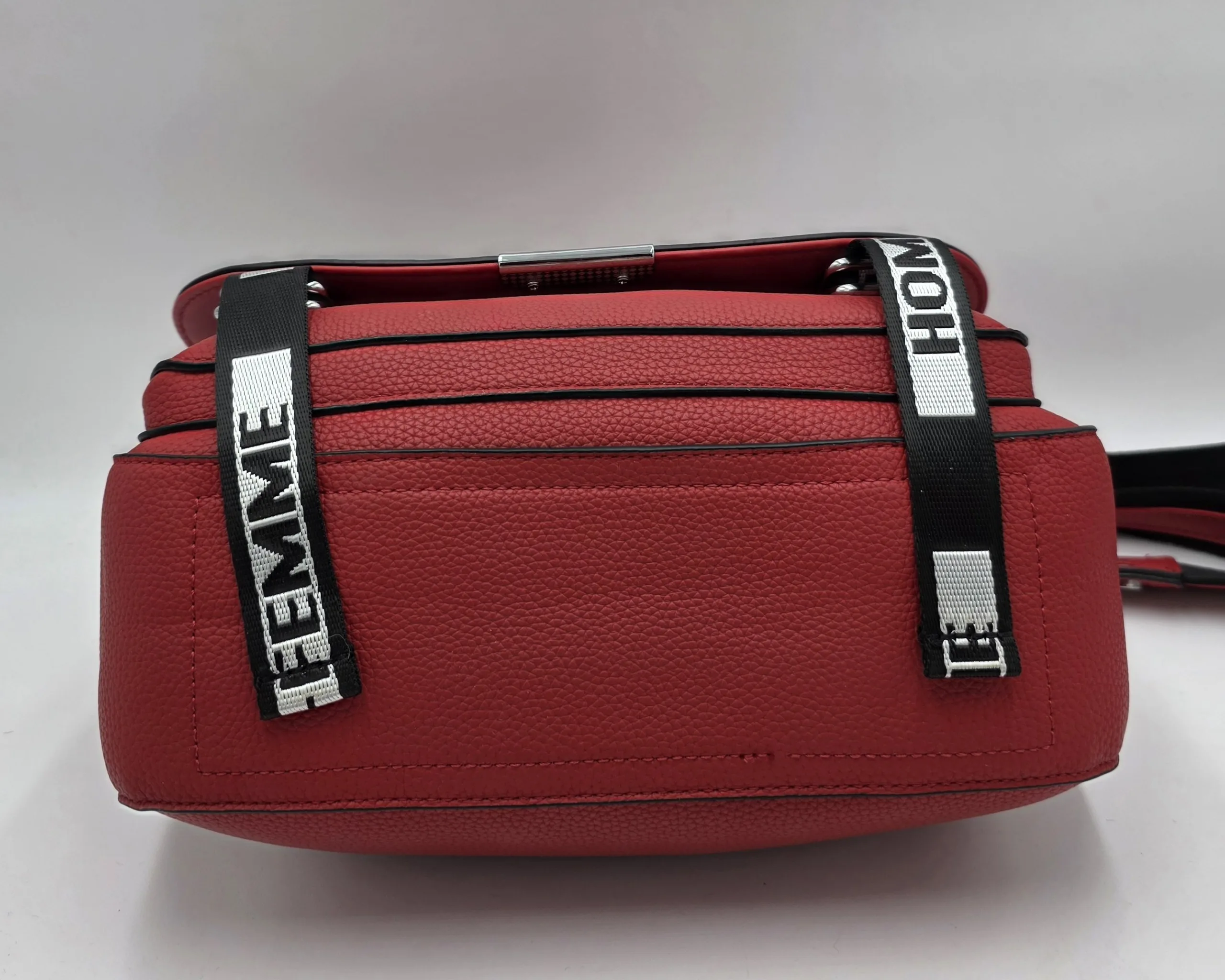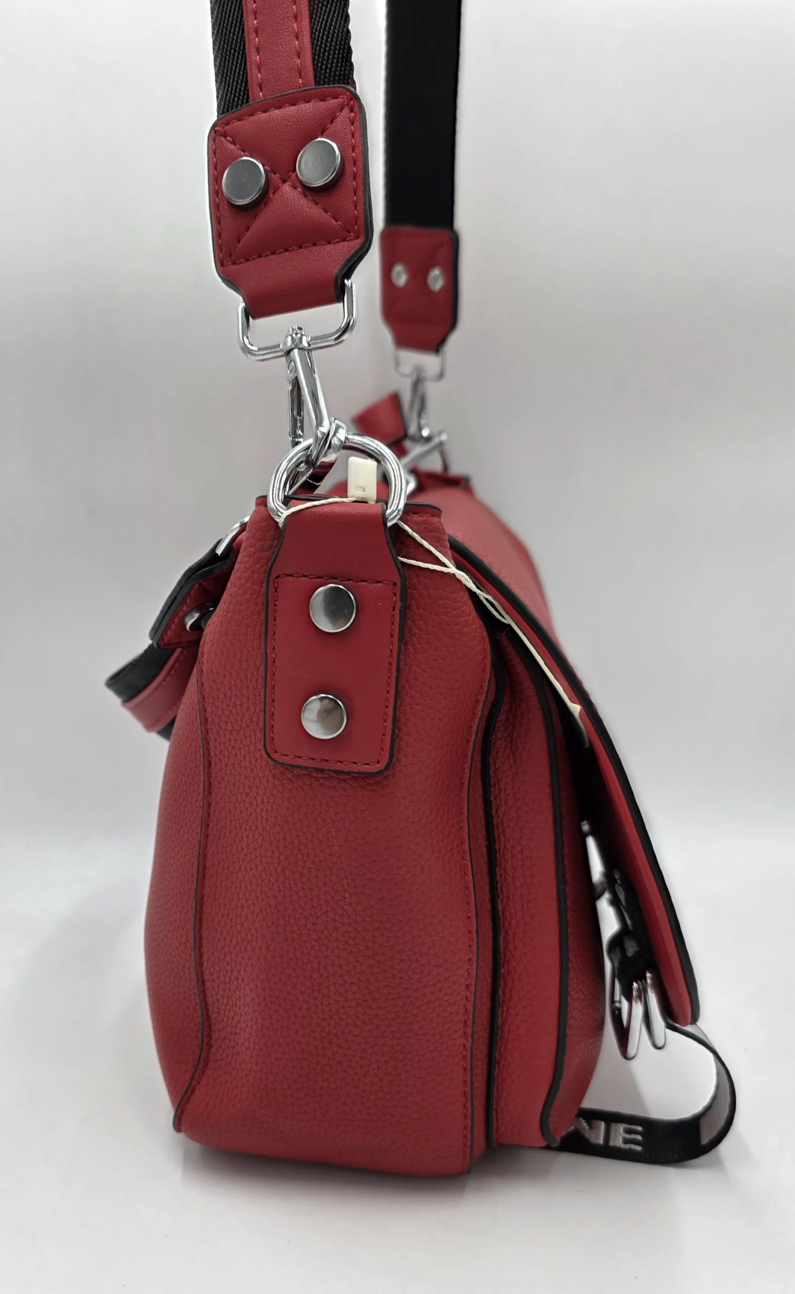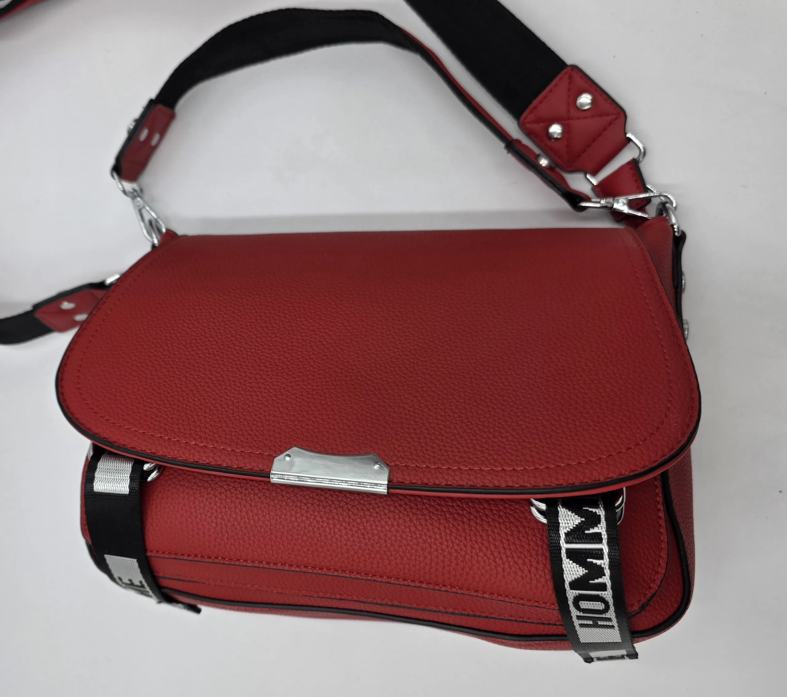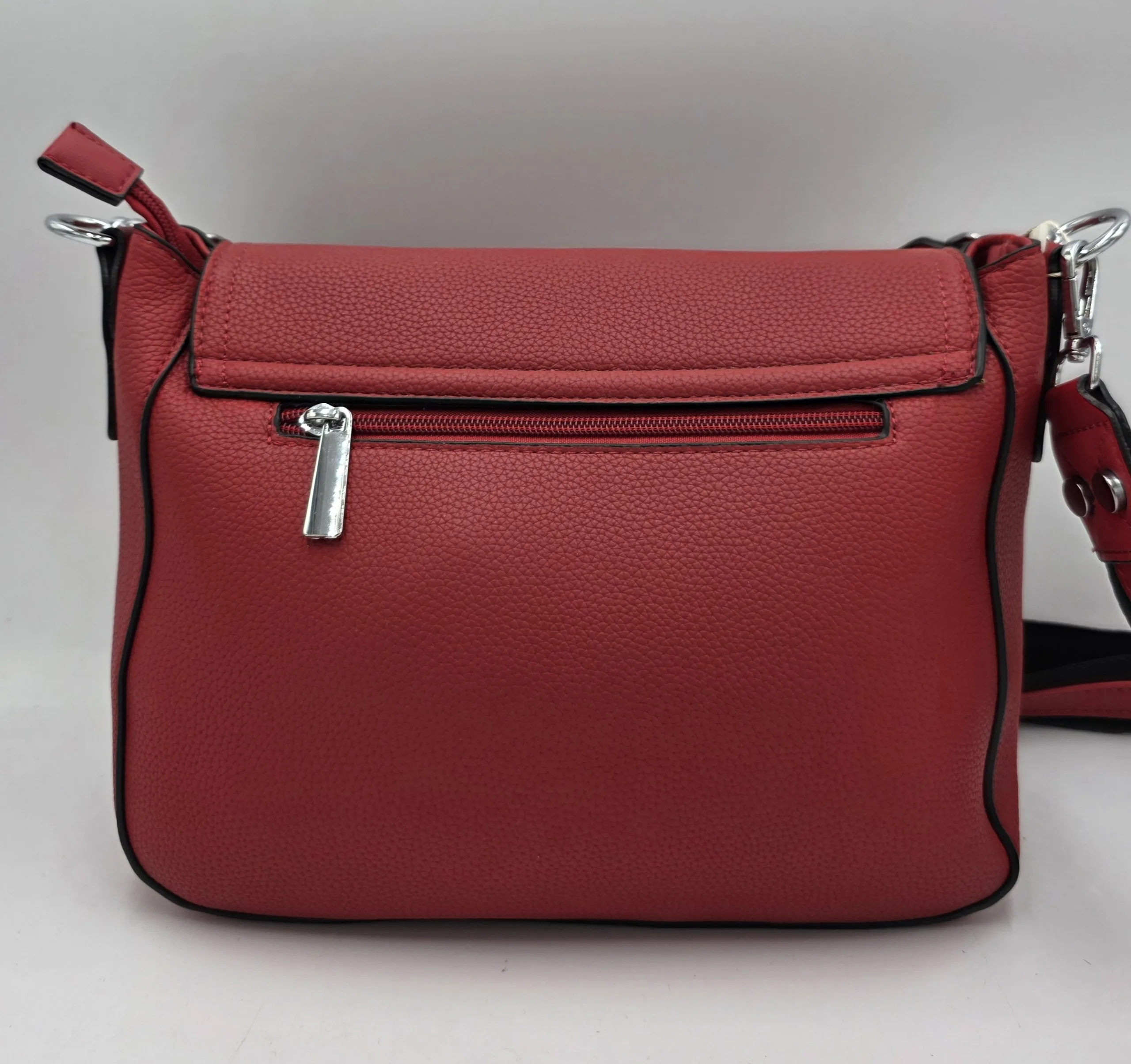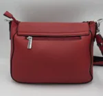 Чанта от еко кожа с капак, джоб под него, закопчаване с цип, вътре със средна преграда, джоб с цип и допълнителни джобове за телефон, външен заден джоб с цип. Две дръжки, късата 42см,дълга регулираща се дръжка 150см. Ширина 29см, височина 21см,дъно 27см/10см.