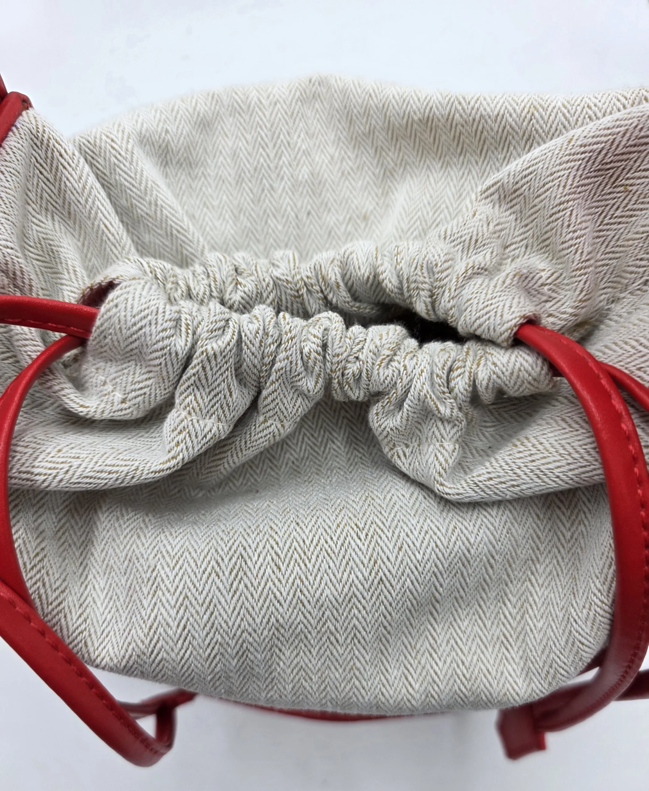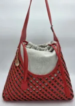 Нестандартна чанта от еко кожа в комбинация с лен. Закопчаване с връзки,вътрешен джоб с цип, една дръжка 54см и допълнителна дълга регулираща се дръжка 150см. Ширина 40см, височина 27см,дъно 34см/11см
