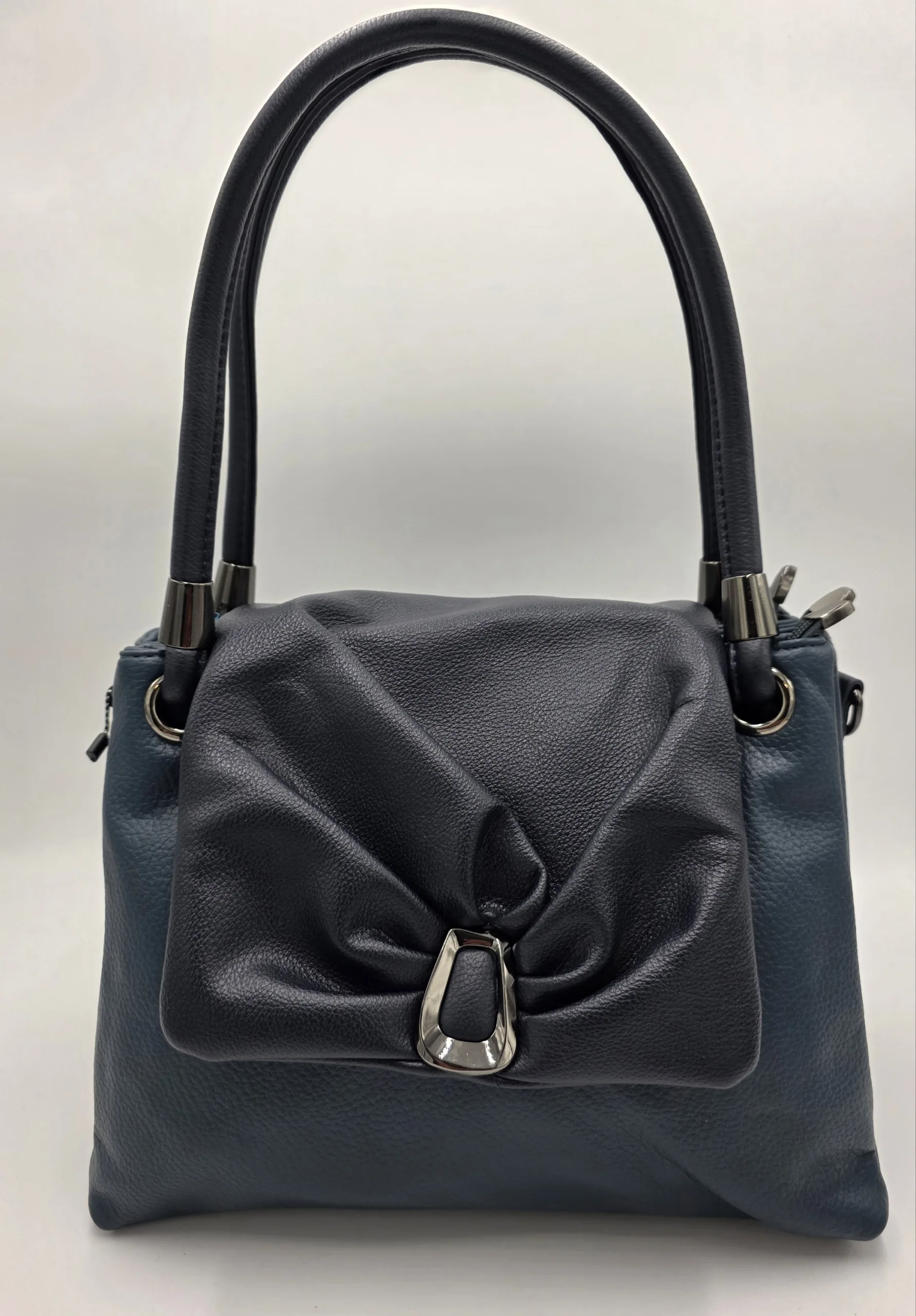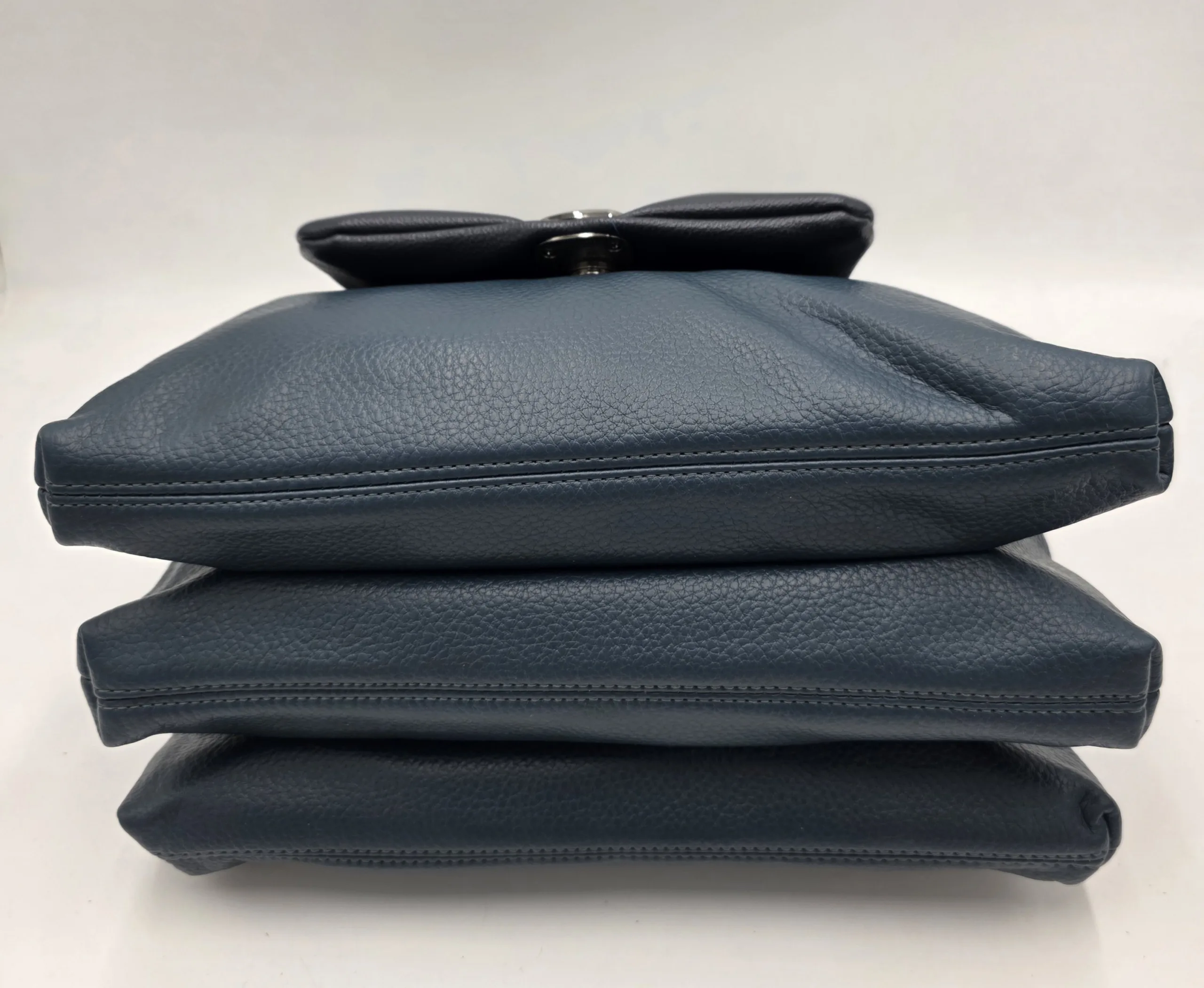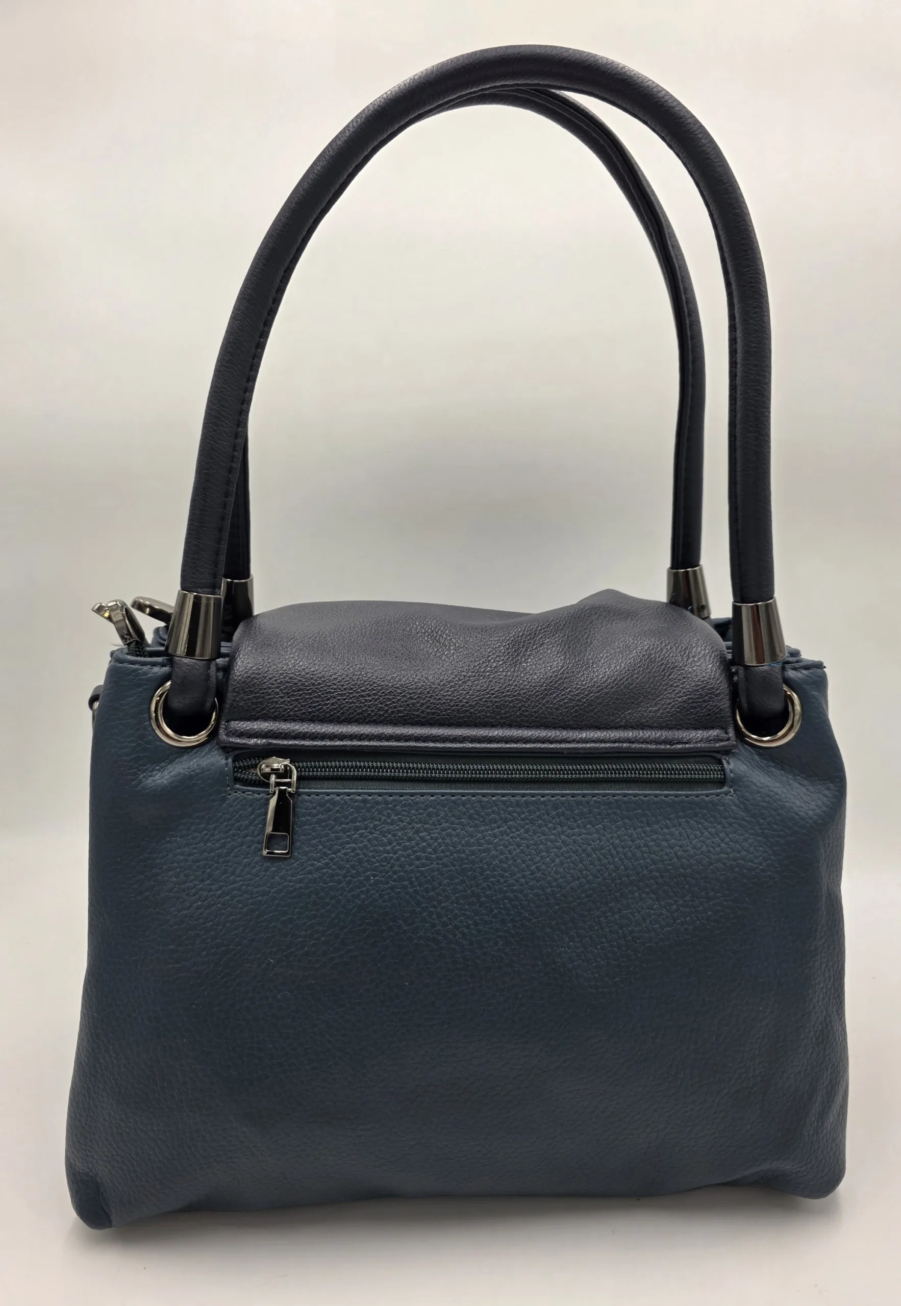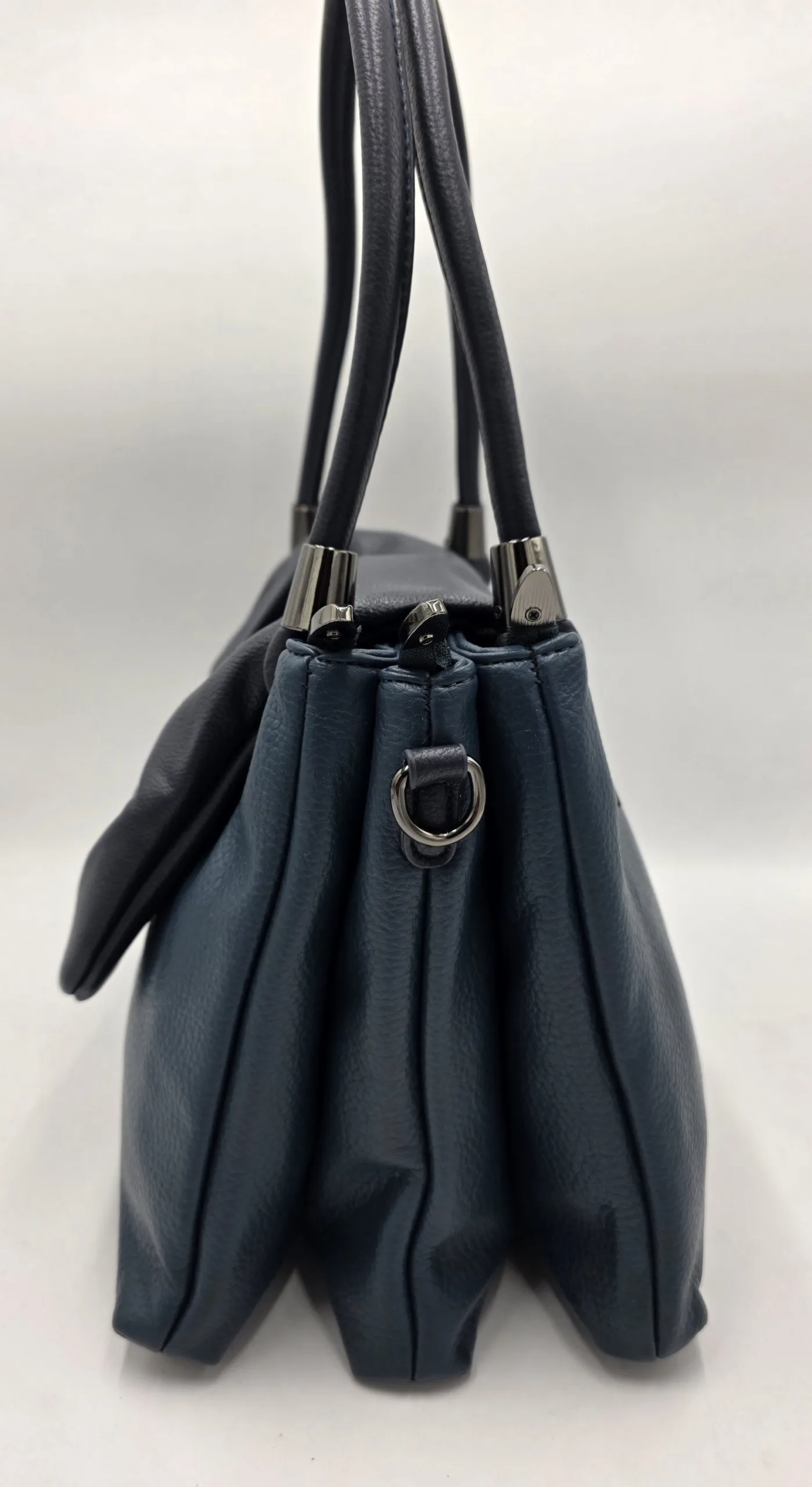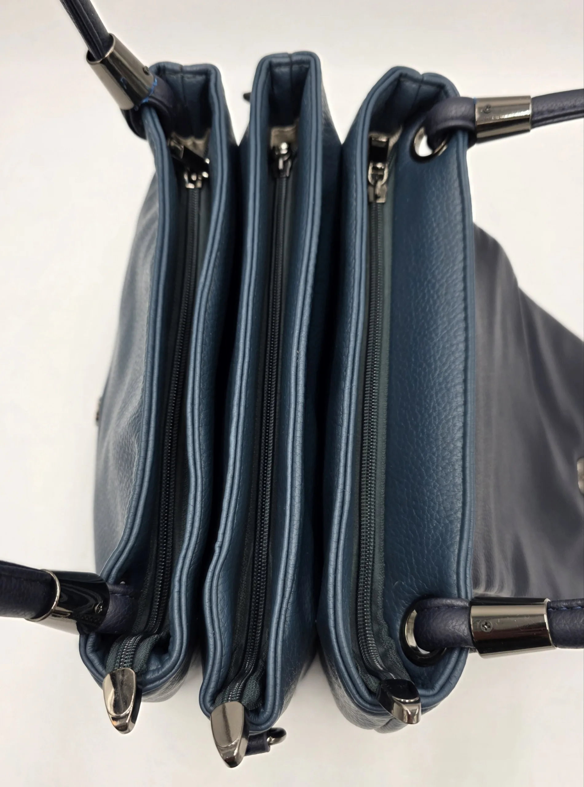 Чанта от еко кожа с капак, под капака три отделни прегради с цип помежду им още две прегради, вътрешен джоб с цип и допълнителни джобове за телефон, външен заден джоб с цип, две дръжки 58см и допълнителна дълга регулираща се дръжка 150см, без оформено дъно. Ширина 30см, височина 23см.
