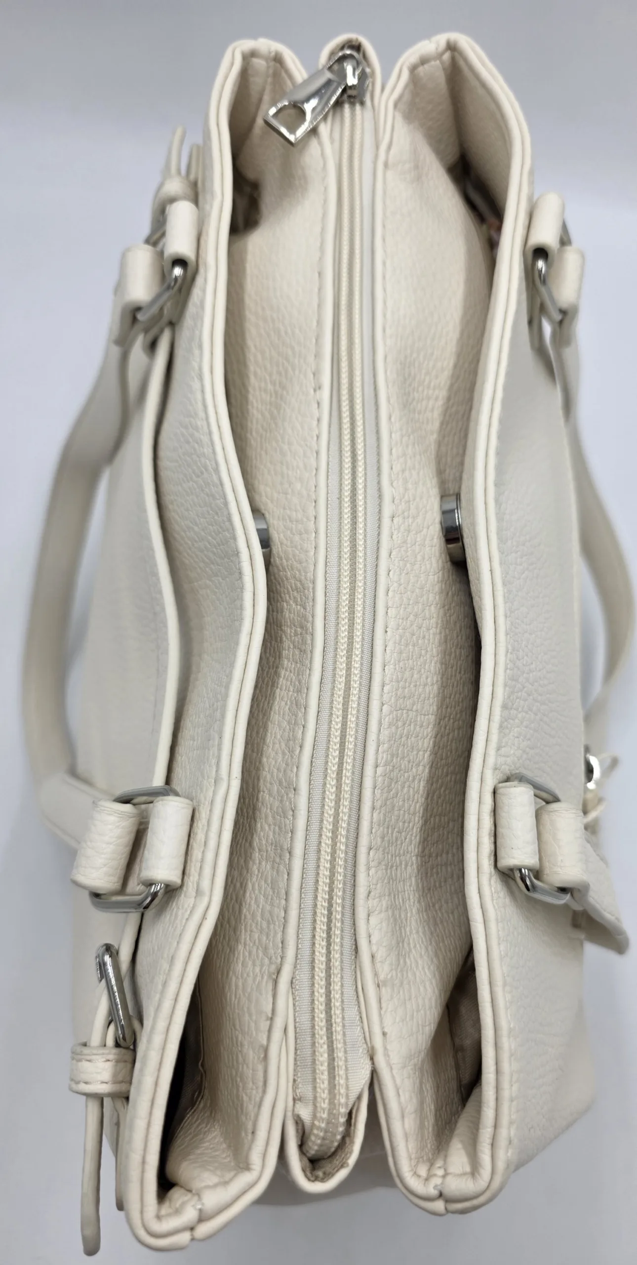 Чанта от еко кожа с две дръжки 60см,външен джоб с цип, три отделни прегради, едната с цип, две с магнит,вътрешен джоб с цип .Ширина 34см,височина 28см, дъно 32см/13см