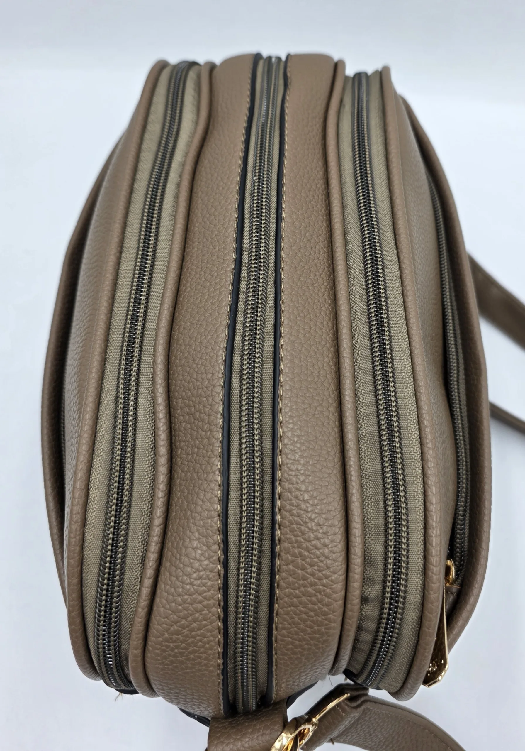 Чанта от еко кожа с дълга регулираща се дръжка 150см, три отделни прегради затварящи се с цип, два странични външни джоба с цип,вътрешен джоб с цип и допълнителни джобове за телефон. Ширина 28см,височина 20см,дъно 28см/12см.