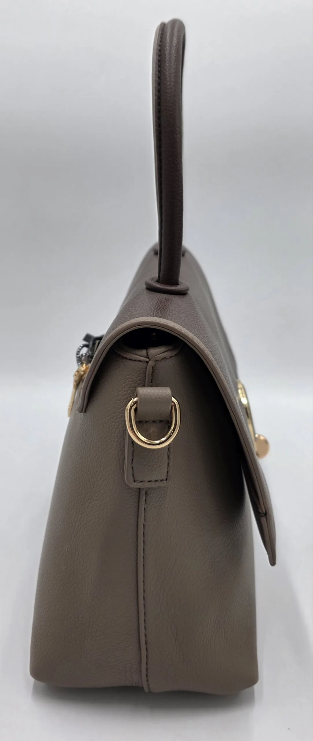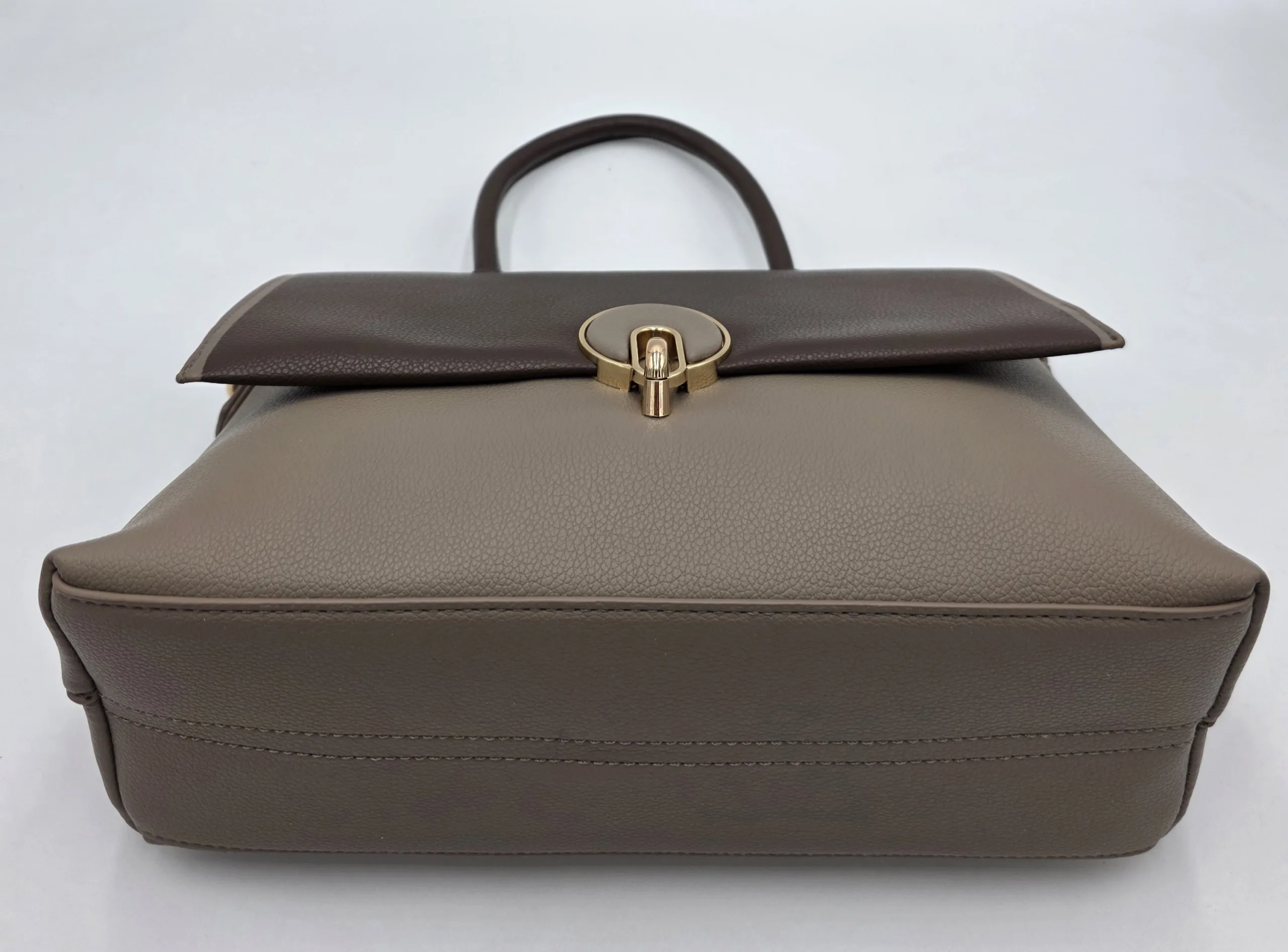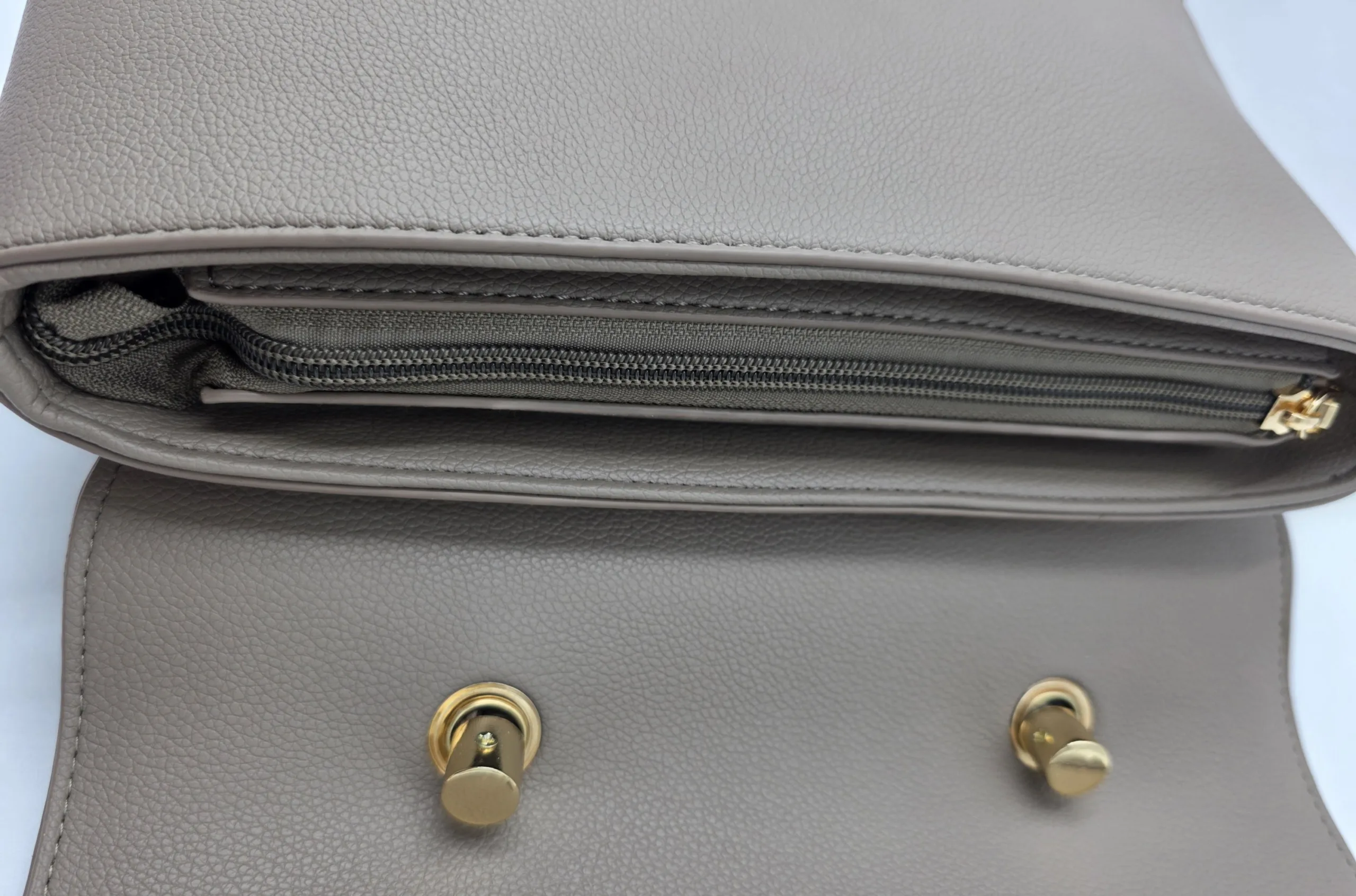 Елегантна чанта от еко кожа с капак и цип под капака, къса дръжка 35см,допълнителна дълга регулираща се дръжка 150см, заден джоб с цип, вътре със средна преграда с цип, джоб с цип и допълнителни джобове за телефон. Ширина 35см,височина 20см,дъно 30см/10см.