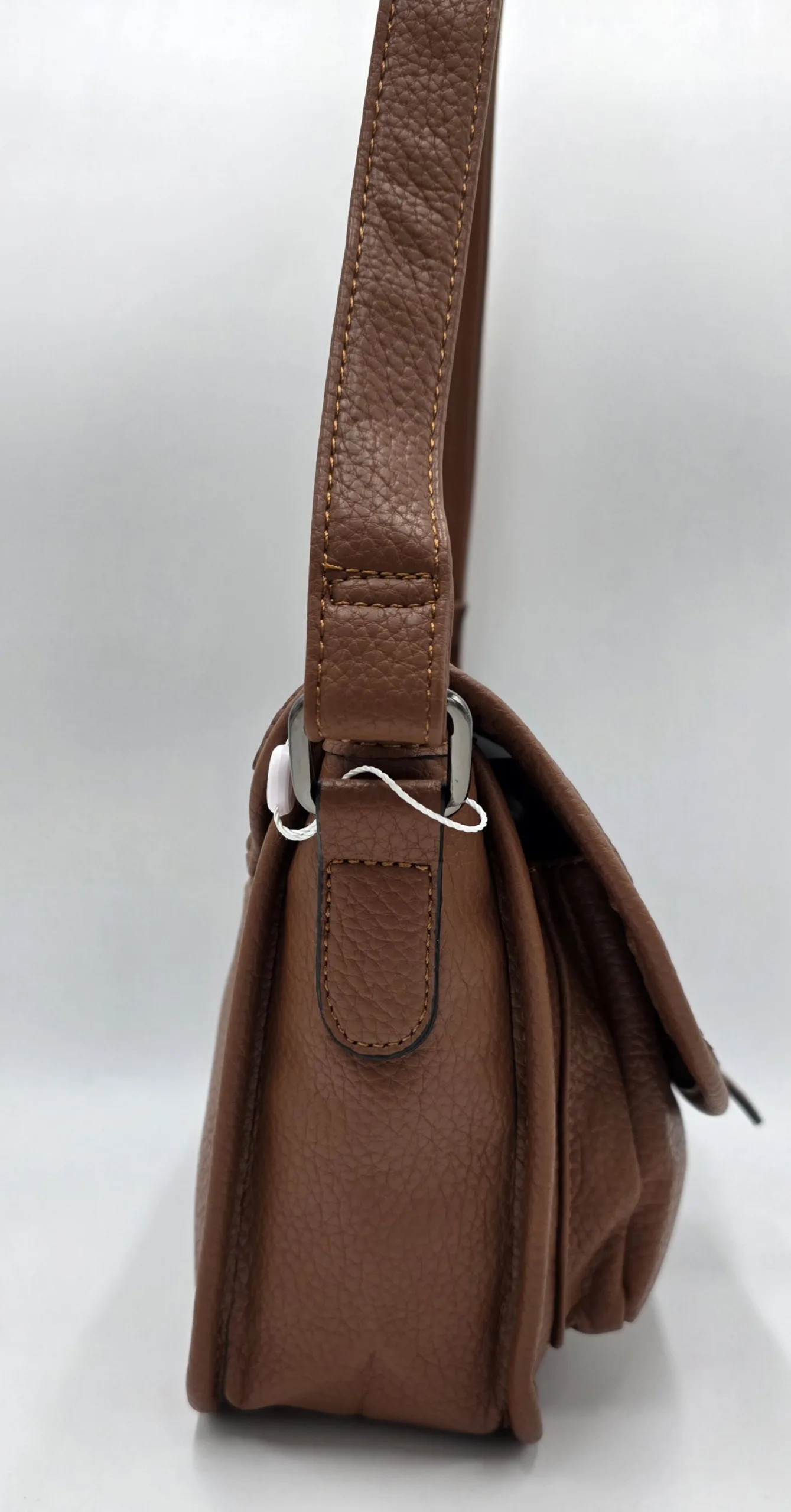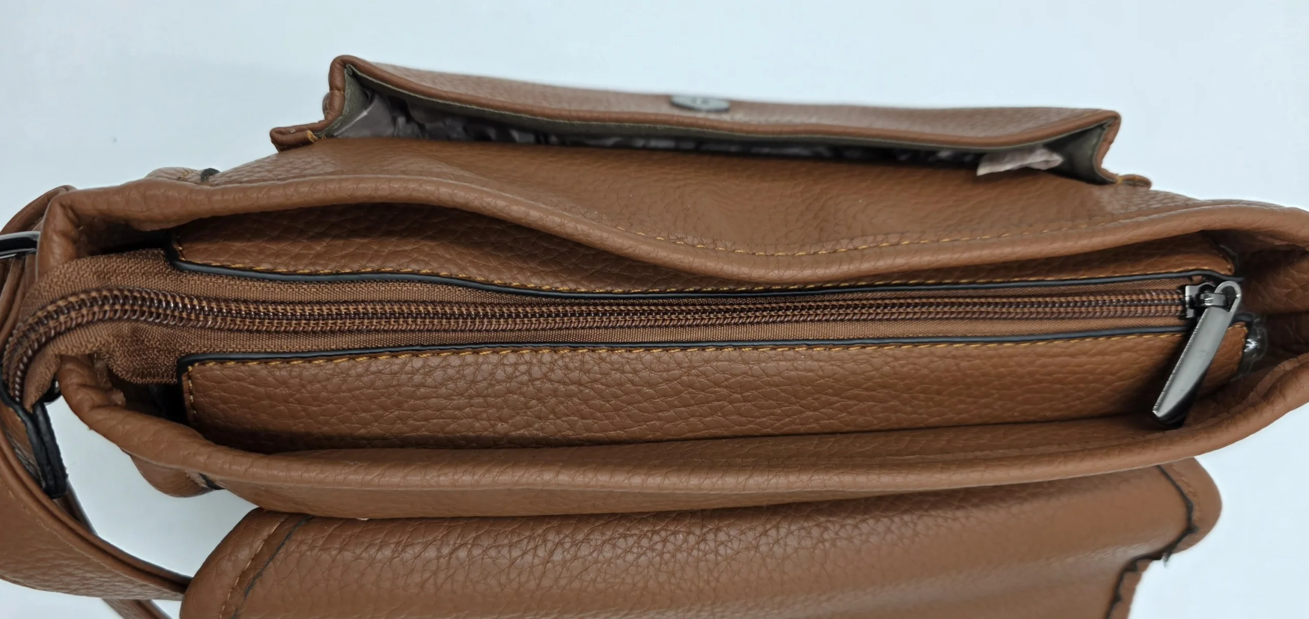 Чанта от еко кожа с дълга регулираща се дръжка 150см, с капак, под капака основна преграда закопчаване с цип и още един голям преден джоб, вътрешен джоб с цип и допълнителни джобове за телефон, външен заден джоб с цип,ширина 26см, височина 18см, дъно 26см/8см.