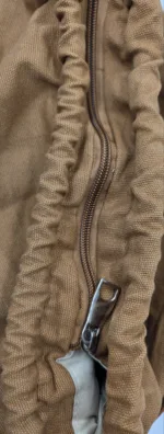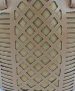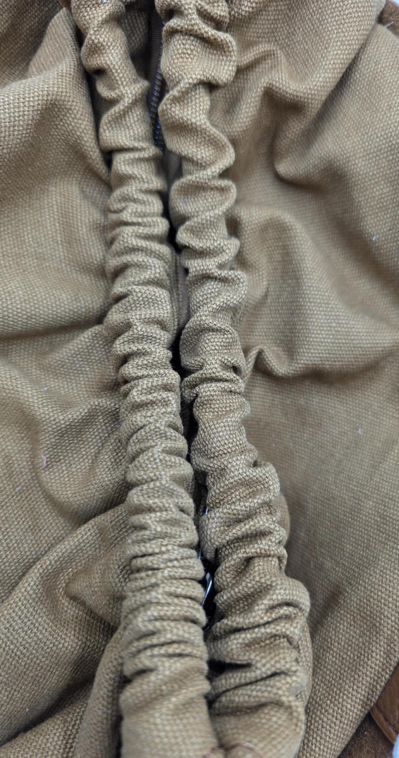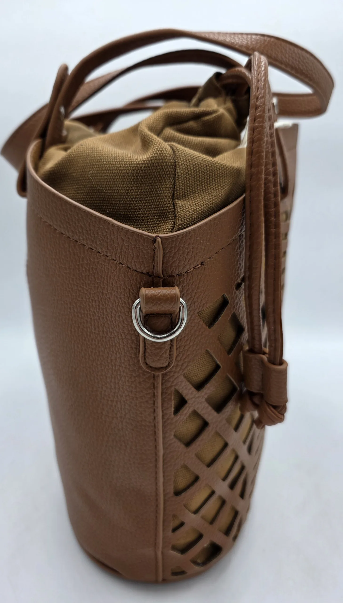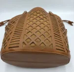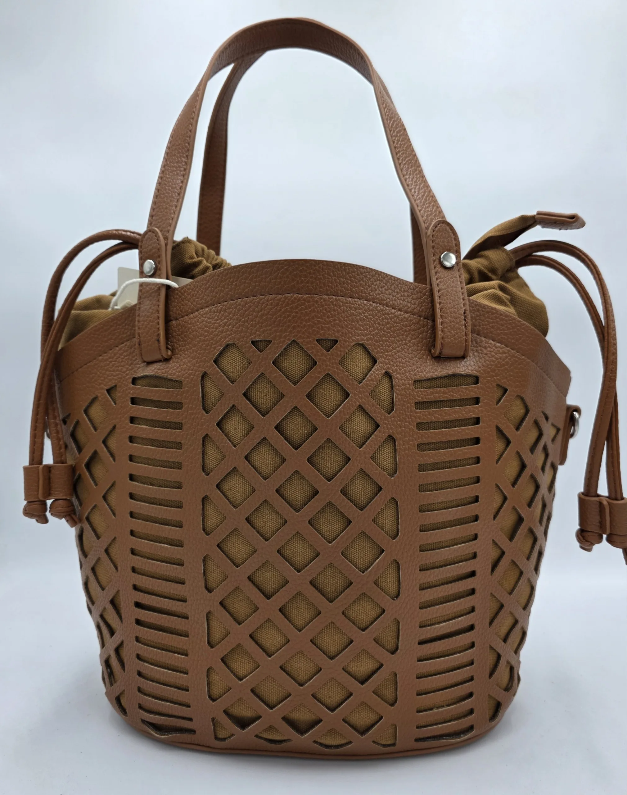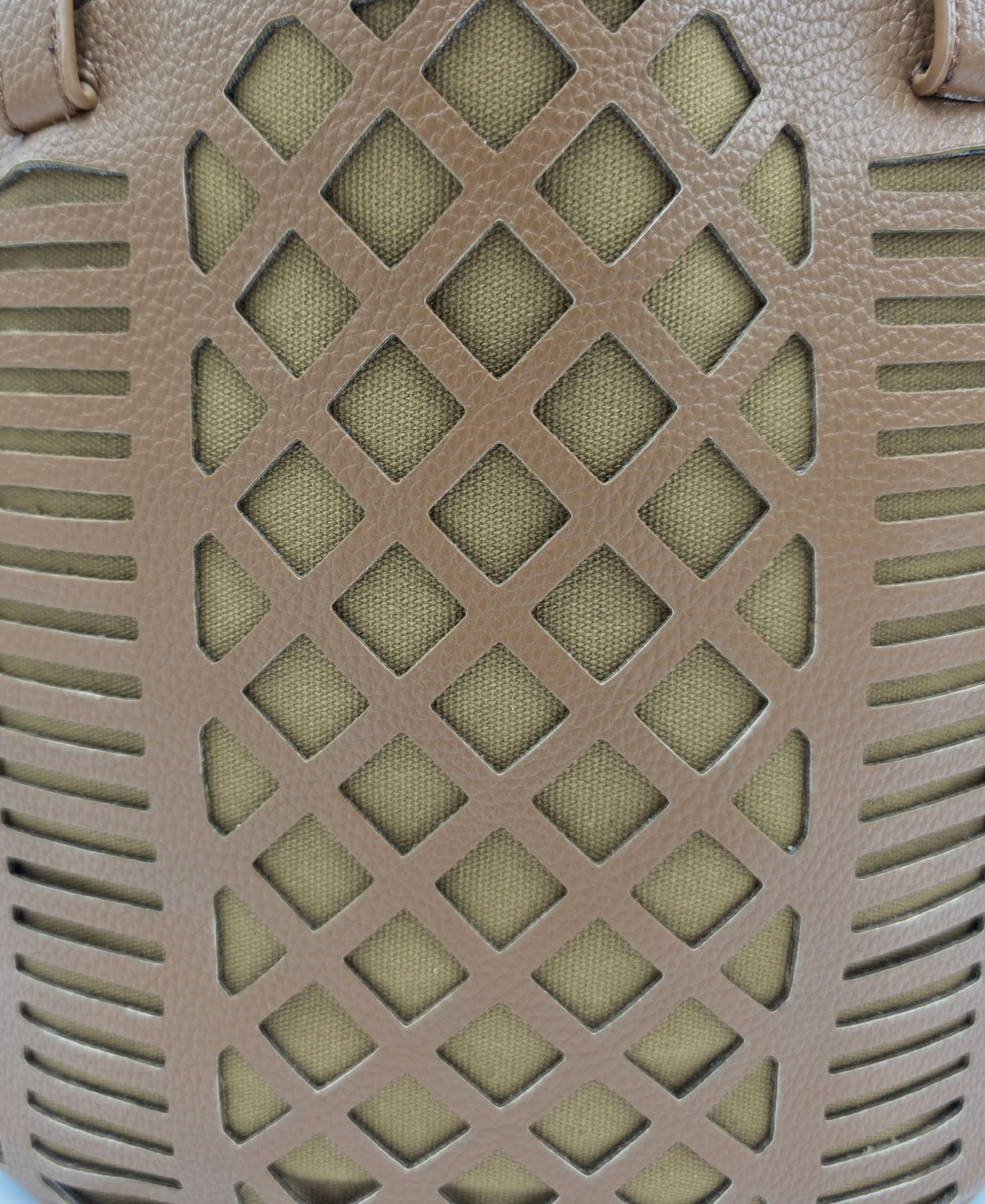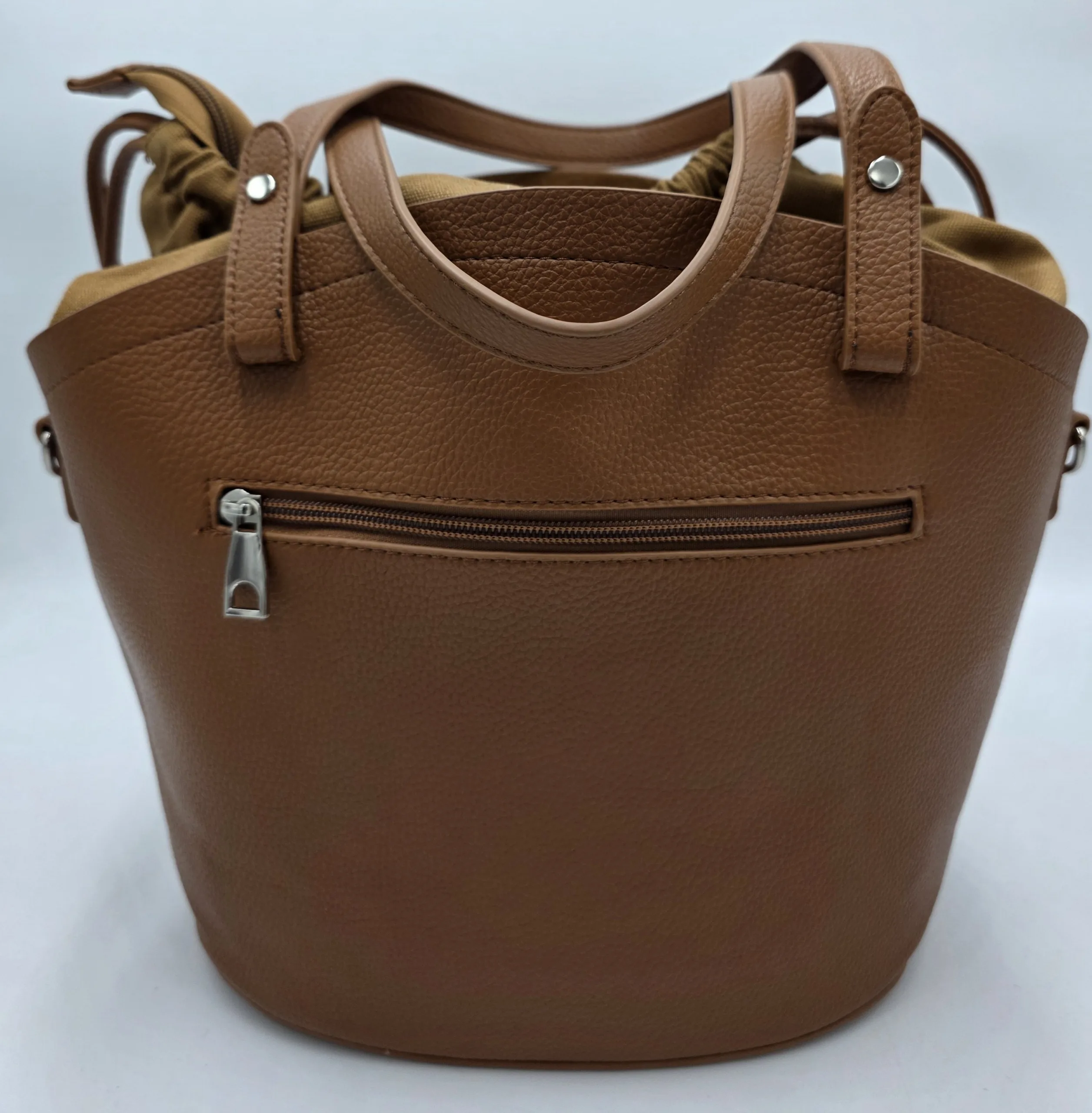 Нестандартна чанта от еко кожа в съчетание с лен.Две дръжки 48см и допълнителна дълга регулираща се дръжка 150см, закопчаване с връзки и цип,вътре със средна преграда с цип, джоб с цип допълнителни джобове за телефон, външен заден джоб с цип. Ширина 42см, височина 29см, овално дъно 27см/14см
