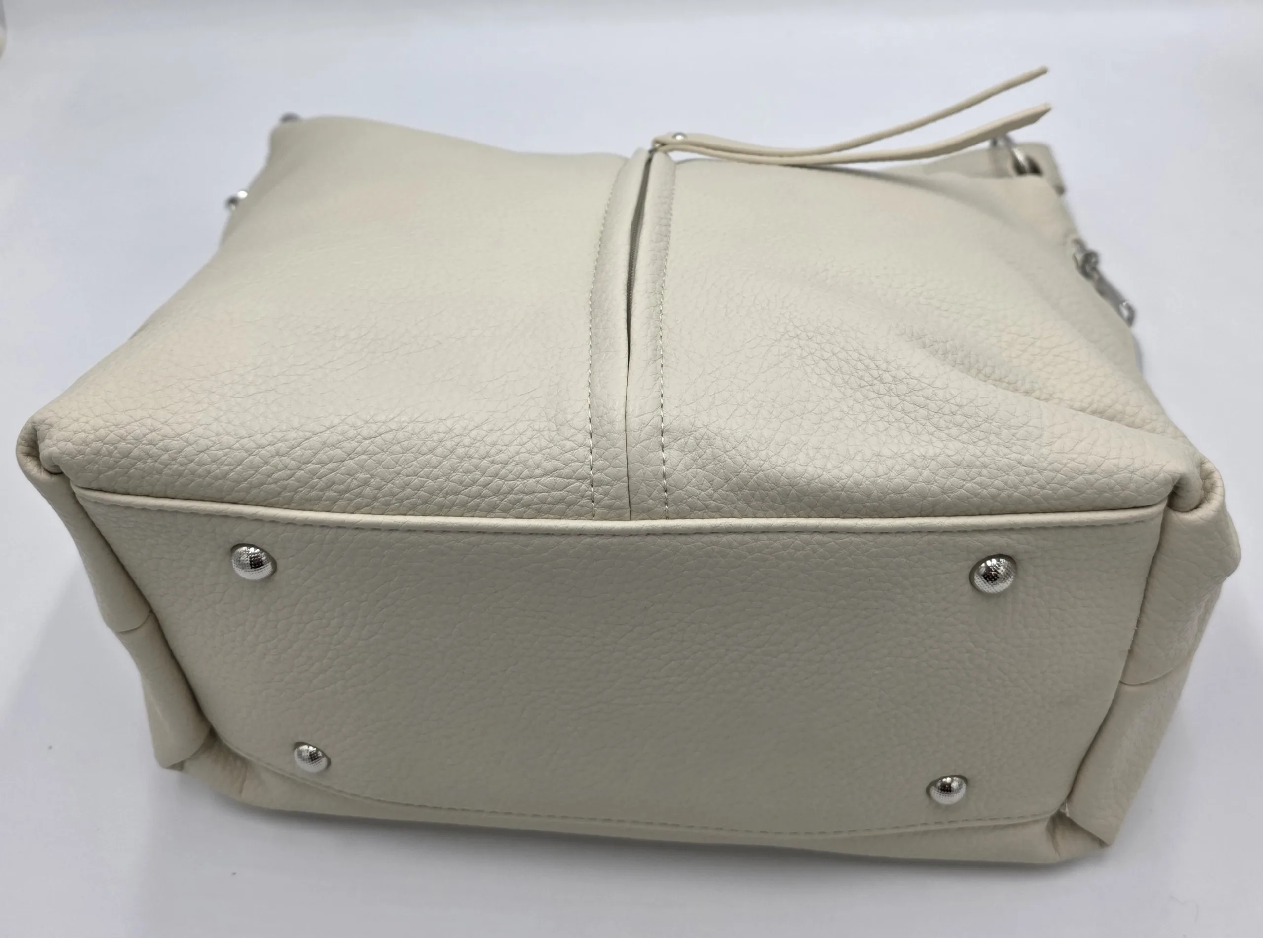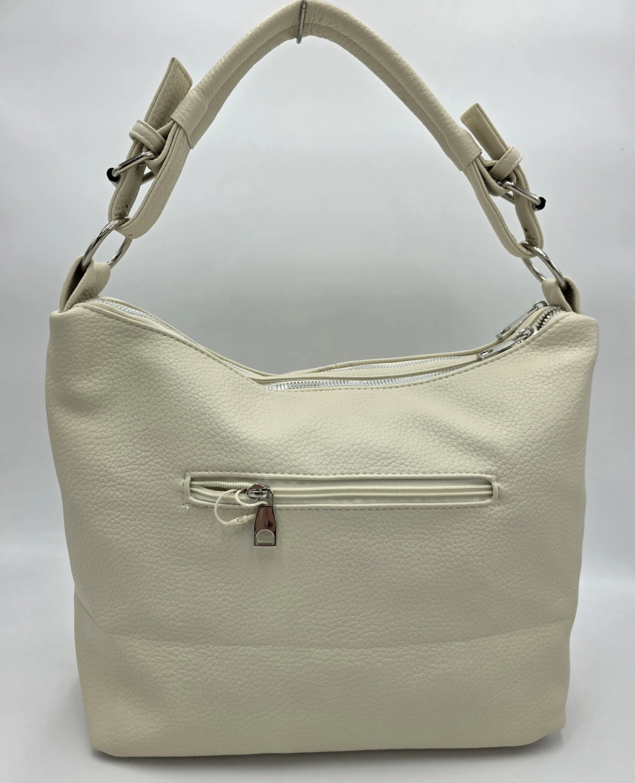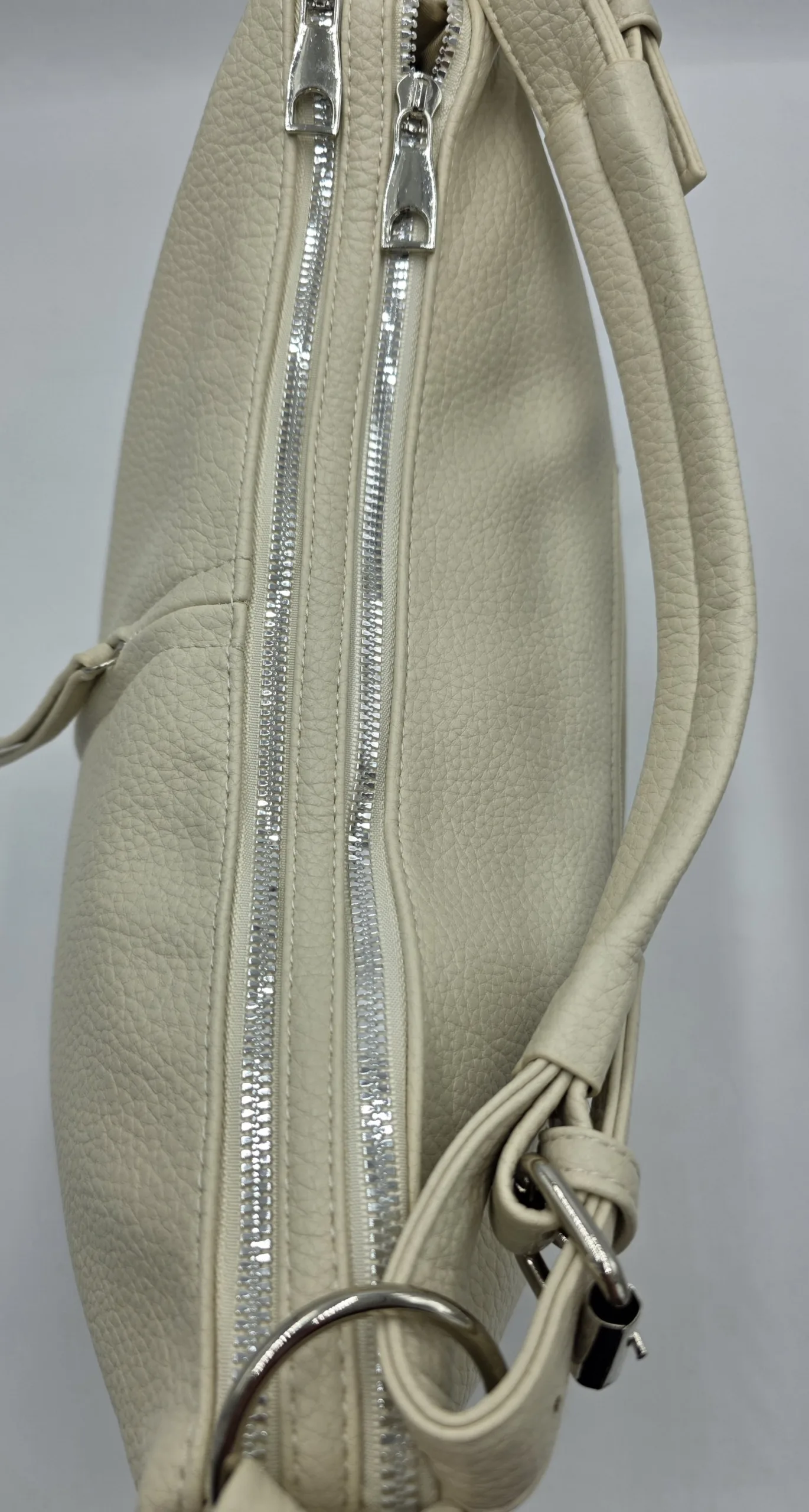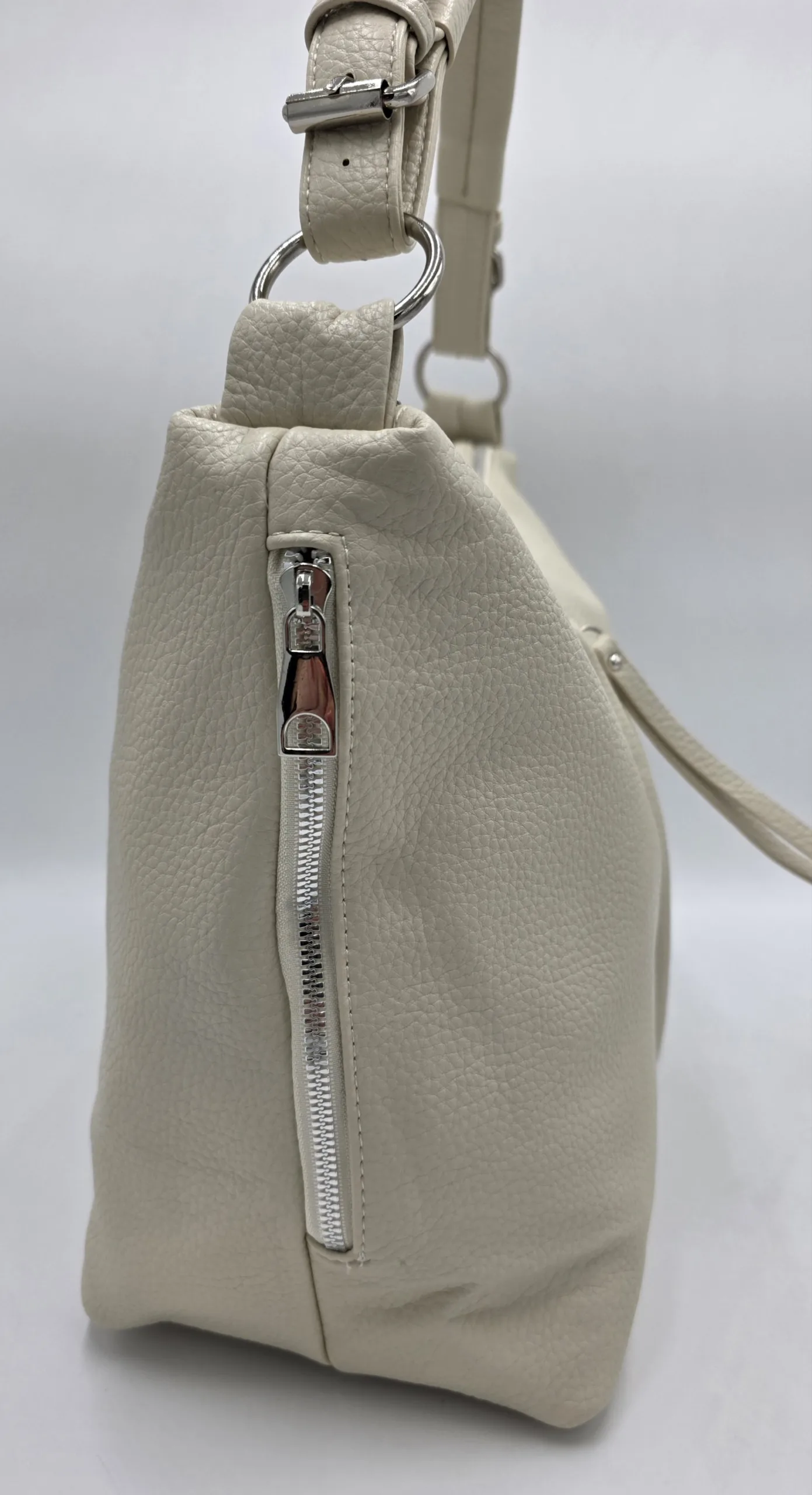 Ежедневна чанта от мека еко кожа с две отделни прегради затварящи се с цип, четири външни джоба с цип, вътрешен джоб с цип и допълнителни джобове за телефон, една дръжка 52см и допълнителна дълга регулираща се дръжка 150см. Ширина 43см, височина 28см,дъно 29см/15см