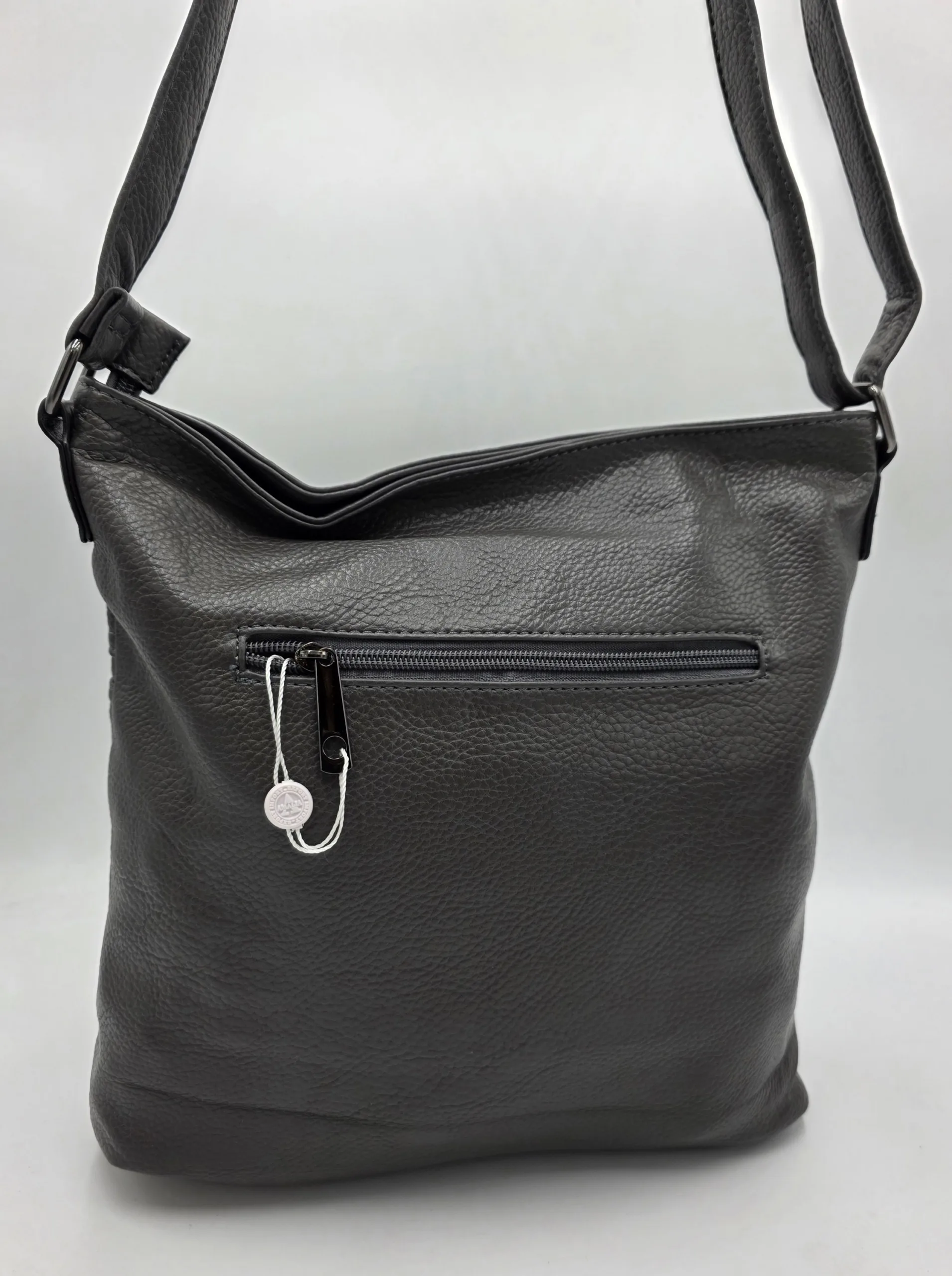 Чанта от еко кожа с 3 предни джоба с цип, заден външен джоб с цип, закопчаване с цип, вътре със средна преграда с цип, джоб с цип и допълнителни джобове за телефон, дълга регулираща се дръжка 150см. Ширина 31см,височина 31см,дъно 29см/10см.