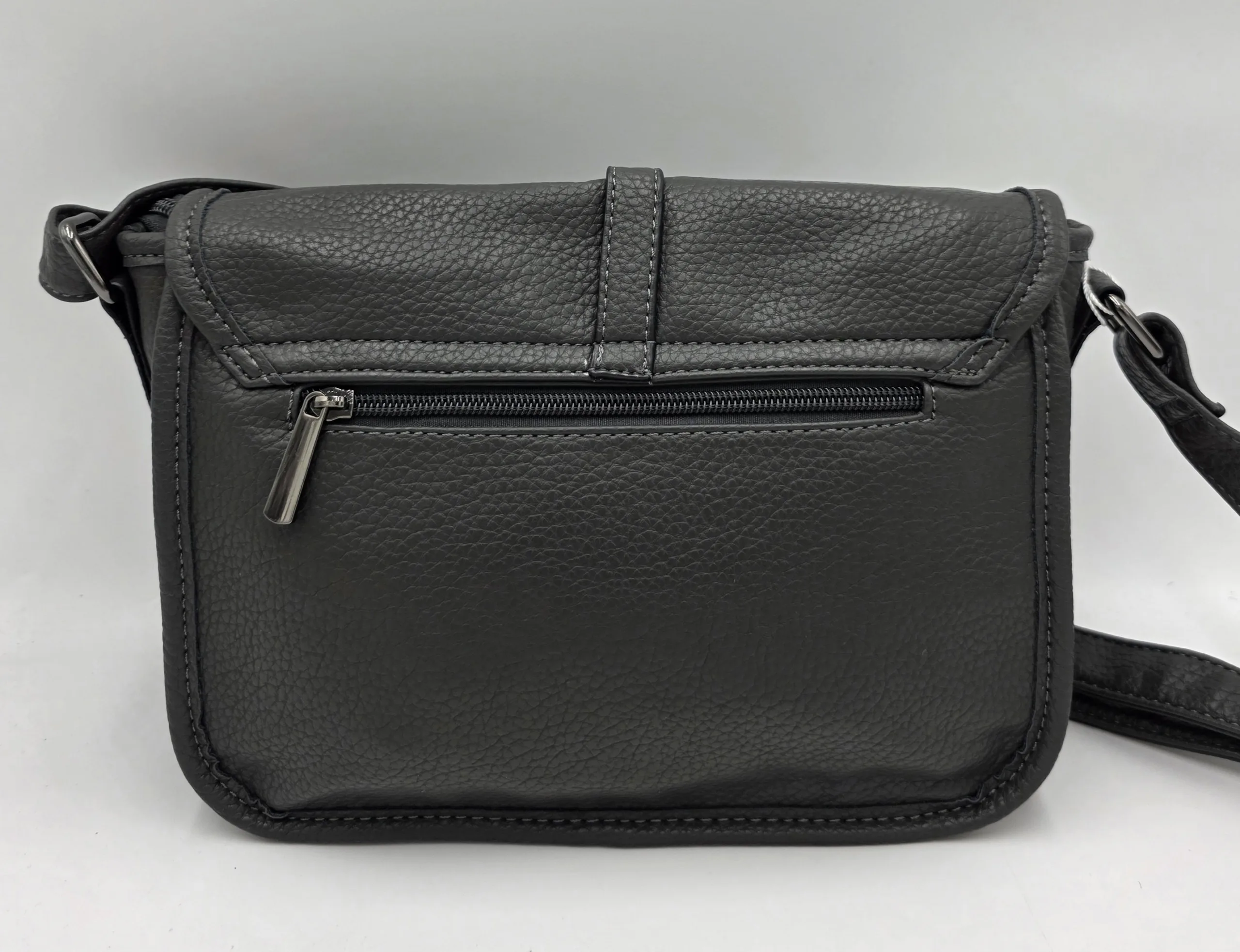 Чанта от еко кожа с дълга регулираща се дръжка 150см, с капак, под капака основна преграда закопчаване с цип и още един голям преден джоб, вътрешен джоб с цип и допълнителни джобове за телефон, външен заден джоб с цип,ширина 26см, височина 18см, дъно 26см/8см.