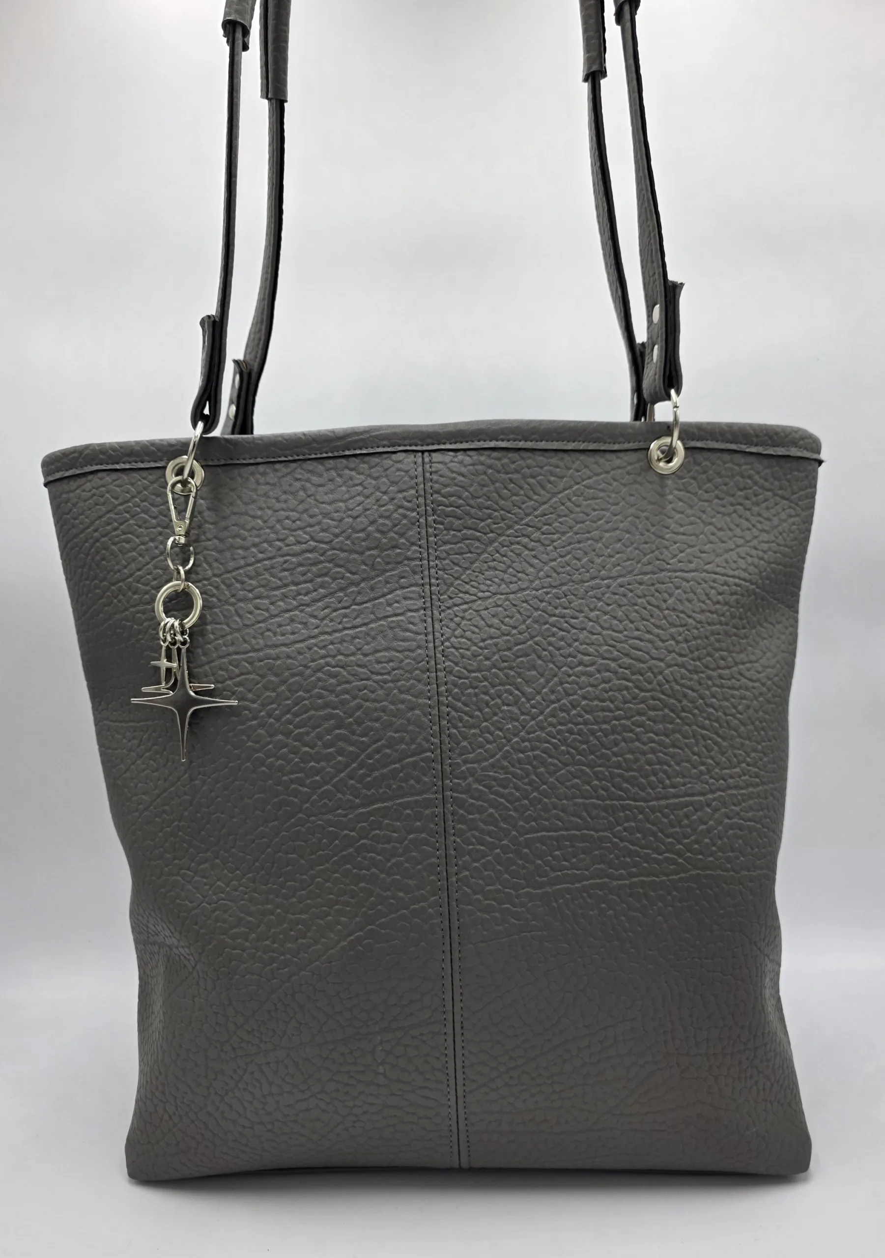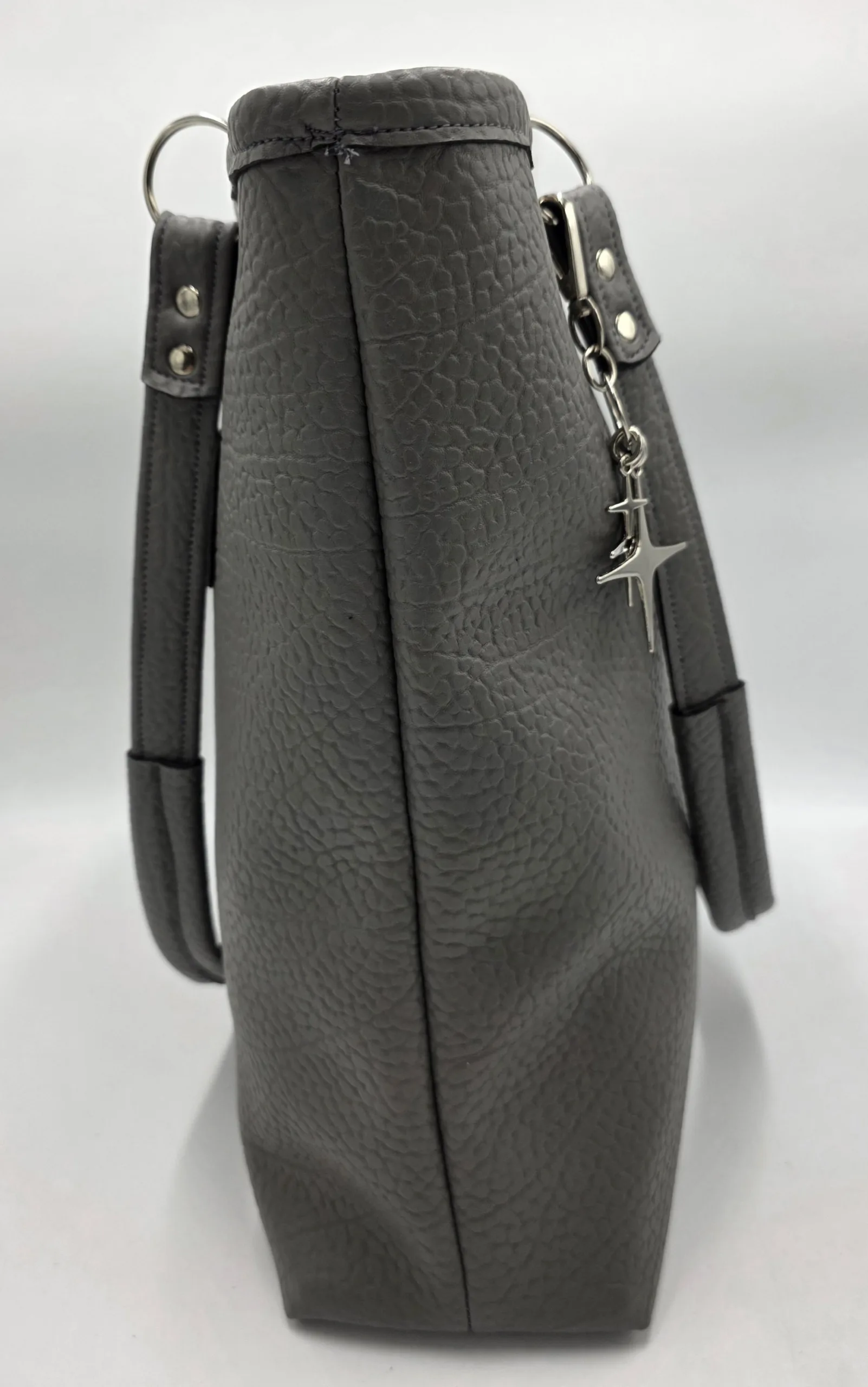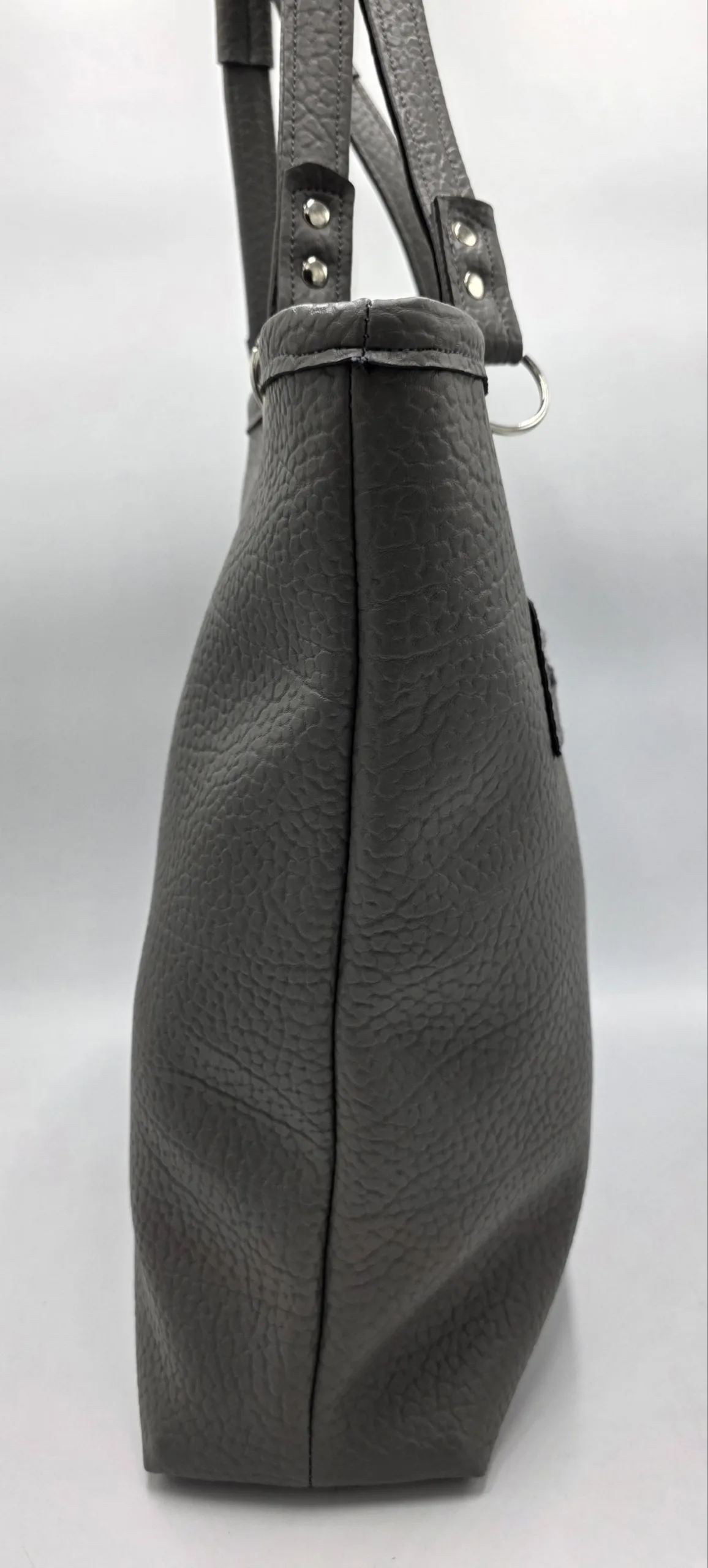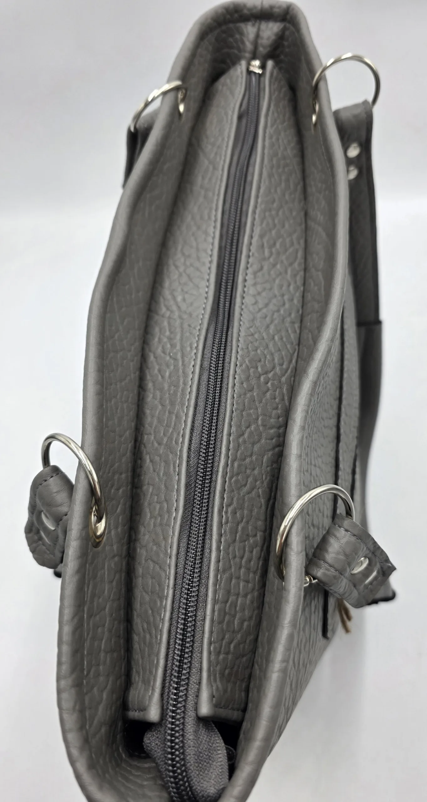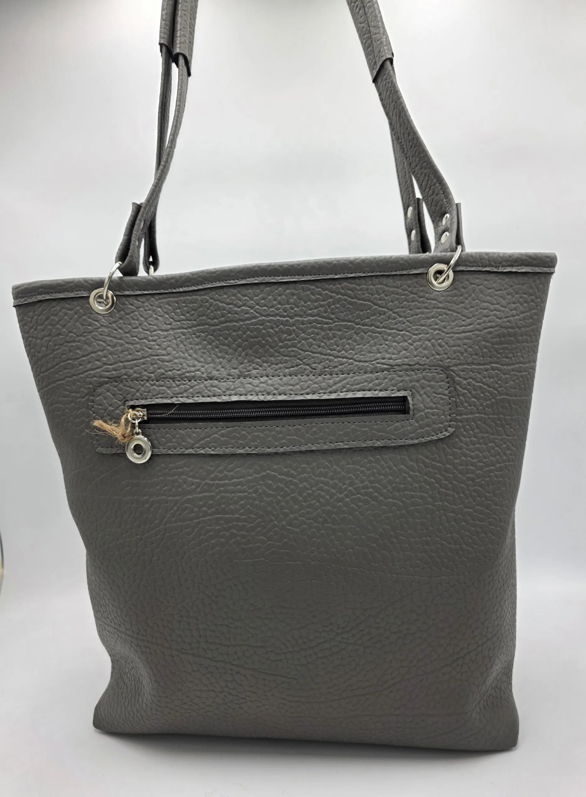 Голяма чанта от еко кожа с две дръжки 74см,вътрешен заден джоб с цип, закопчаване с цип, вътре със средна преграда с цип, вътрешен джоб с цип и допълнителен джоб за телефон, ширина 42см, височина 36см, дъно 33см/12см.