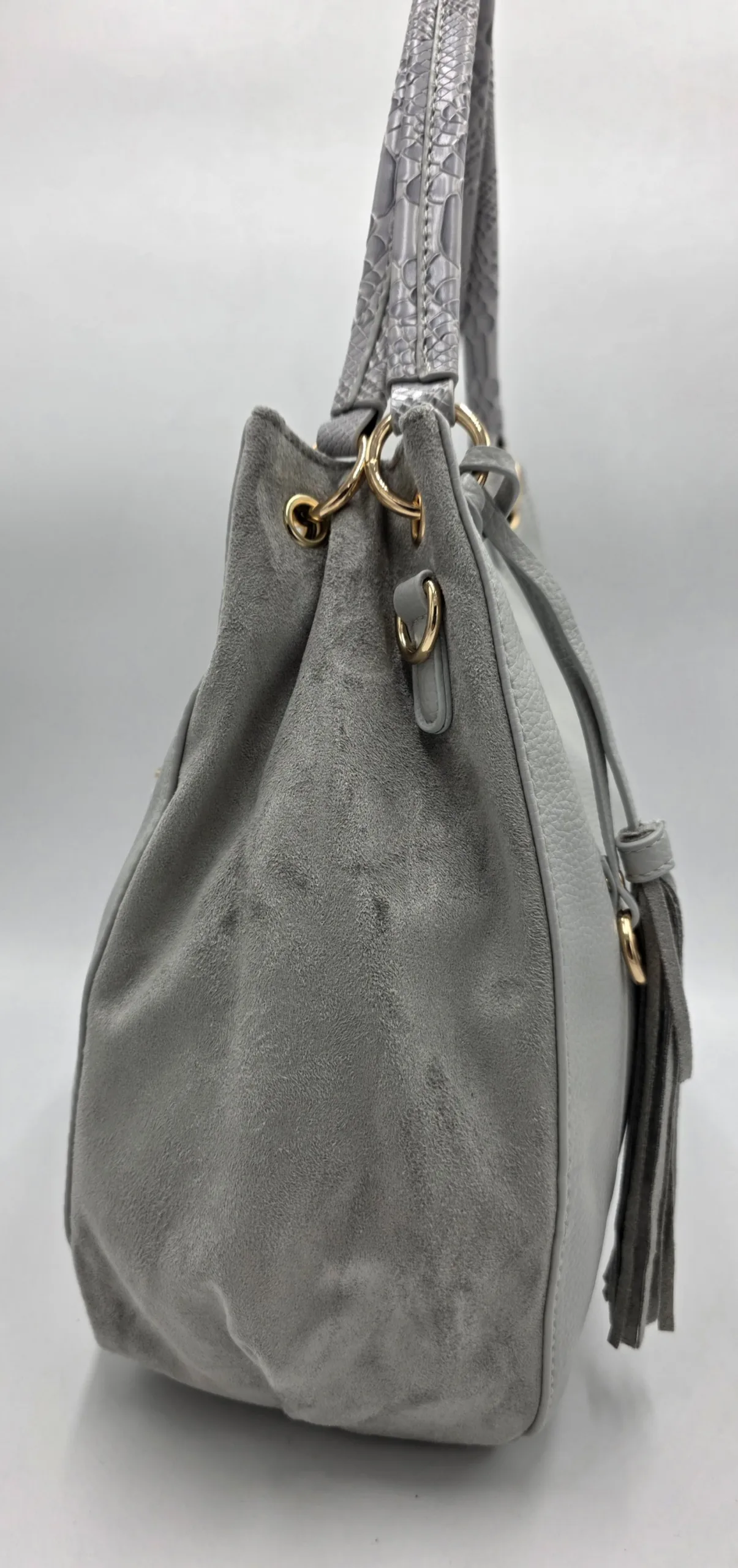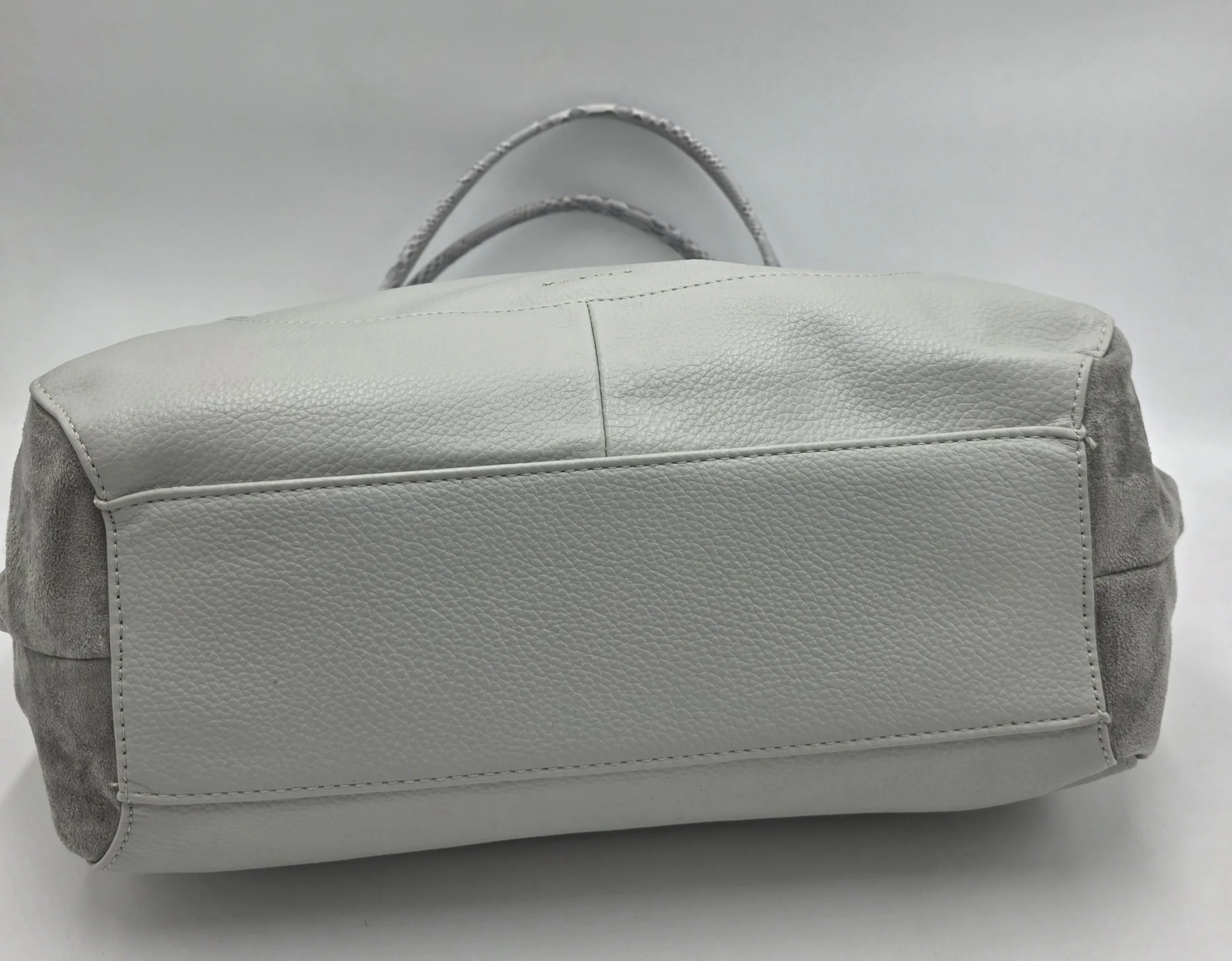 Чанта от еко кожа в комбинация с велур, с две дръжки 48см,допълнителна дълга регулираща се дръжка 150см, заден външен джоб с цип, закопчаване с цип, вътре със средна преграда с цип, вътрешен джоб с цип и допълнителни джобове за телефон, ширина 36см, 32см, дъно 28см/12см.