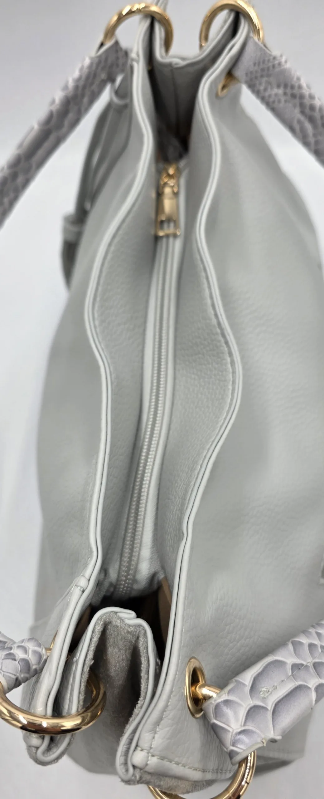 Чанта от еко кожа с нестандартна форма с две вързани регулиращи дръжки 120см максимална дължина, закопчава се с цип и