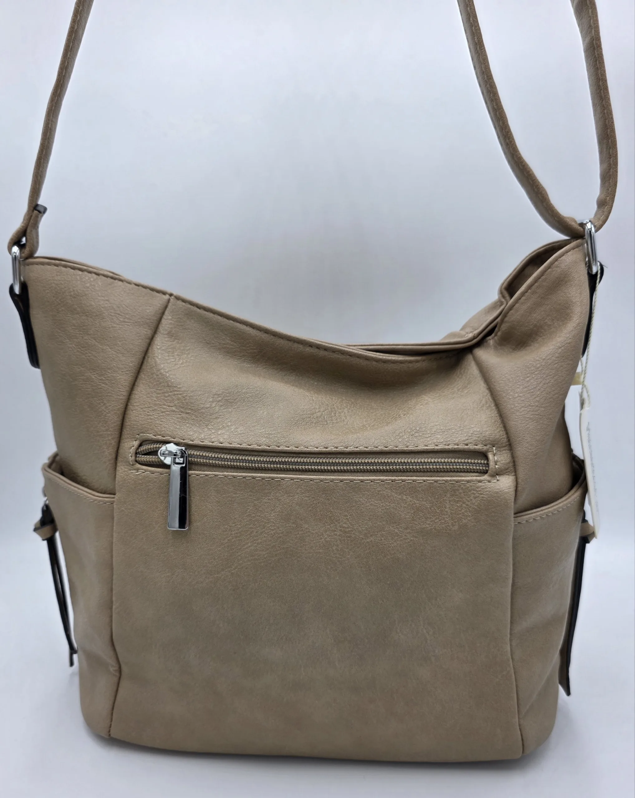 Чанта от еко кожа с външен заден джоб с цип, два странични джоба с магнит, закопчаване с цип, вътре със средна преграда с цип, джоб с цип и допълнителни джобове за телефон. Ширина 38см, височина 27см, дъно 30см/14см. Дълга регулираща се дръжка 150см.