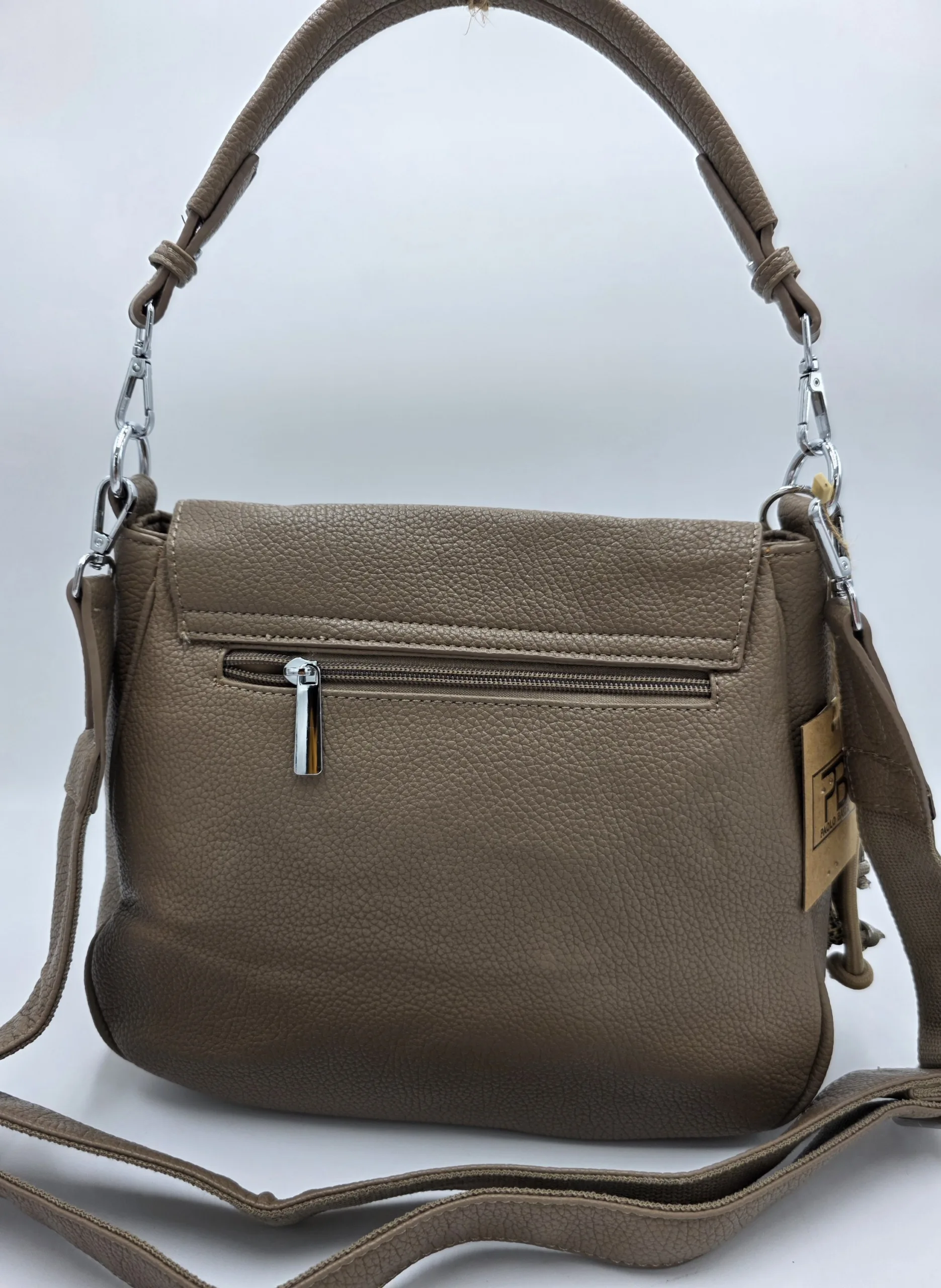 Чанта от еко кожа с капак и цип под капака, външен заден джоб с цип, вътрешен джоб с цип и допълнителни джобове за телефон, две заменями дръжки, късата 46см, дългата регулираща 150см .Ширина 30дм,височина 25см,дъно 27см/11см.