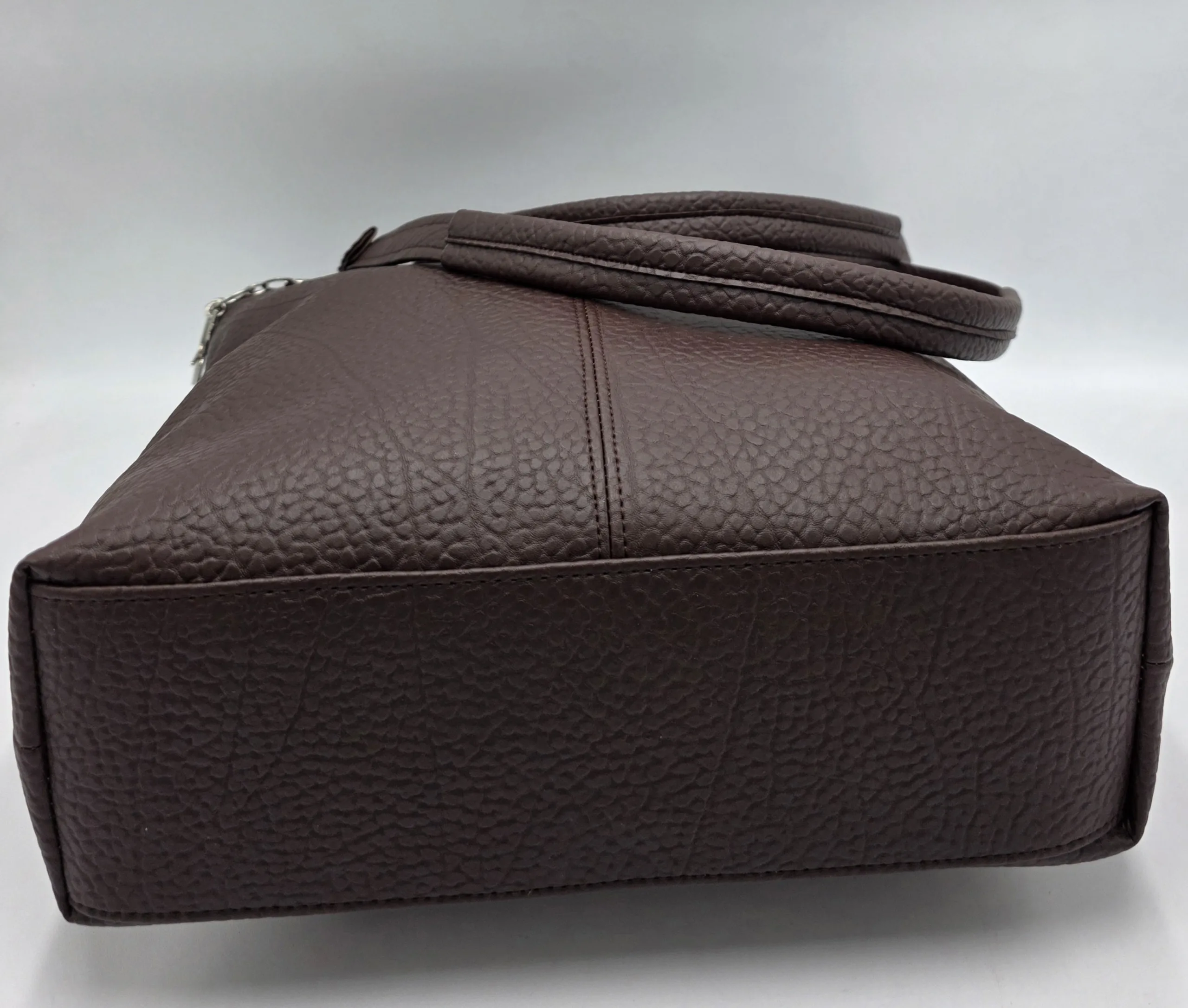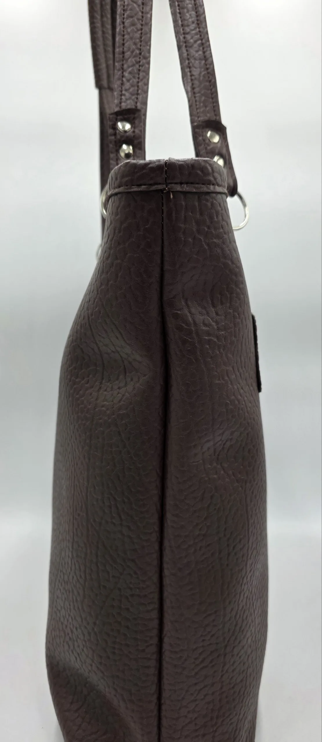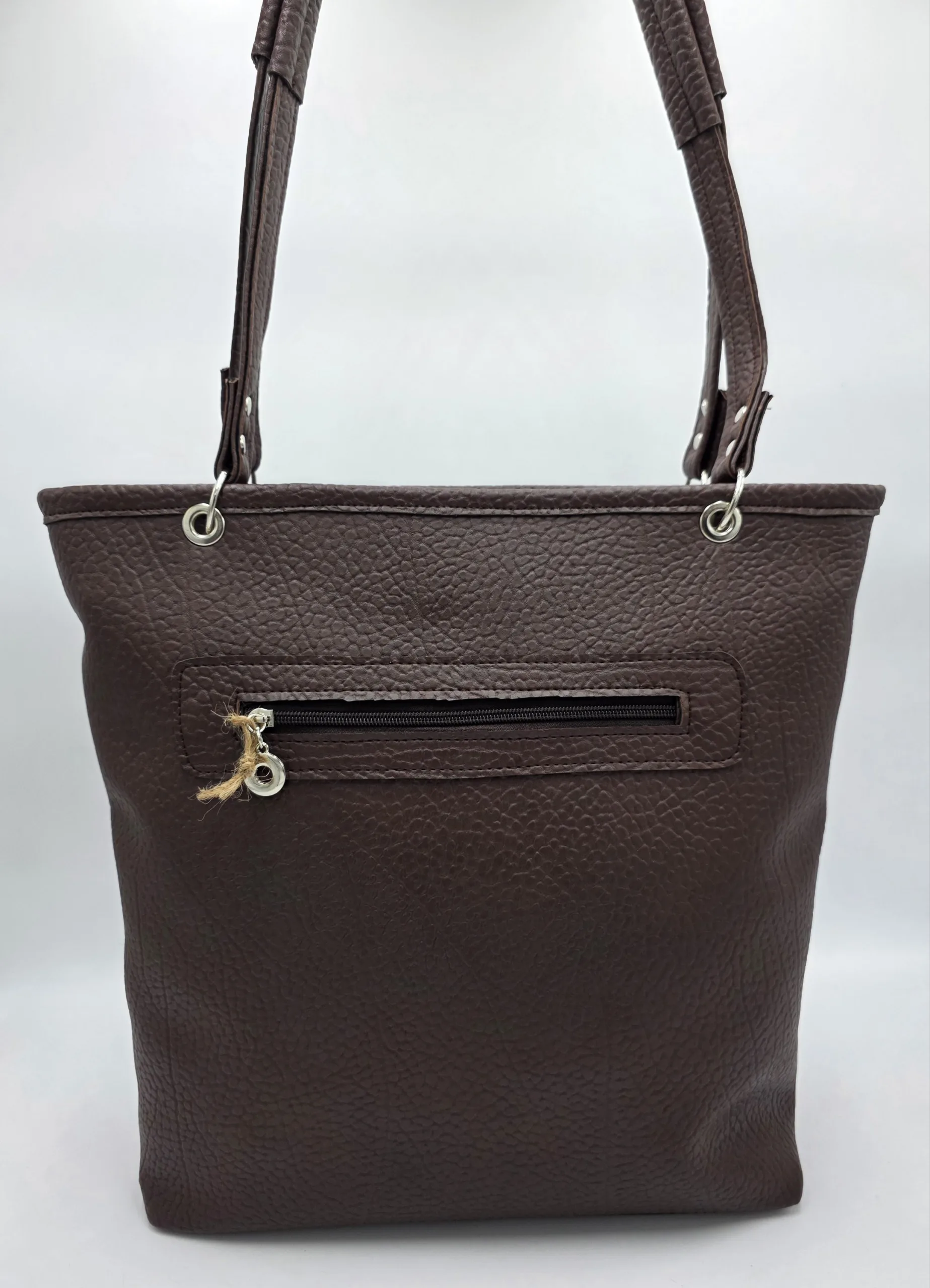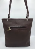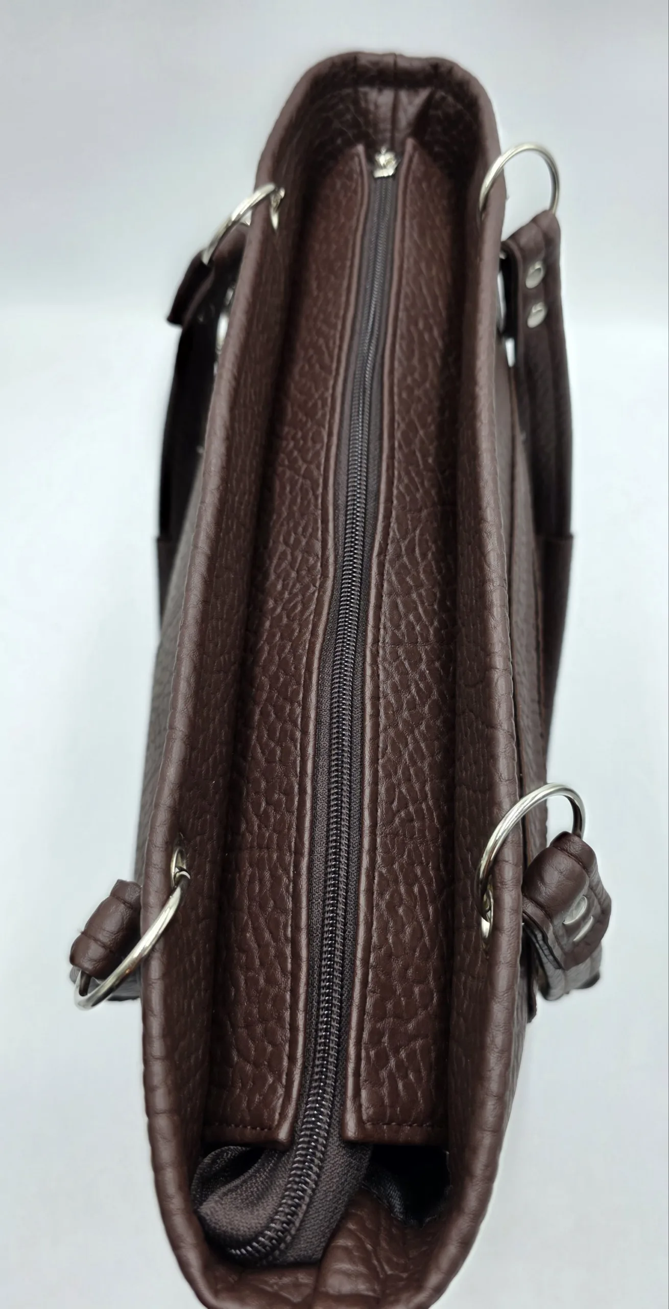 Голяма чанта от еко кожа с две дръжки 74см,вътрешен заден джоб с цип, закопчаване с цип, вътре със средна преграда с цип, вътрешен джоб с цип и допълнителен джоб за телефон, ширина 42см, височина 36см, дъно 33см/12см.