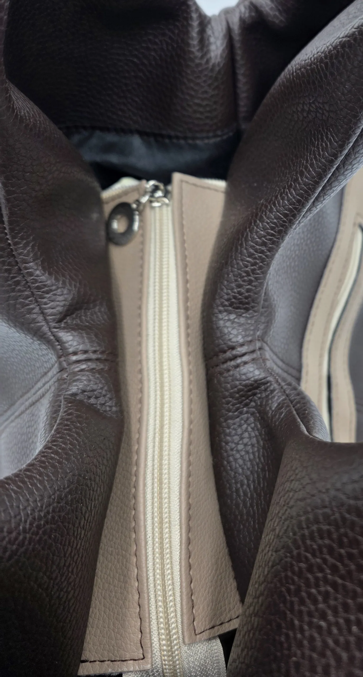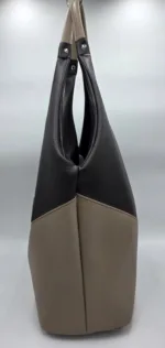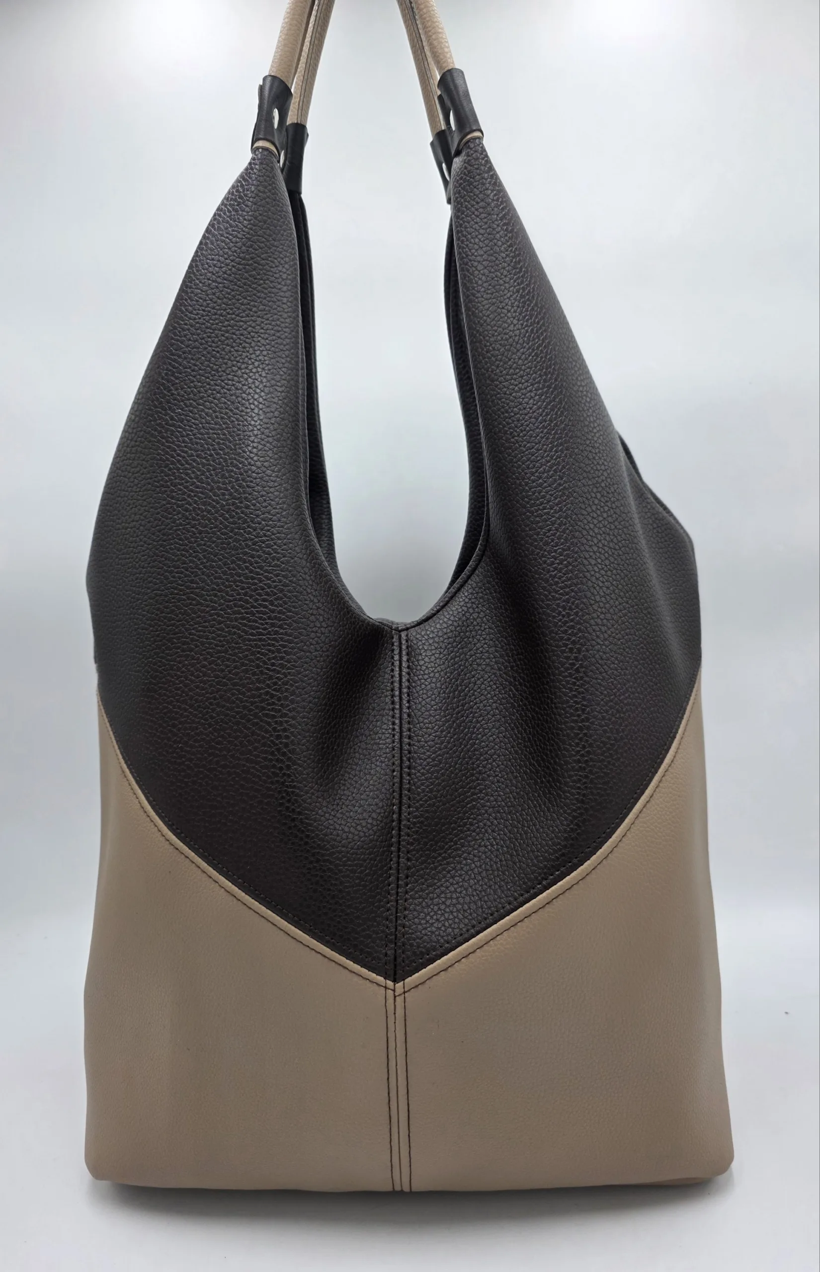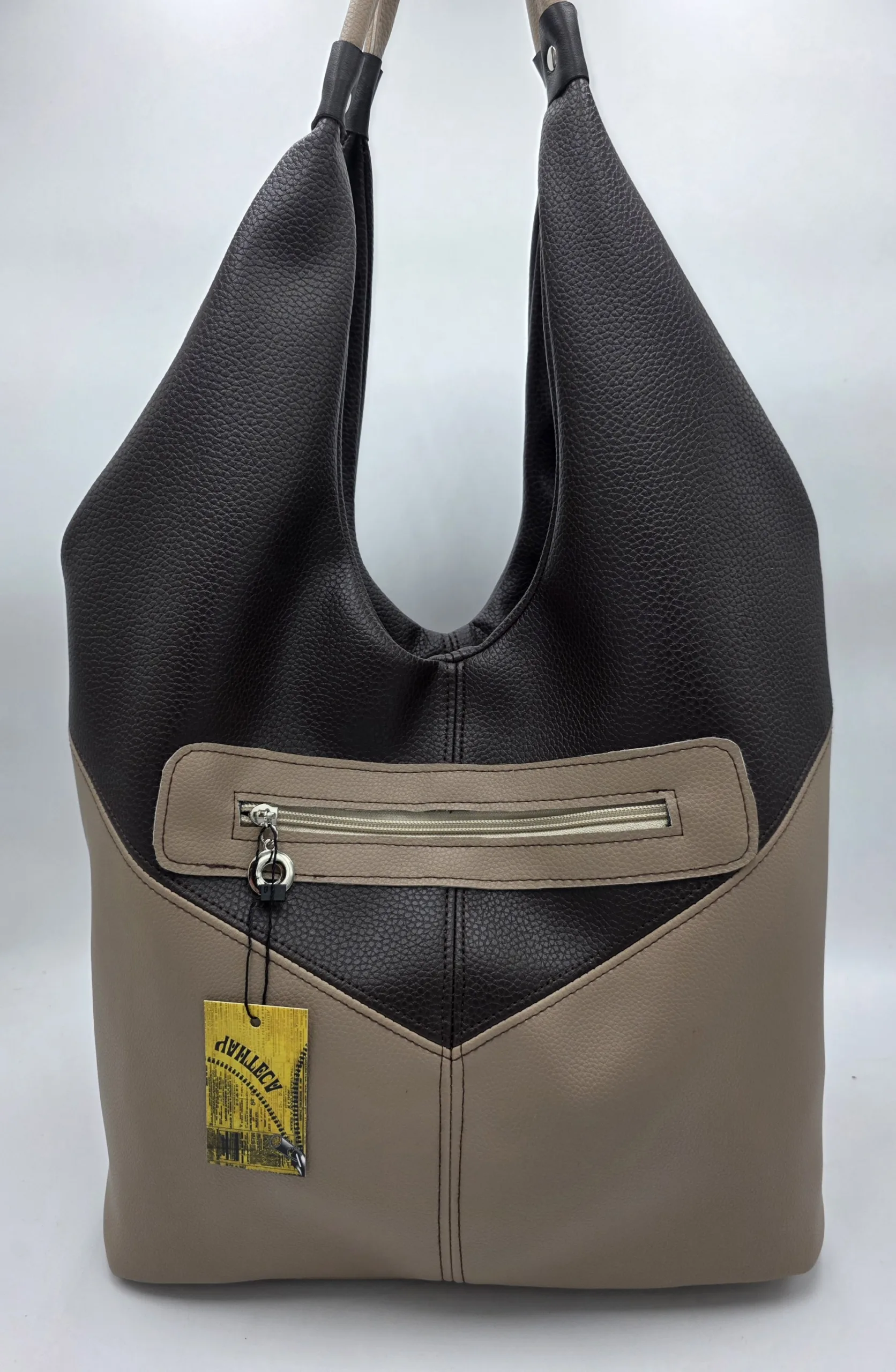 Чанта от еко кожа тип торба/голяма/ с две дръжки 65см, заден външен джоб с цип, закопчаване с цип, вътре със средна преграда с цип, джоб с цип и допълнителен джоб за телефон . Ширина 48см, височина 30см,дъно 34см/17см.