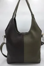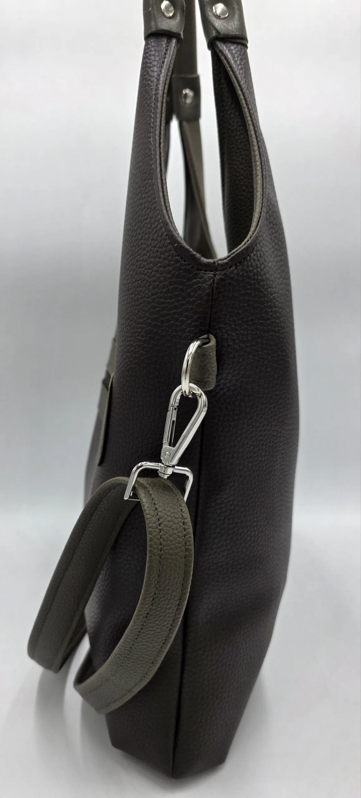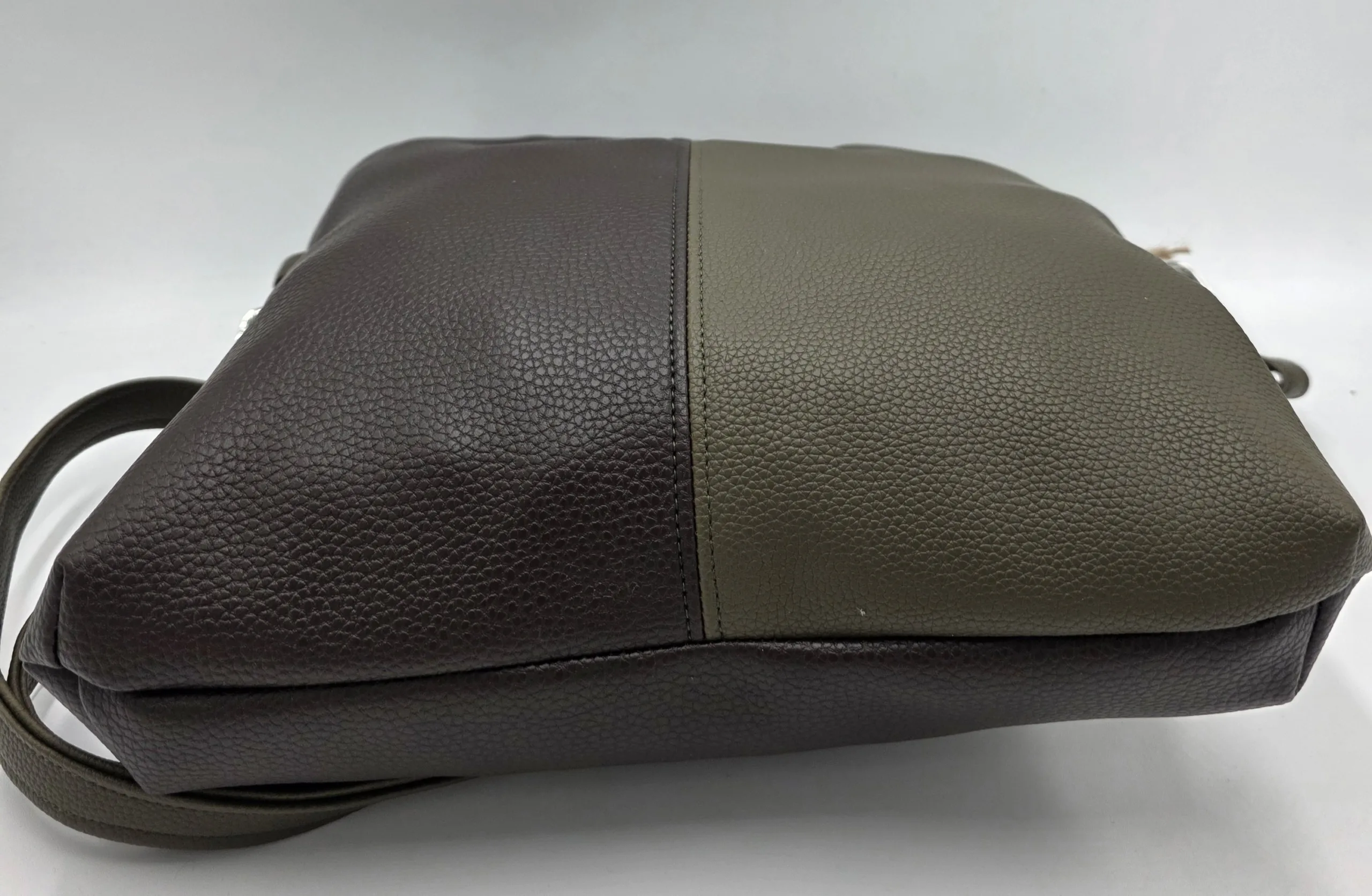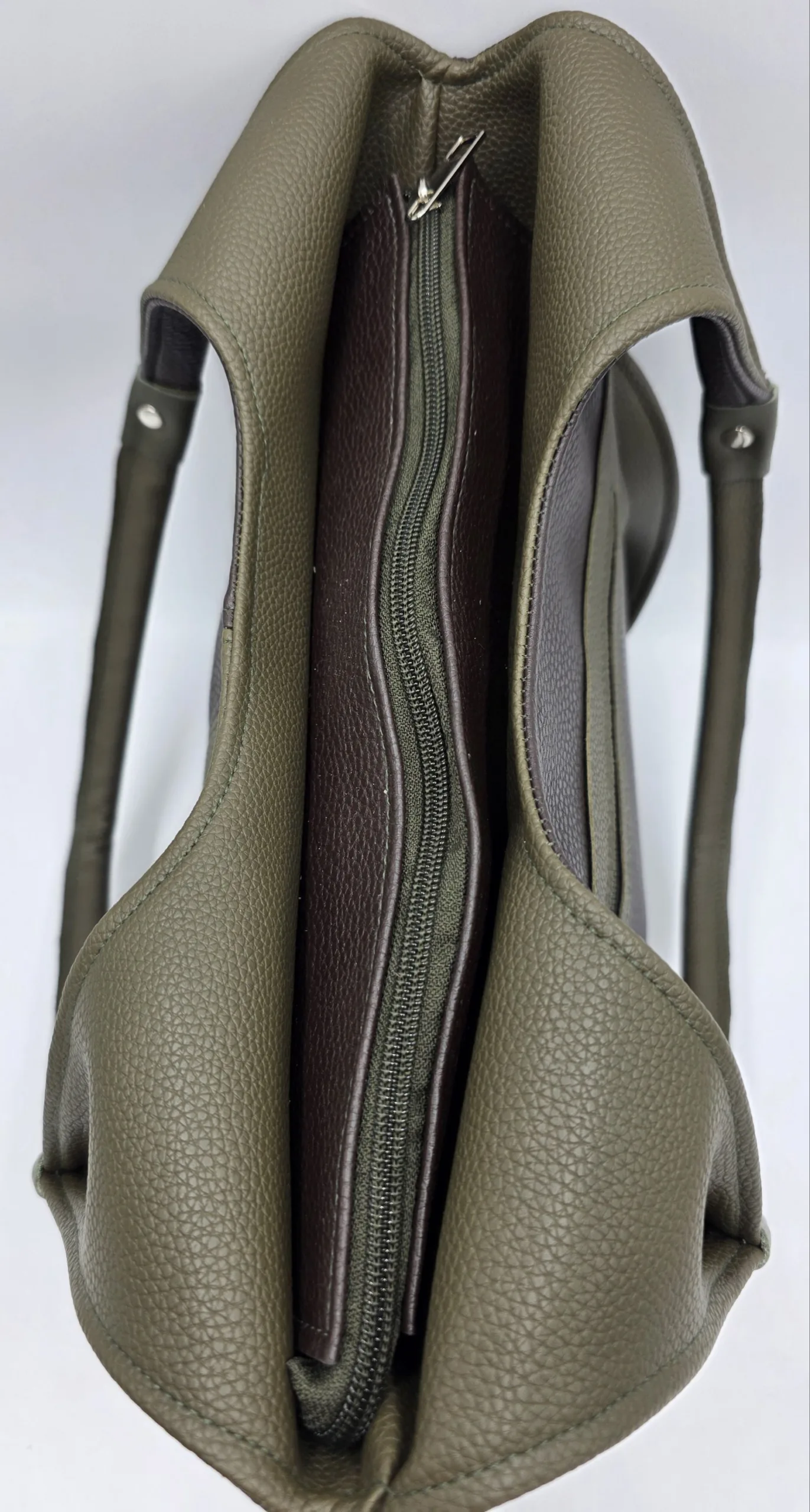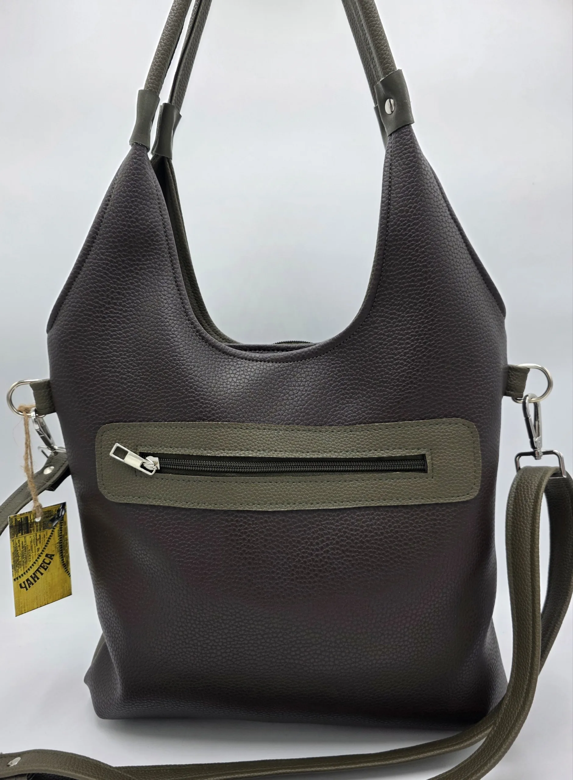 Чанта ръчна изработка от еко кожа с две дръжки 65см и допълнителна дълга регулираща се дръжка 150см, с външен заден джоб с цип 20см,вътре със средна преграда с цип ,вътрешен джоб с цип и допълнителен джоб за телефон. Ширина 32см,височина 30см,без оформено дъно