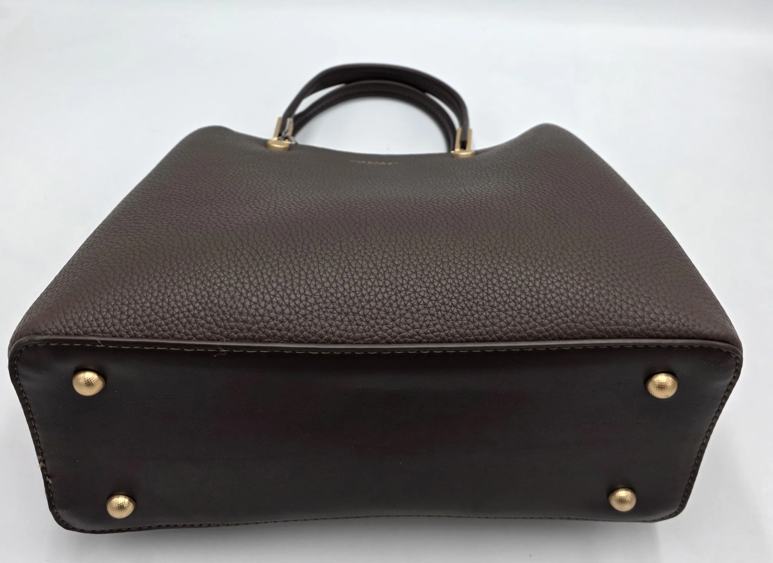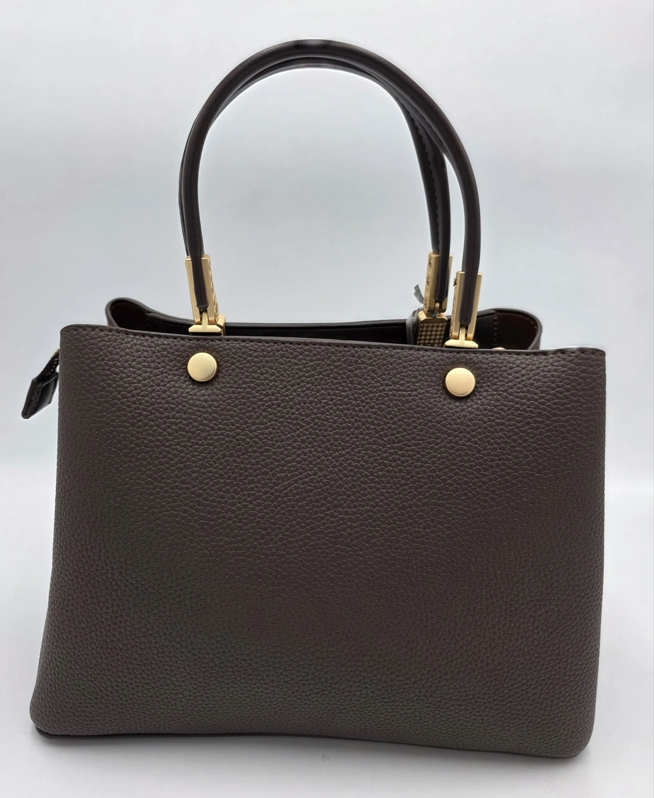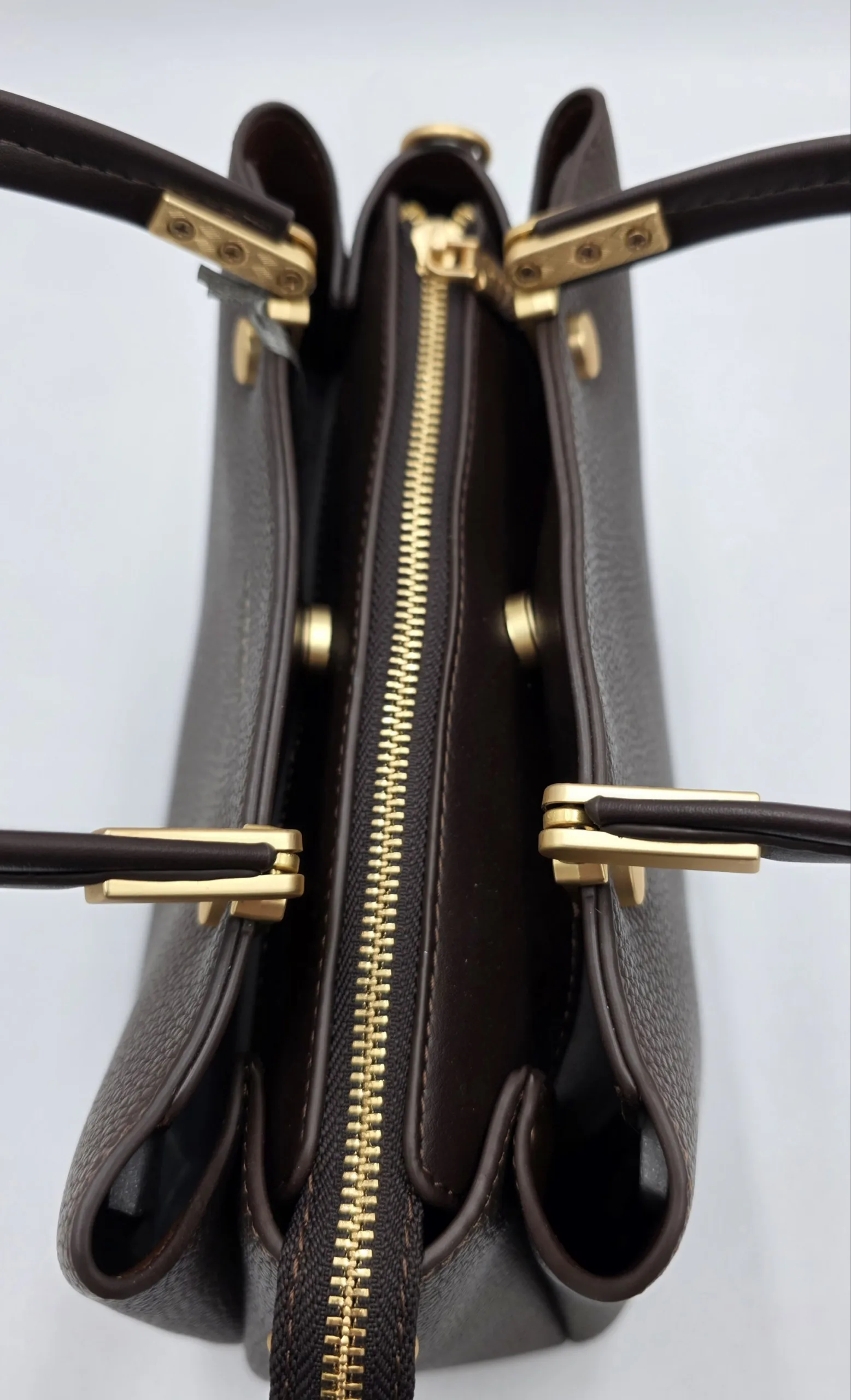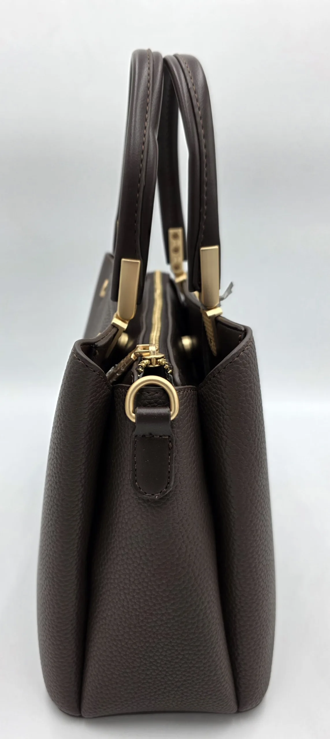 Елегантна чанта от еко кожа с три отделни прегради, едната с цип, две с магнит, две къси дръжки 32см,допълнителна дълга регулираща се дръжка 150см,външен джоб с цип и допълнителен джоб за телефон. Ширина 30см,височина 20см,дъно 28см/12см.