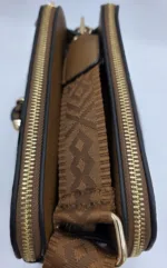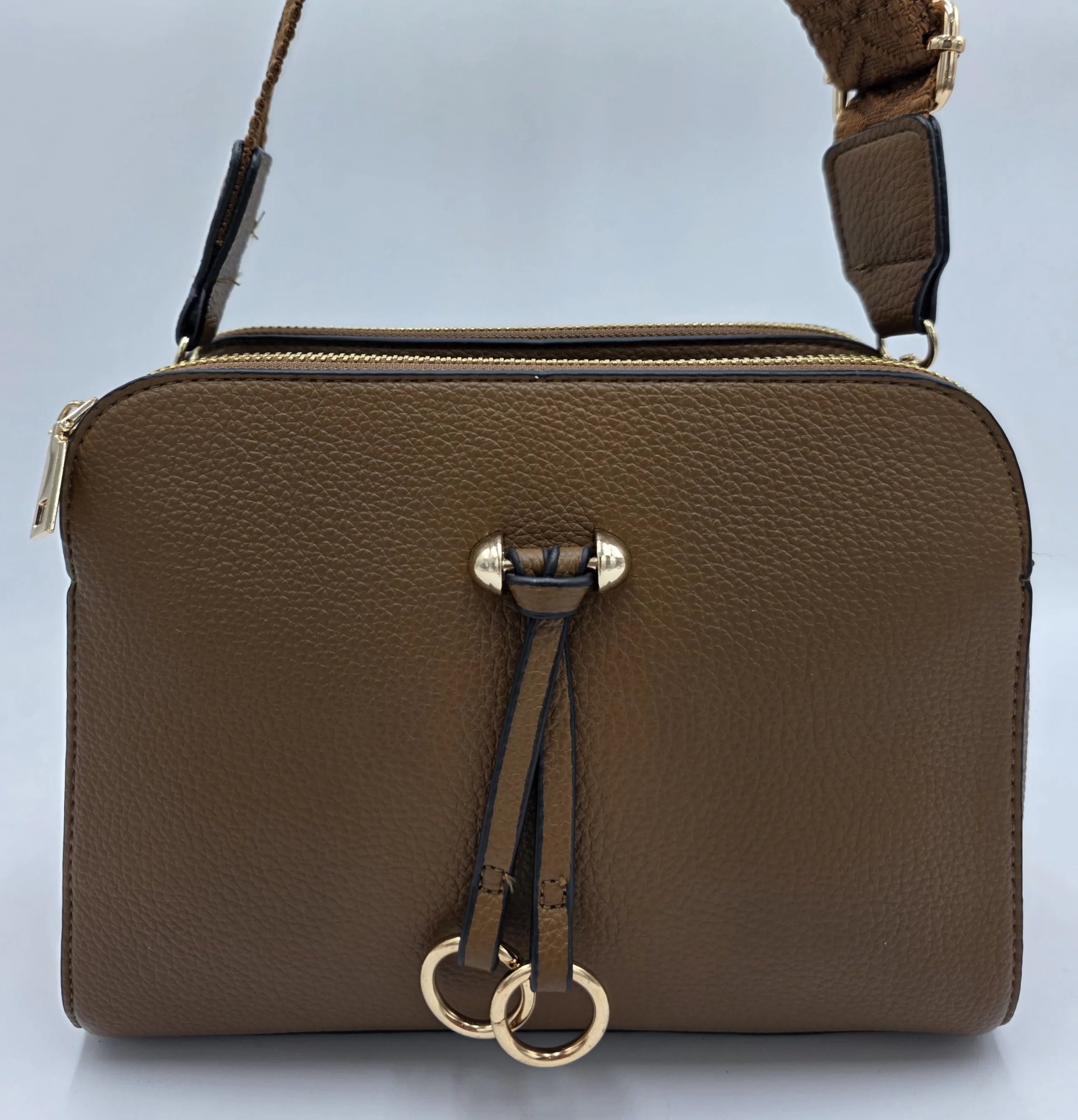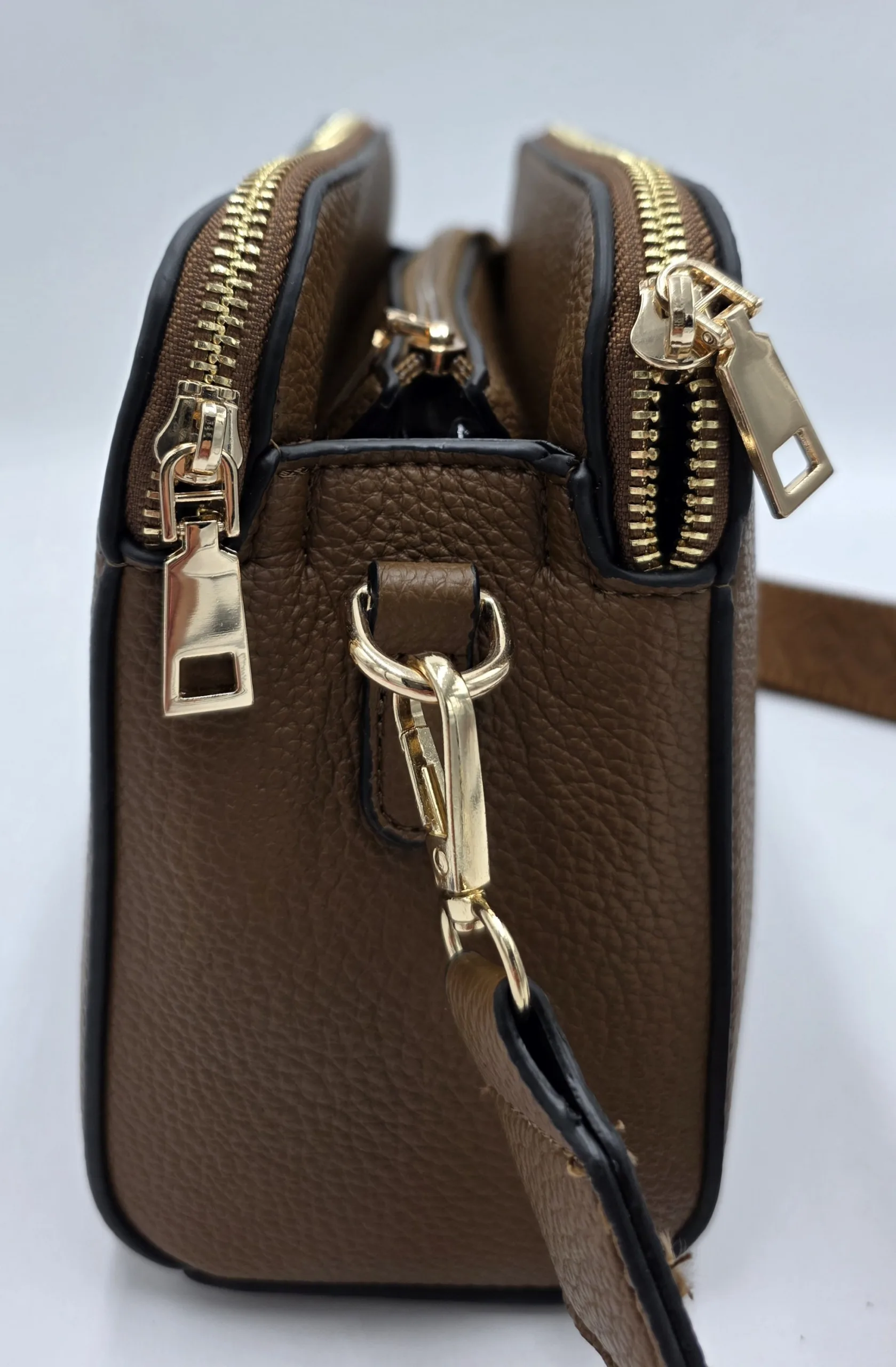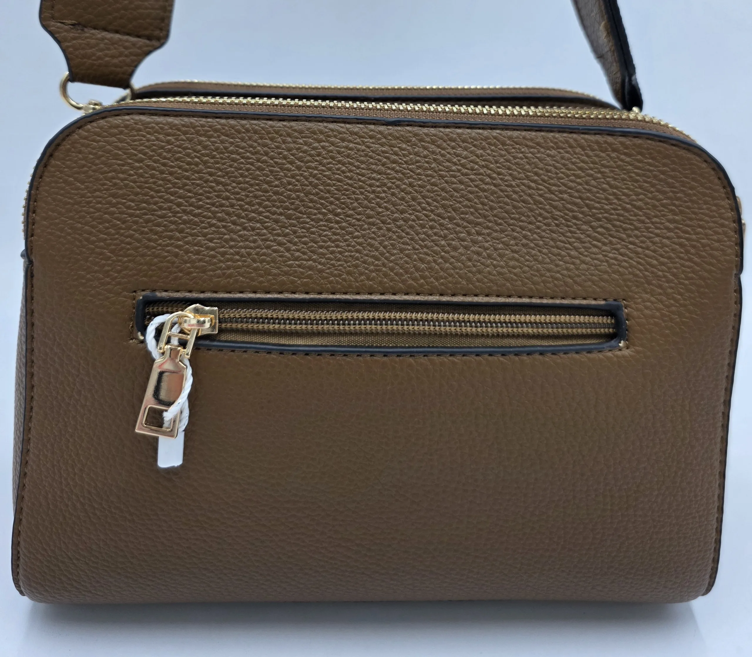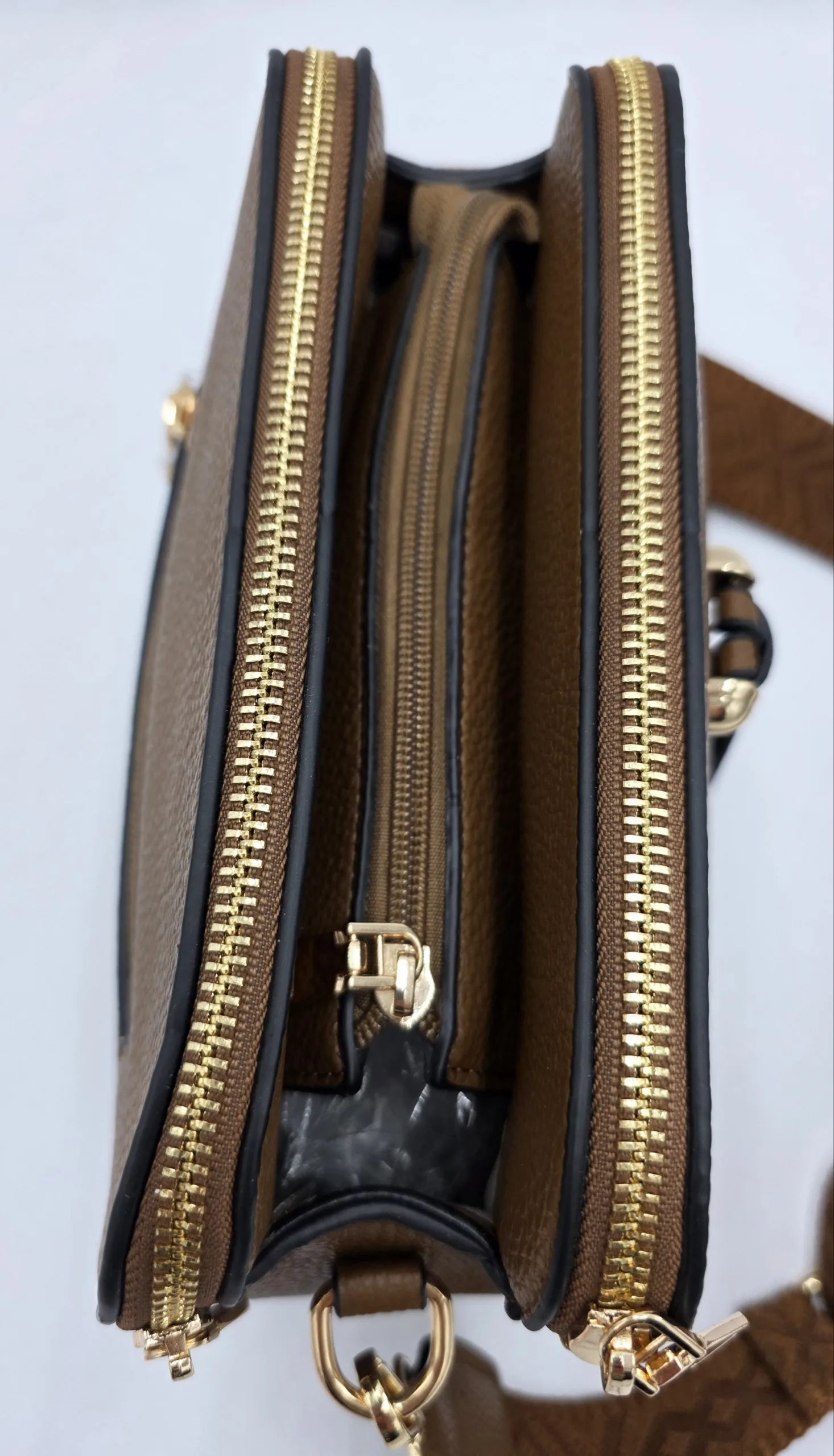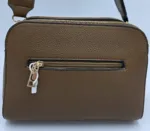 Малка чанта от еко кожа с три отделни прегради затварящи се с цип, заден външен джоб с цип, вътрешен джоб с цип и допълнителни джобове за телефон, дълга текстилна регулираща се дръжка 150см. Ширина 24см, височина 18см,дъно 24см/7см.
