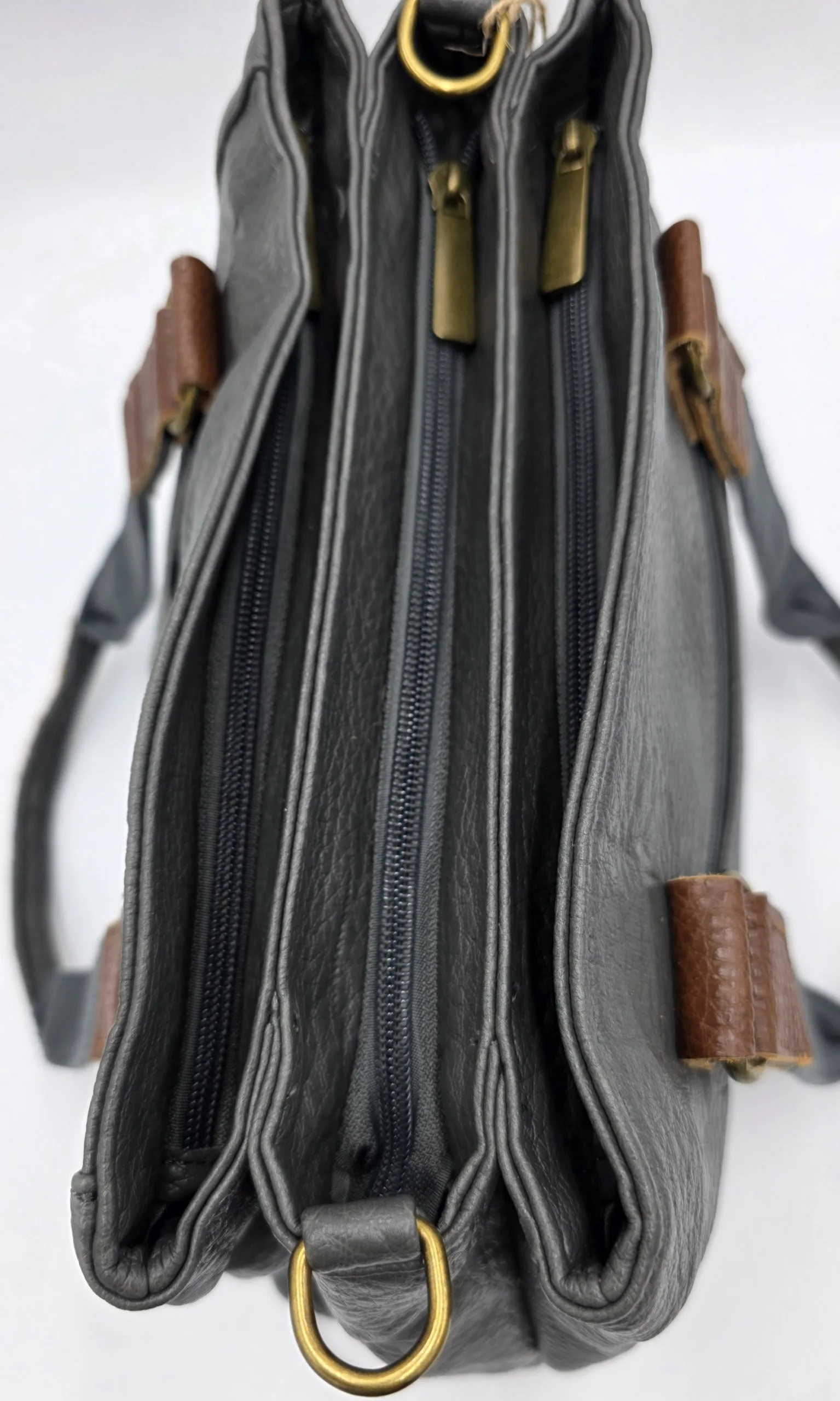 Чанта от еко кожа с три отделни прегради затварящи се с цип, две дръжки 55см, допълнителна дълга регулираща се дръжка 150см, преден джоб с магнит, заден външен джоб с цип, вътрешен джоб с цип и допълнителни джобове за телефон, ширина 37см,височина 24см,дъно 34см/12см.