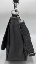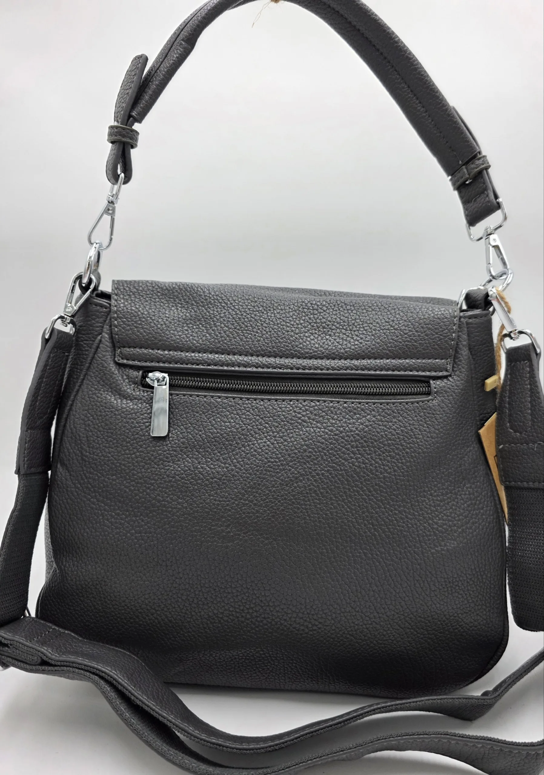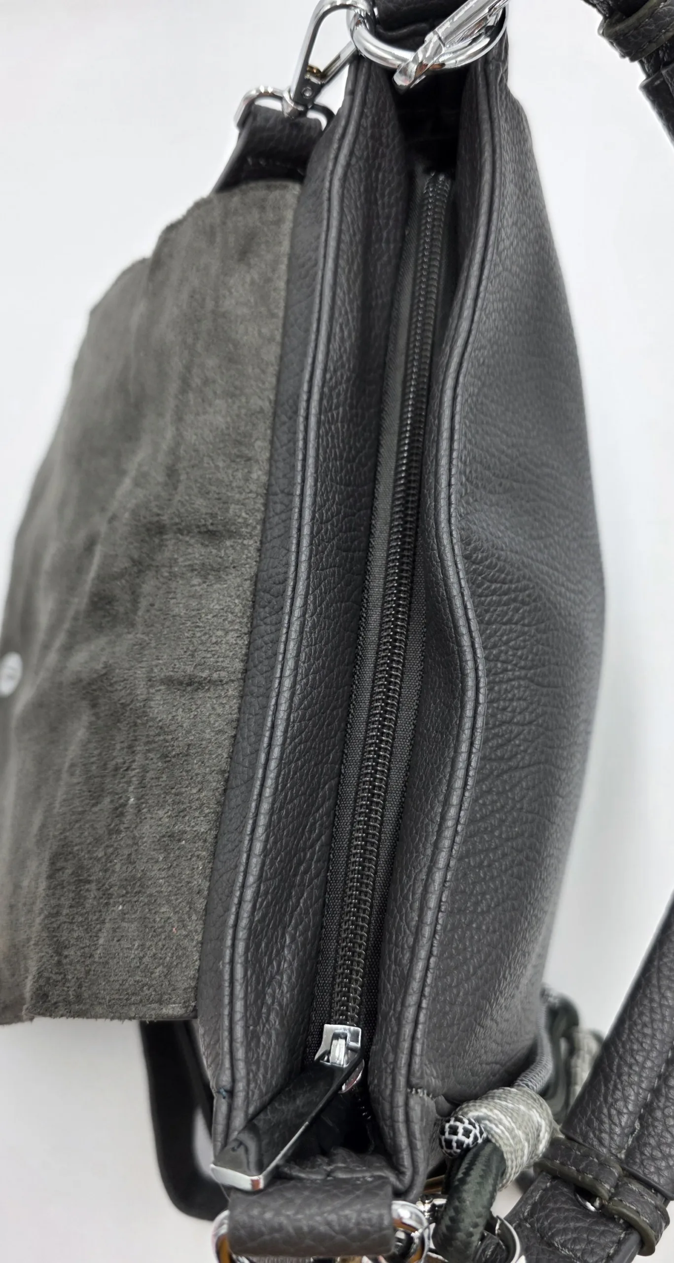 Чанта от еко кожа с капак и цип под капака, външен заден джоб с цип, вътрешен джоб с цип и допълнителни джобове за телефон, две заменями дръжки, късата 46см, дългата регулираща 150см .Ширина 30дм,височина 25см,дъно 27см/11см.