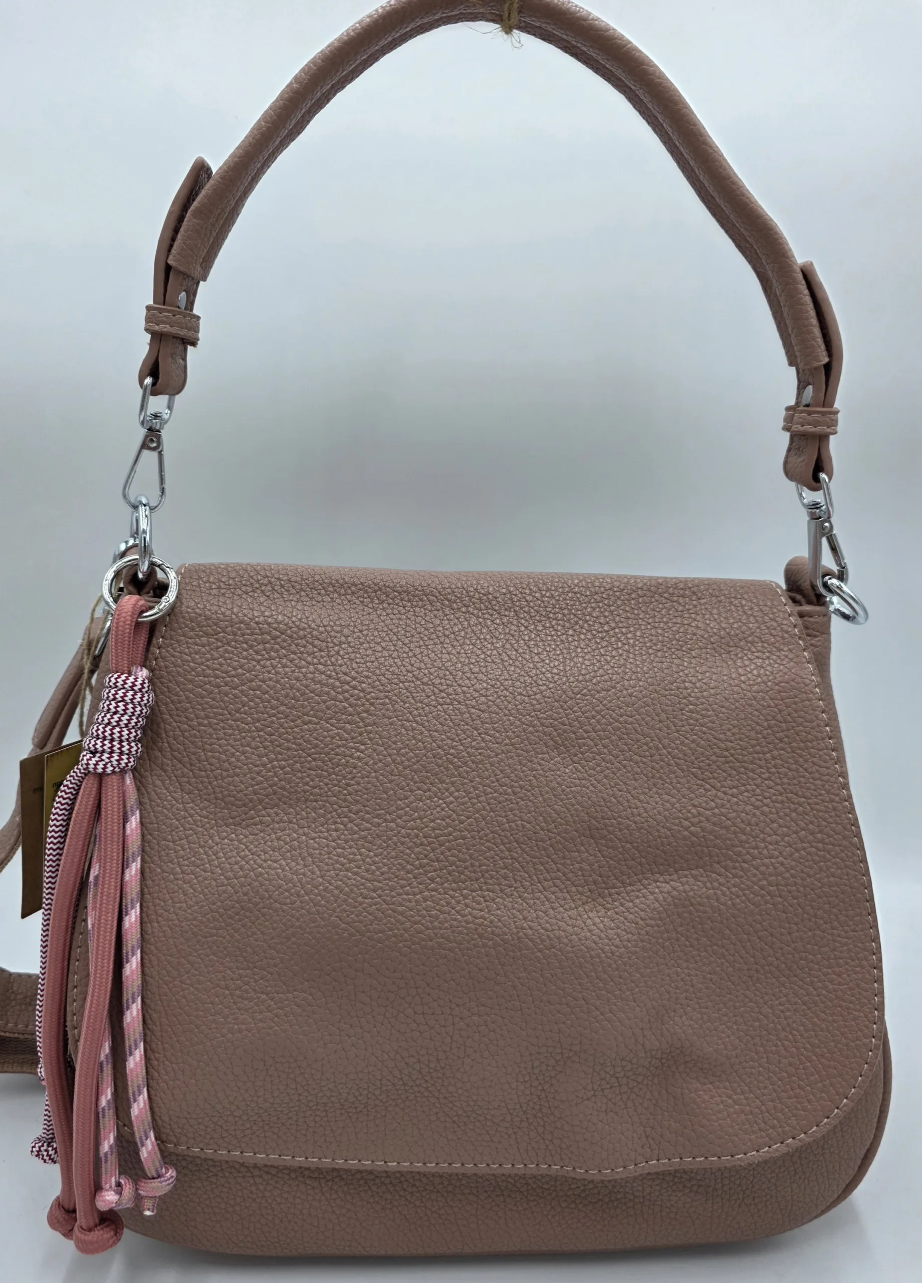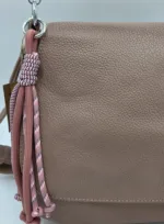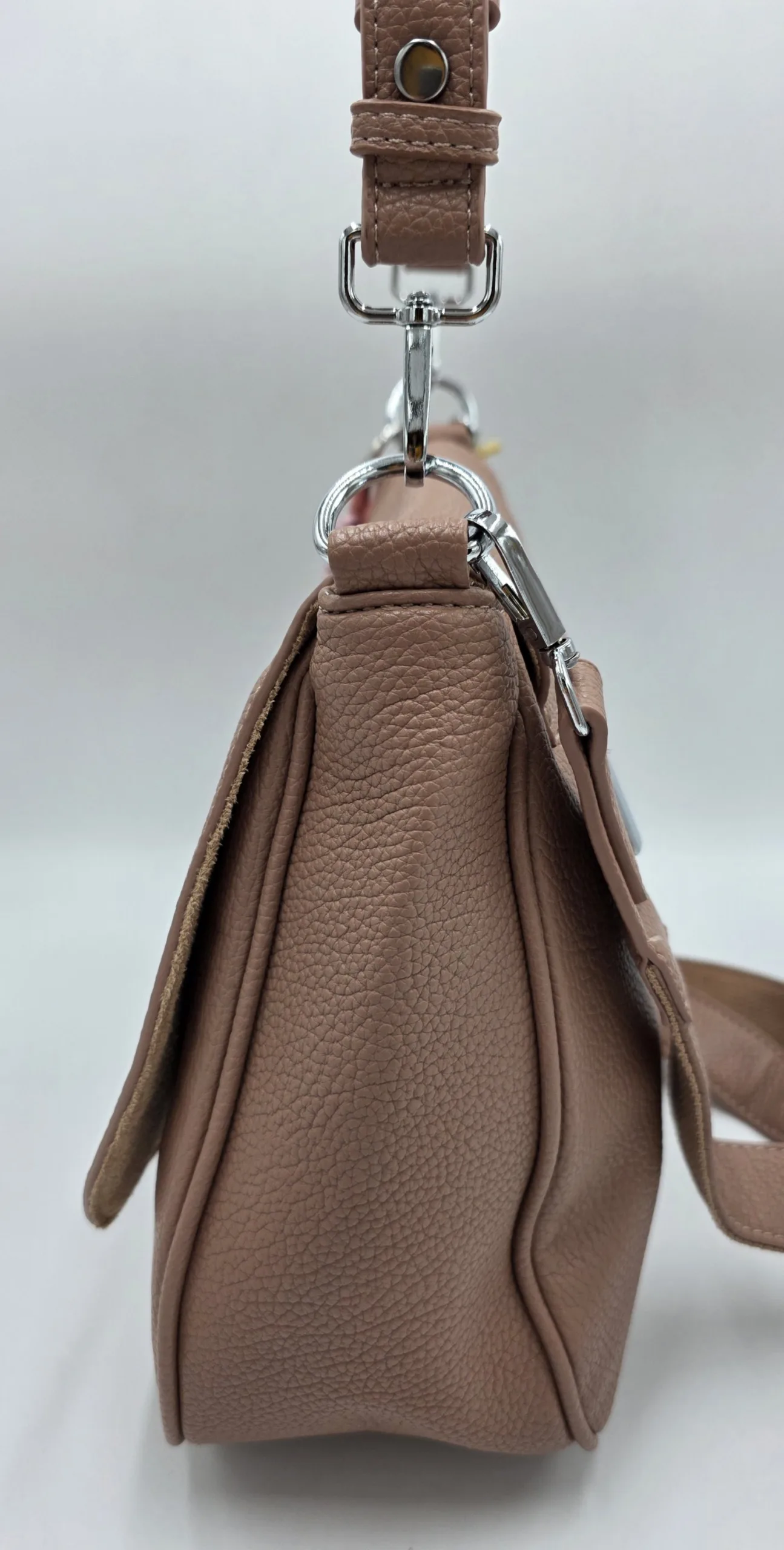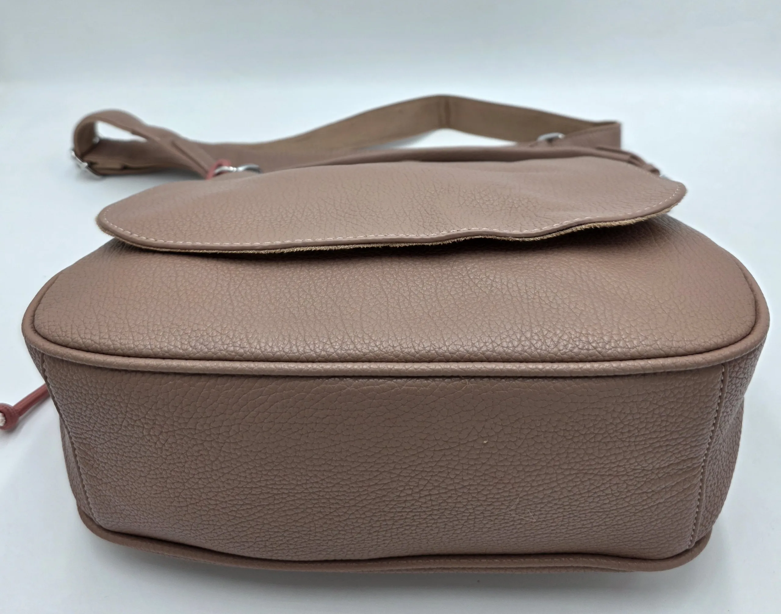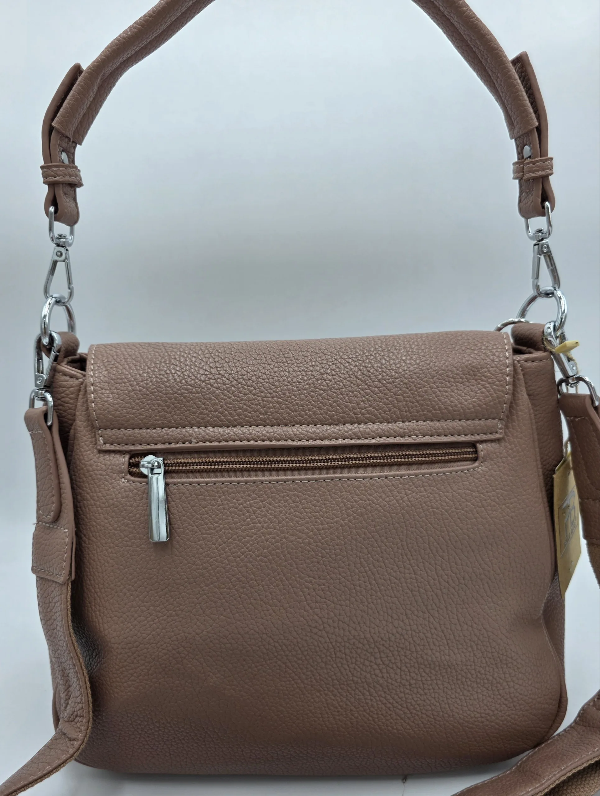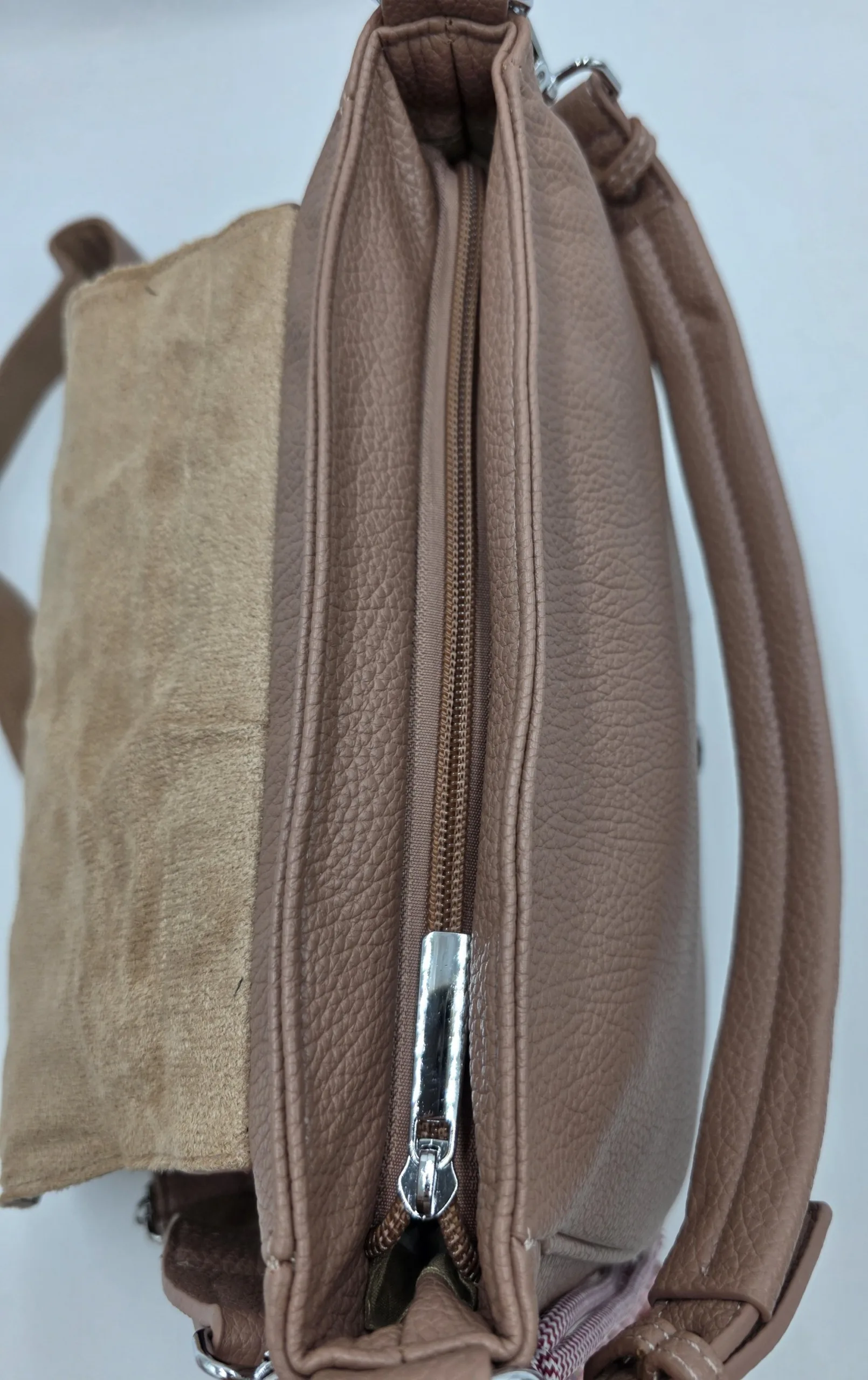 Чанта от еко кожа с капак и цип под капака, външен заден джоб с цип, вътрешен джоб с цип и допълнителни джобове за телефон, две заменями дръжки, късата 46см, дългата регулираща 150см .Ширина 30дм,височина 25см,дъно 27см/11см.