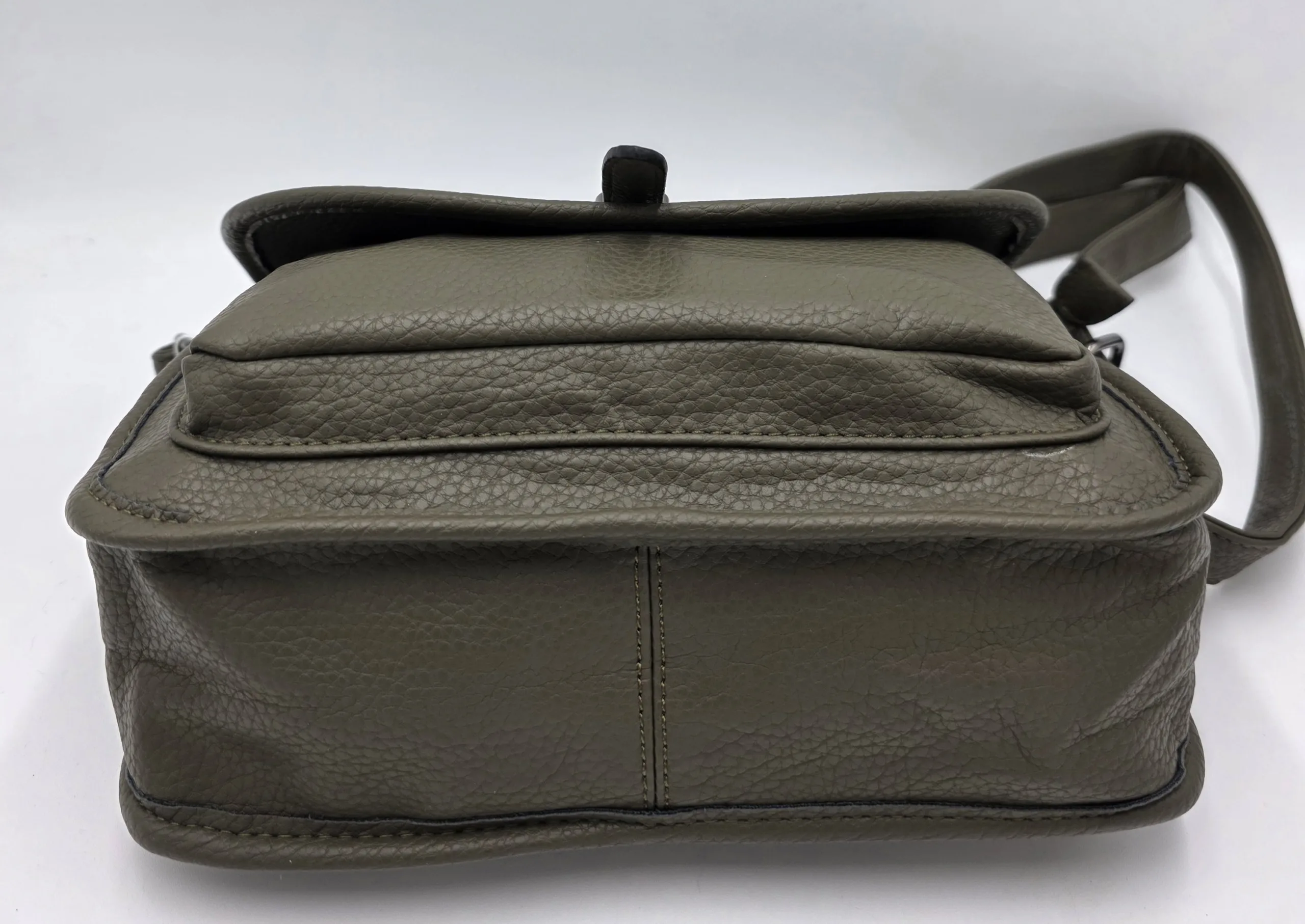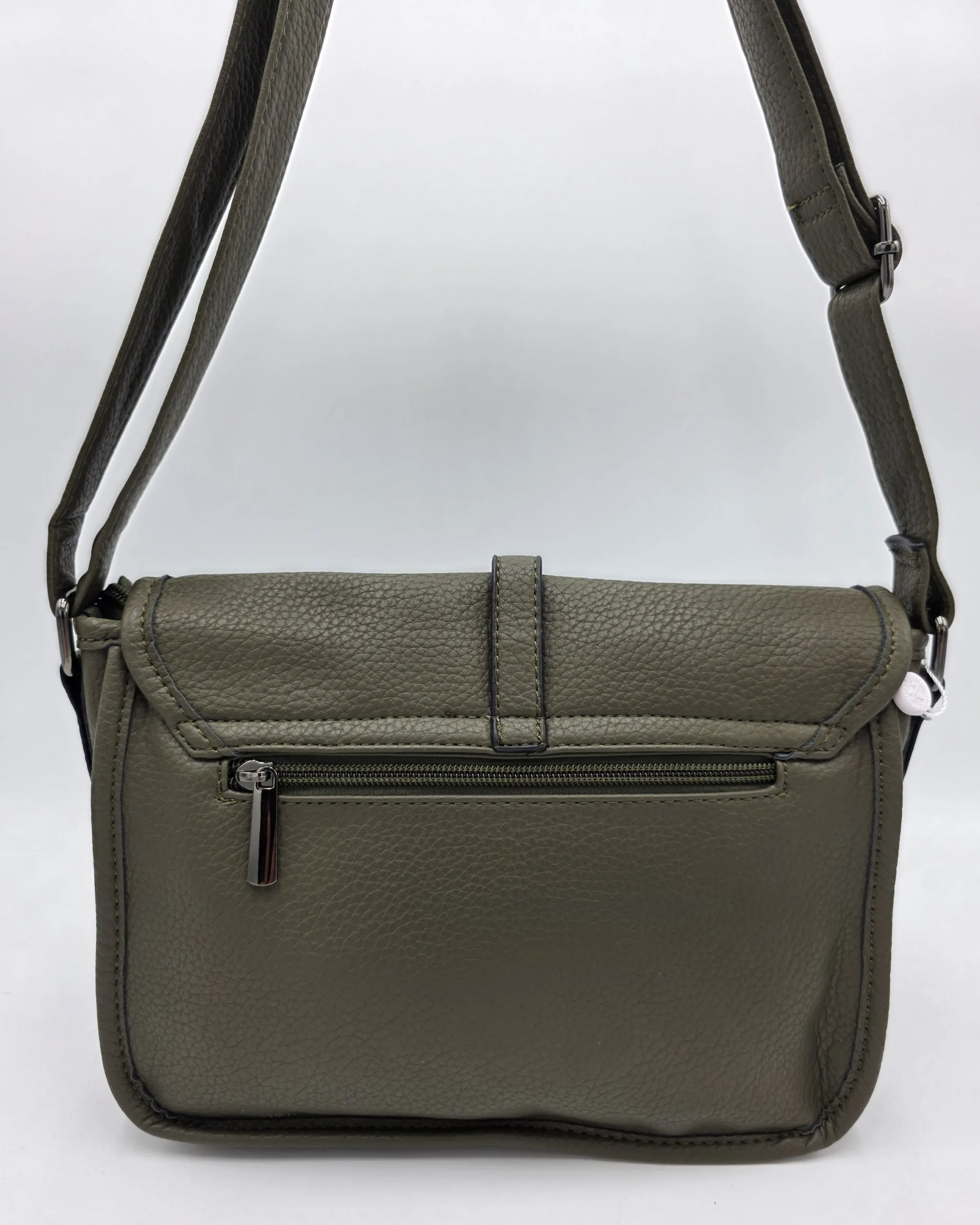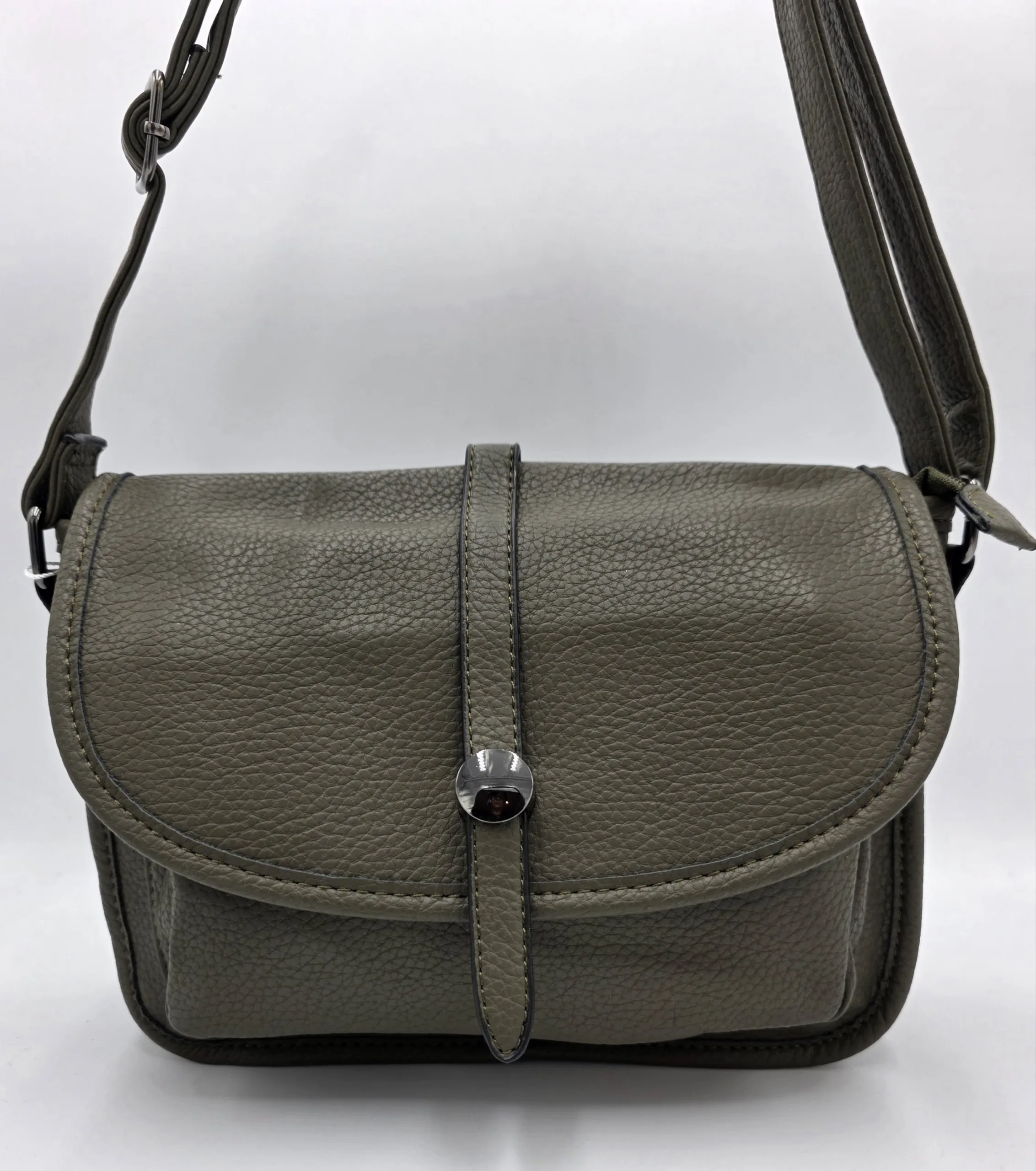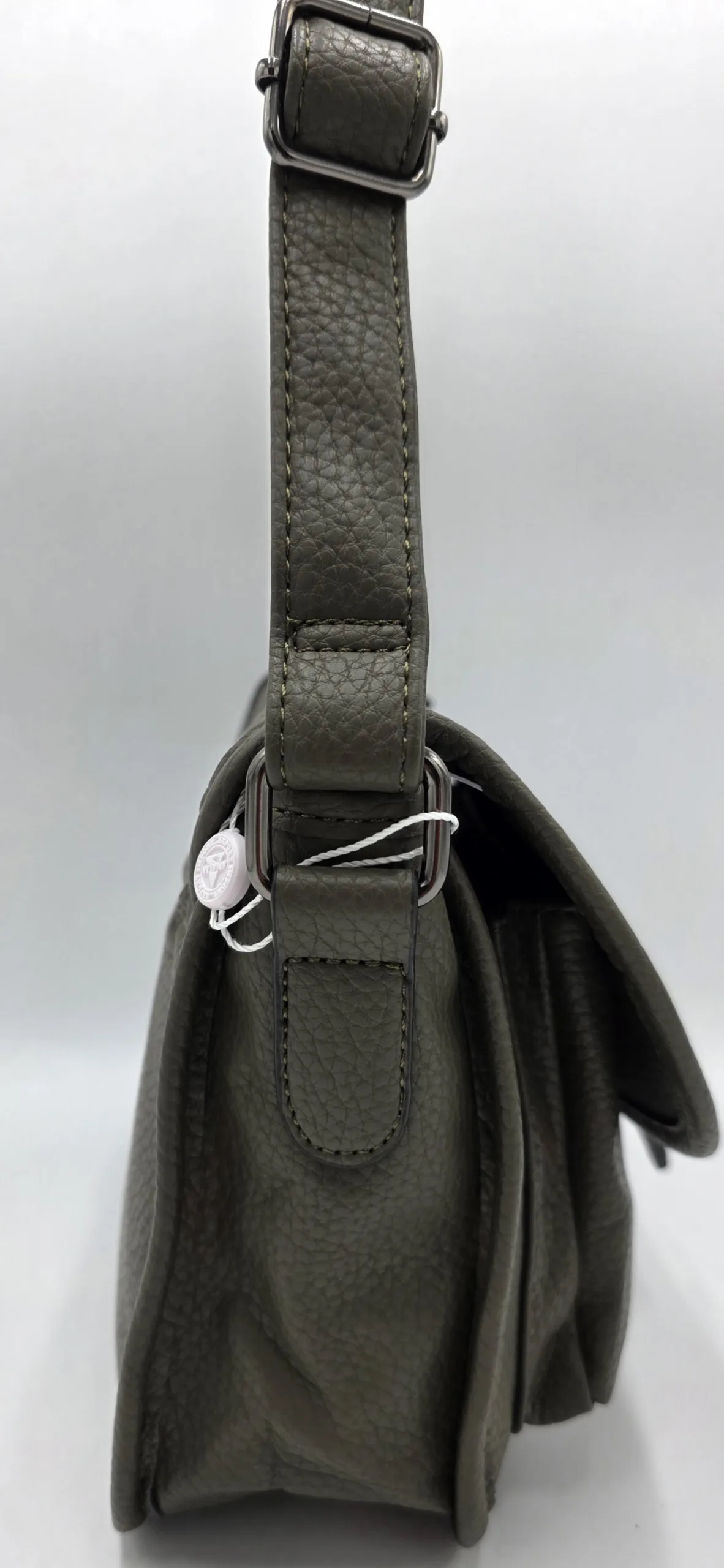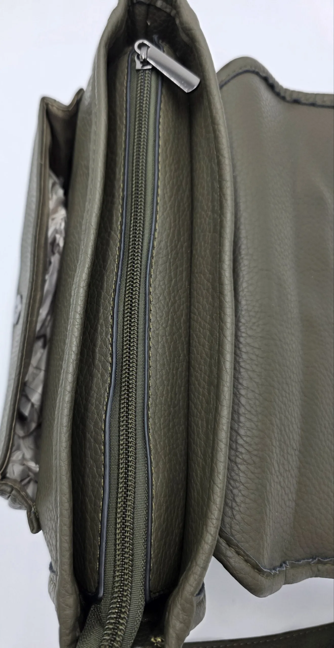 Чанта от еко кожа с дълга регулираща се дръжка 150см, с капак, под капака основна преграда закопчаване с цип и още един голям преден джоб, вътрешен джоб с цип и допълнителни джобове за телефон, външен заден джоб с цип,ширина 26см, височина 18см, дъно 26см/8см.
