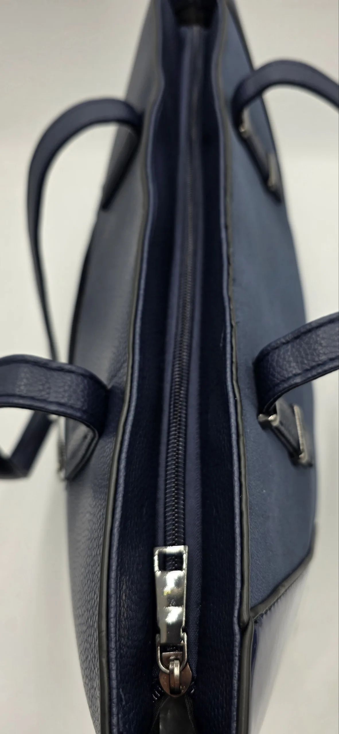 Твърда чанта от еко кожа с две дръжки 55см, външен джоб с цип, закопчаване с цип, вътре със средна преграда с цип, джоб с цип и допълнителни джобове за телефон, дълга регулираща се дръжка 150см, ширина 44см,височина 30см, дъно 32см/14см.