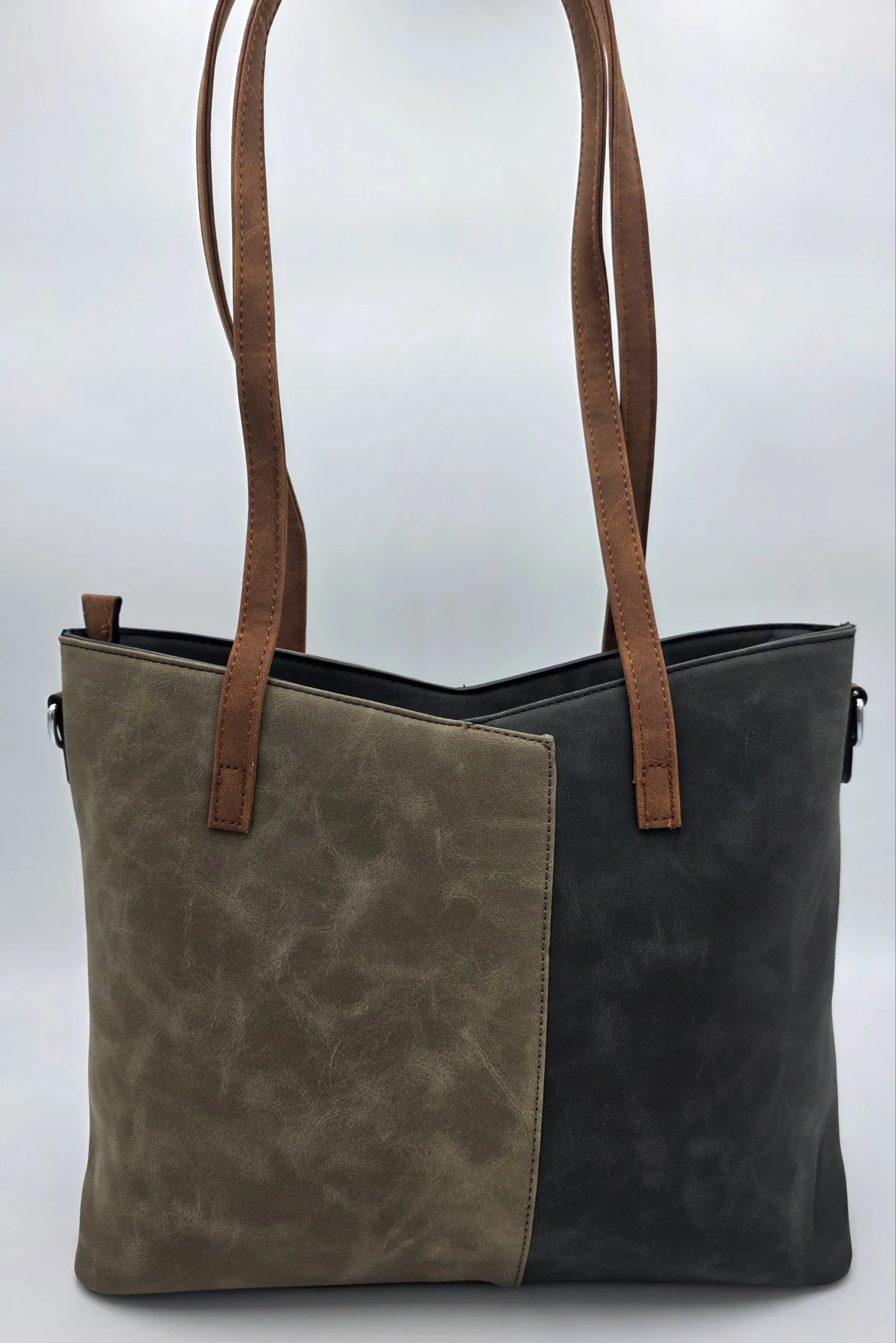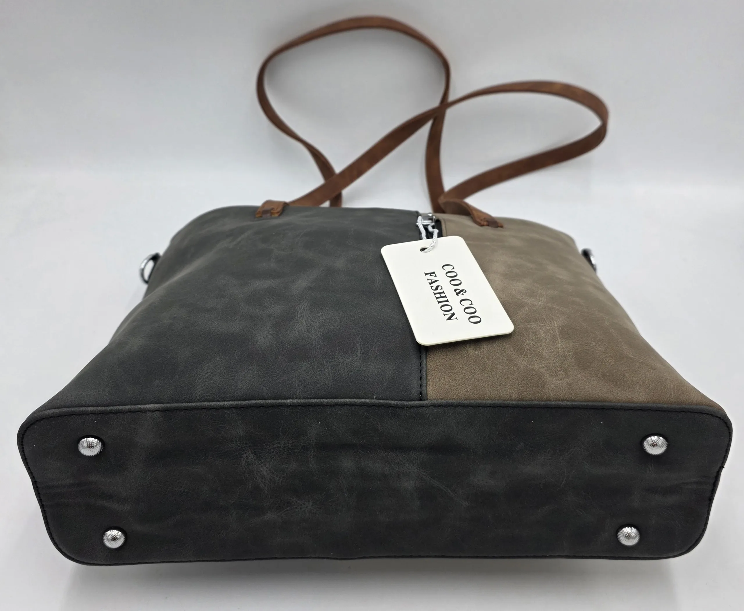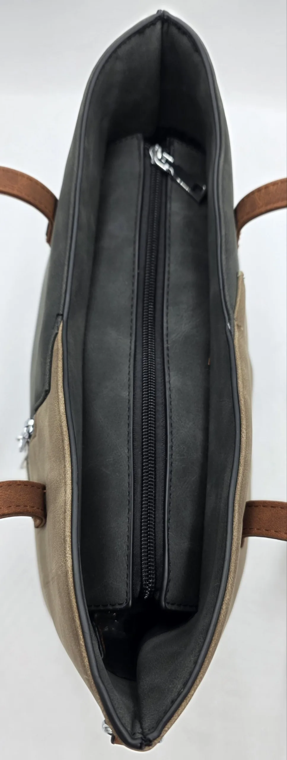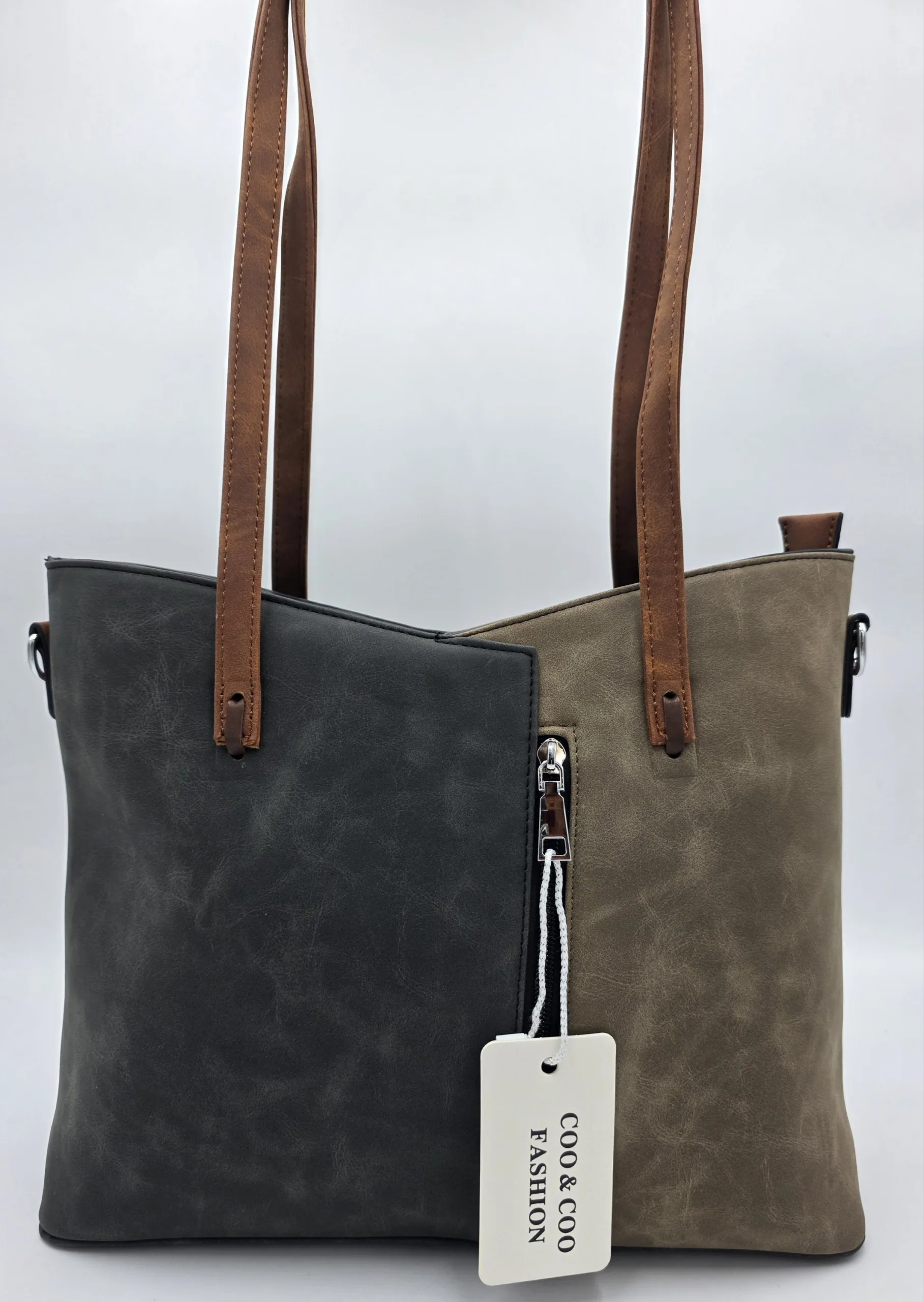 Чанта от еко кожа в два цвята, с две дръжки 82см,допълнителна дълга регулираща се дръжка 150см, преден външен джоб с цип, закопчаване с цип, вътре със средна преграда с цип, джоб с цип и допълнителни джобове за телефон. Ширина 38см, височина 28см,дъно 34см/11см.