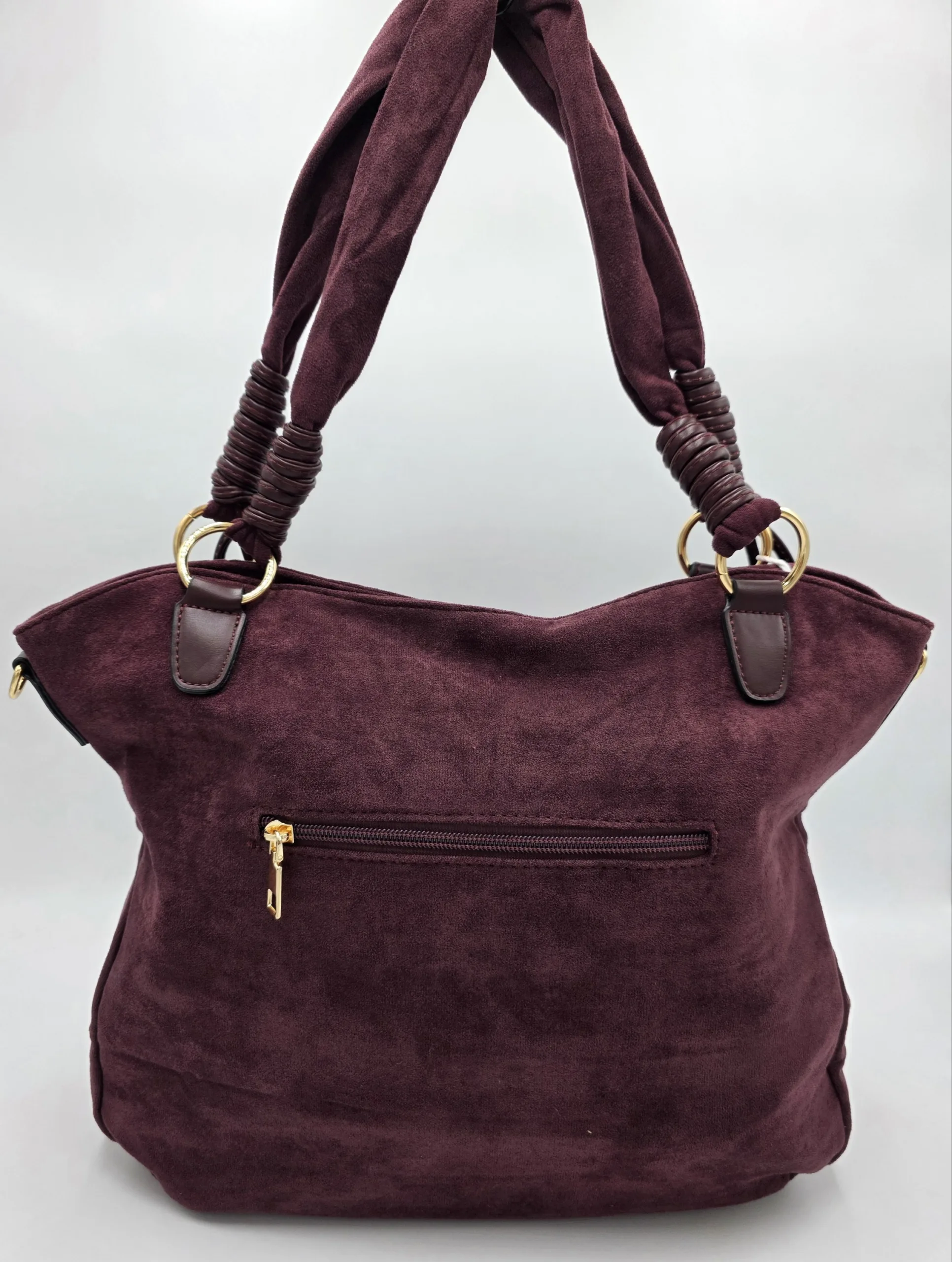 Голяма чанта от еко велур с две дръжки 57см,външен заден джоб с цип, закопчаване с цип, вътре със средна преграда с цип, джоб с цип и допълнителни джобове за телефон, допълнителна дълга регулираща се дръжка 150см. Ширина 42см,височина 32см,дъно 34см/12см.