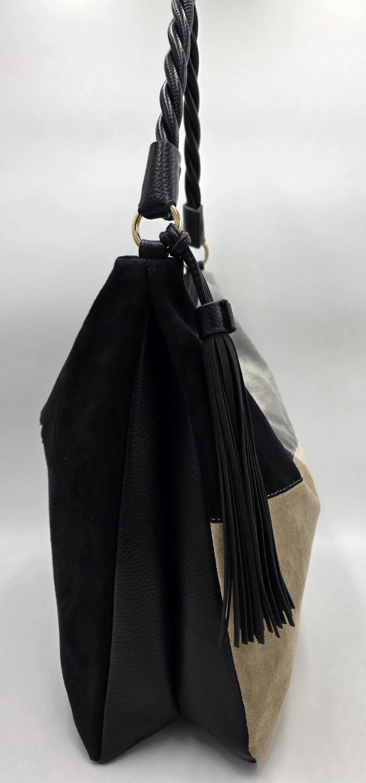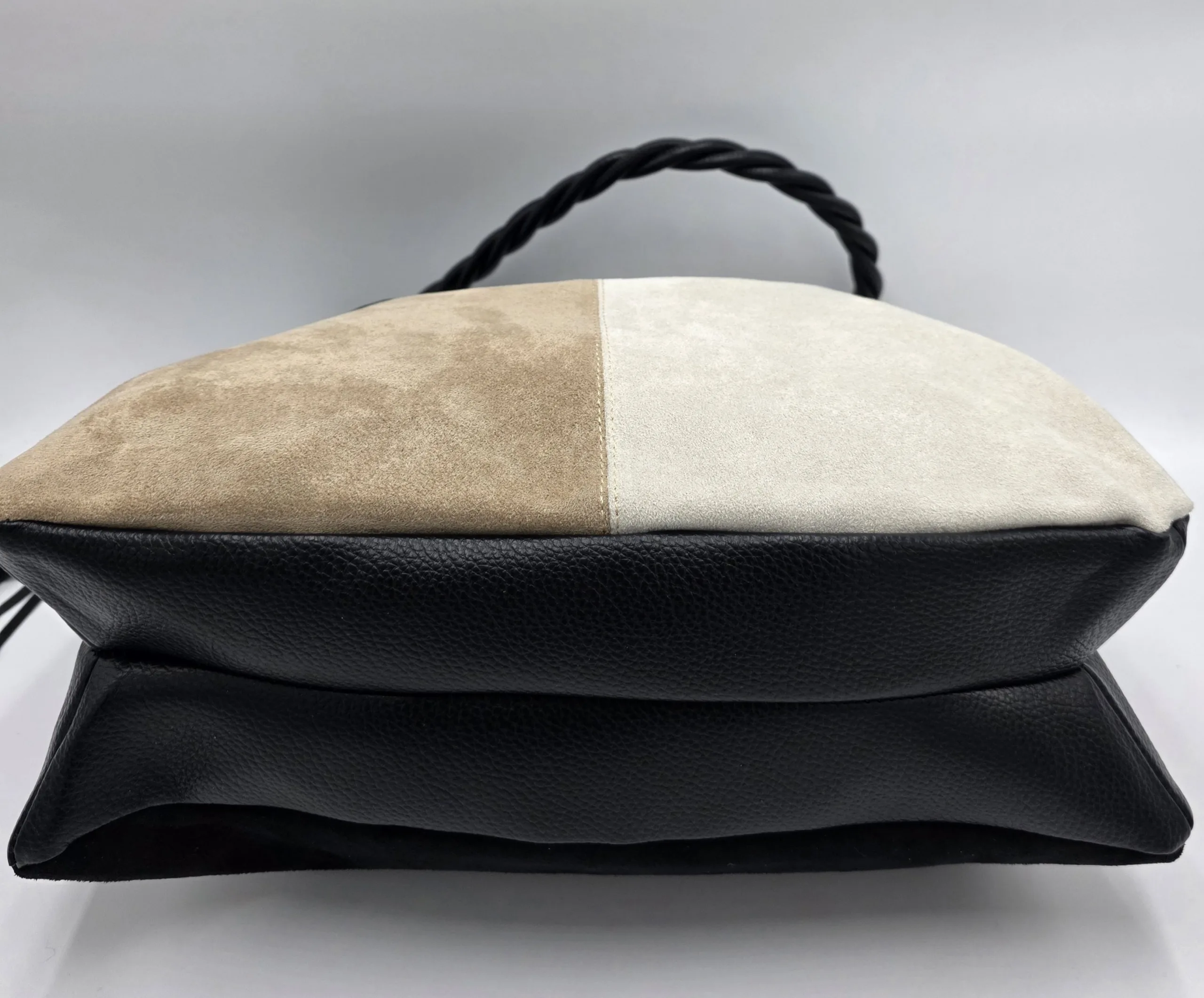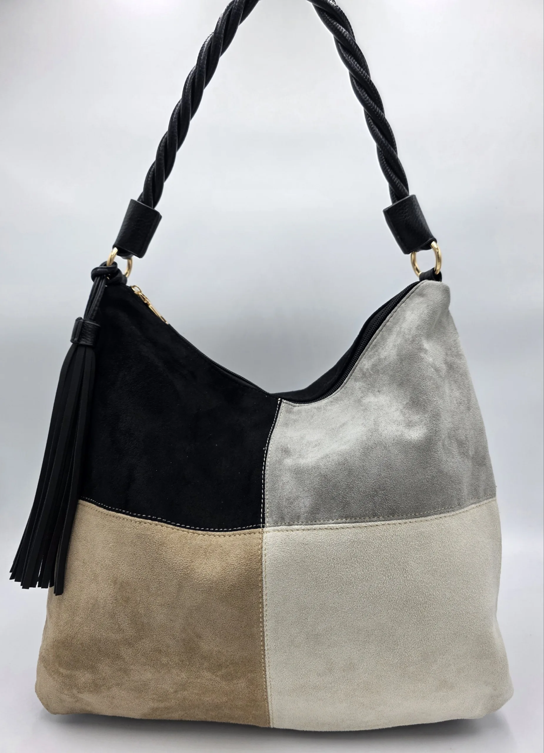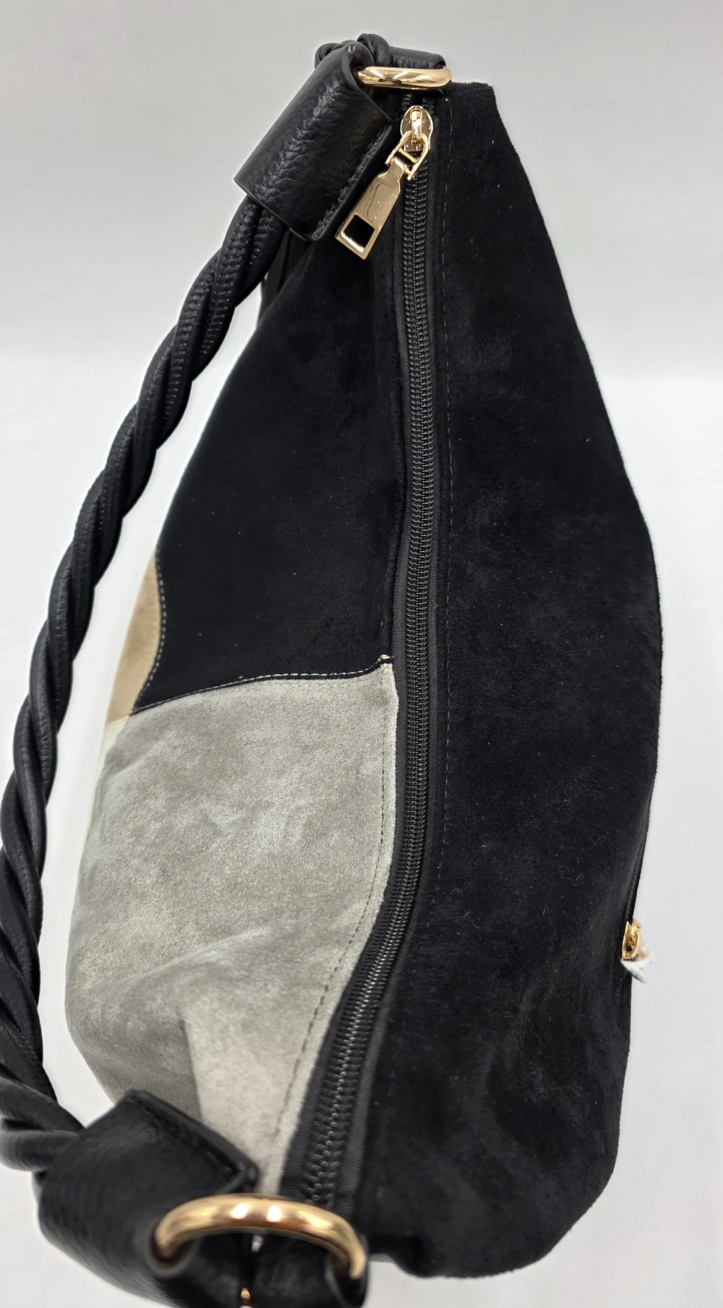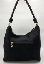 Чанта от еко велур с една дръжка 58см, допълнителна дълга регулираща се дръжка 150см, външен заден джоб с цип, закопчаване с цип, вътре със прикачена преграда с цип към задната част, джоб с цип, допълнителни джобове за телефон, ширина 37см,височина 35см,без оформено дъно.